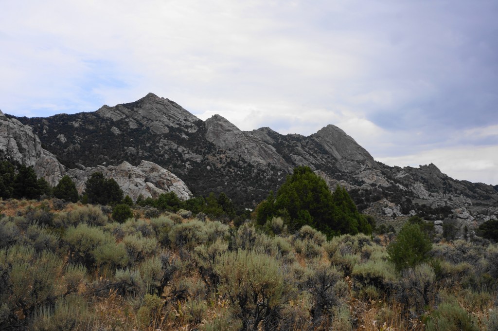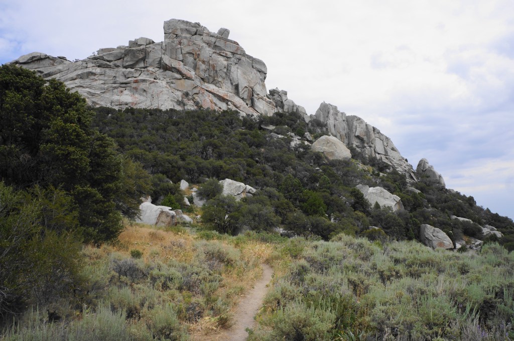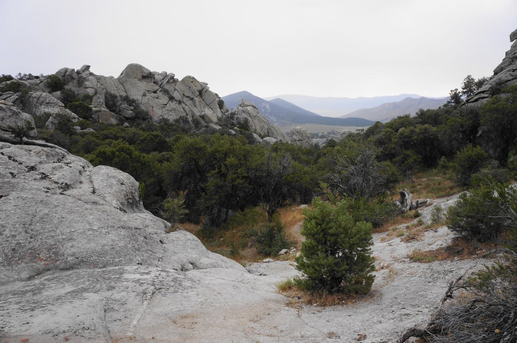 Head right, then left at the next turn seconds later, continuing northward. After passing the “Animal Cracker” routes on the right, the trail makes a final sustained climb, ascending a drainage with views back over the City of Rocks to Steinfells Dome and Smoky Mountain.