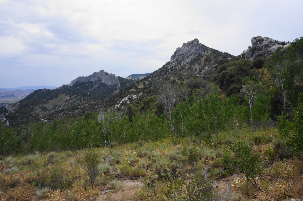 At around 0.85 miles, the trail levels off, passing through a stand of aspens and approaching a sunny gap and a wooden fence. Although cows can often be seen grazing beyond, hikers are not leaving the park. Yet the landscape changes dramatically: after passing through a gate, the rock outcrops mostly disappear from view and give way instead to a largely featureless scrub, with the Albion Mountains rising higher beyond. The mostly tree-less ridge to the north leads up to Indian Grove, while the higher mountain to the right is Graham Peak (8,867’), the highest point in the park. Beyond is the vast expanse of Sawtooth National Forest.
