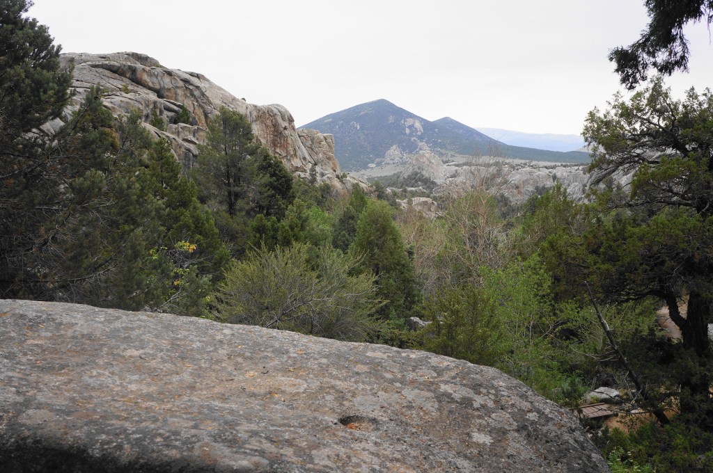 Soon the uphill path rises to a higher gap on the right but does not pass through it; instead it leads into a series of switchbacks, climbing steadily to loftier heights. The City of Rocks unfolds in the valley below—a speckled landscape bounded to the north by Granite Peak (7,689’) and Steinfells Dome (7,359’), which will be touchstones for much of the hike. Hikers can also begin to see south—past the bulking mass in the foreground—to the Twin Sisters area, the other major rock concentration in the reserve.