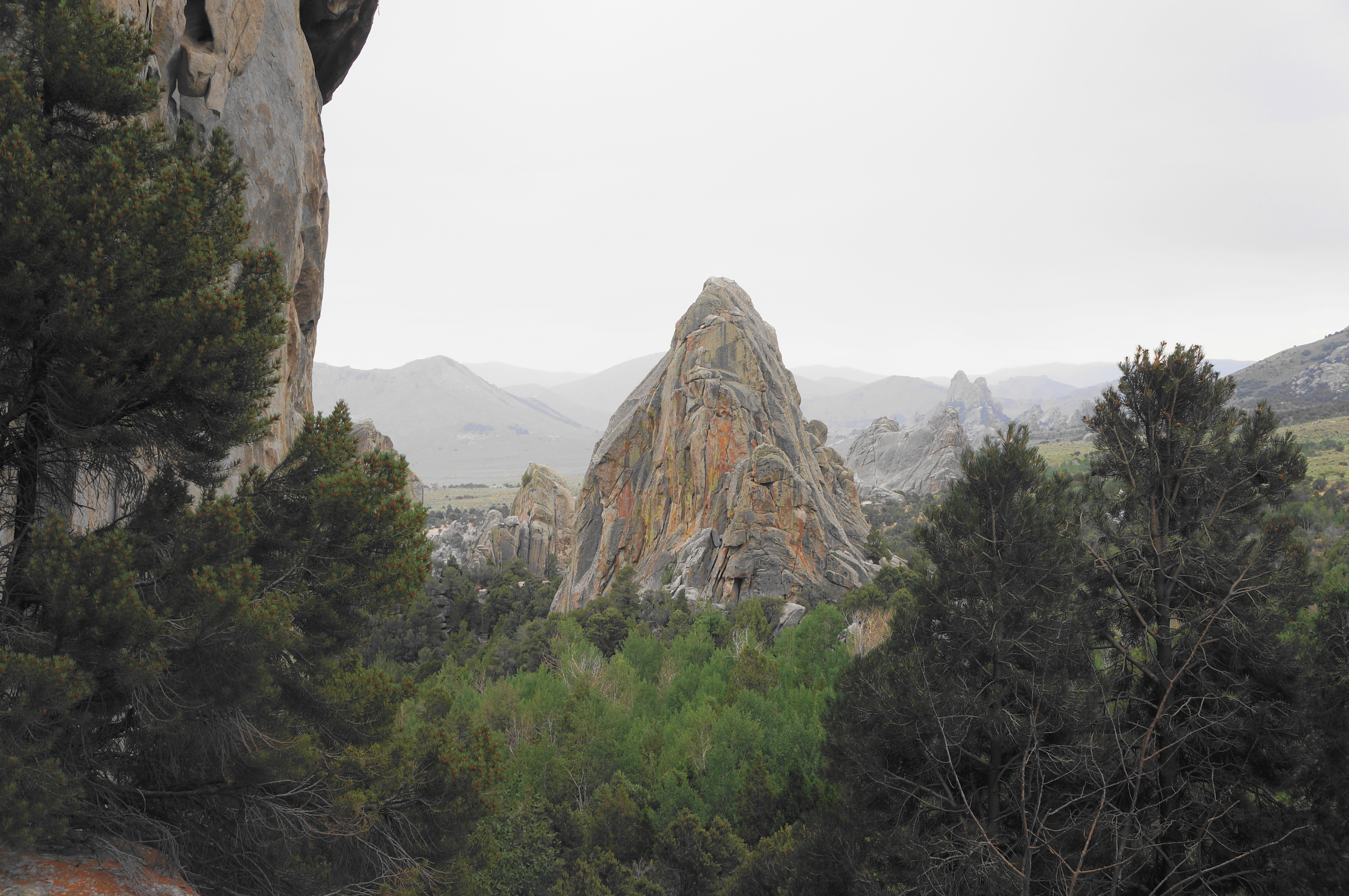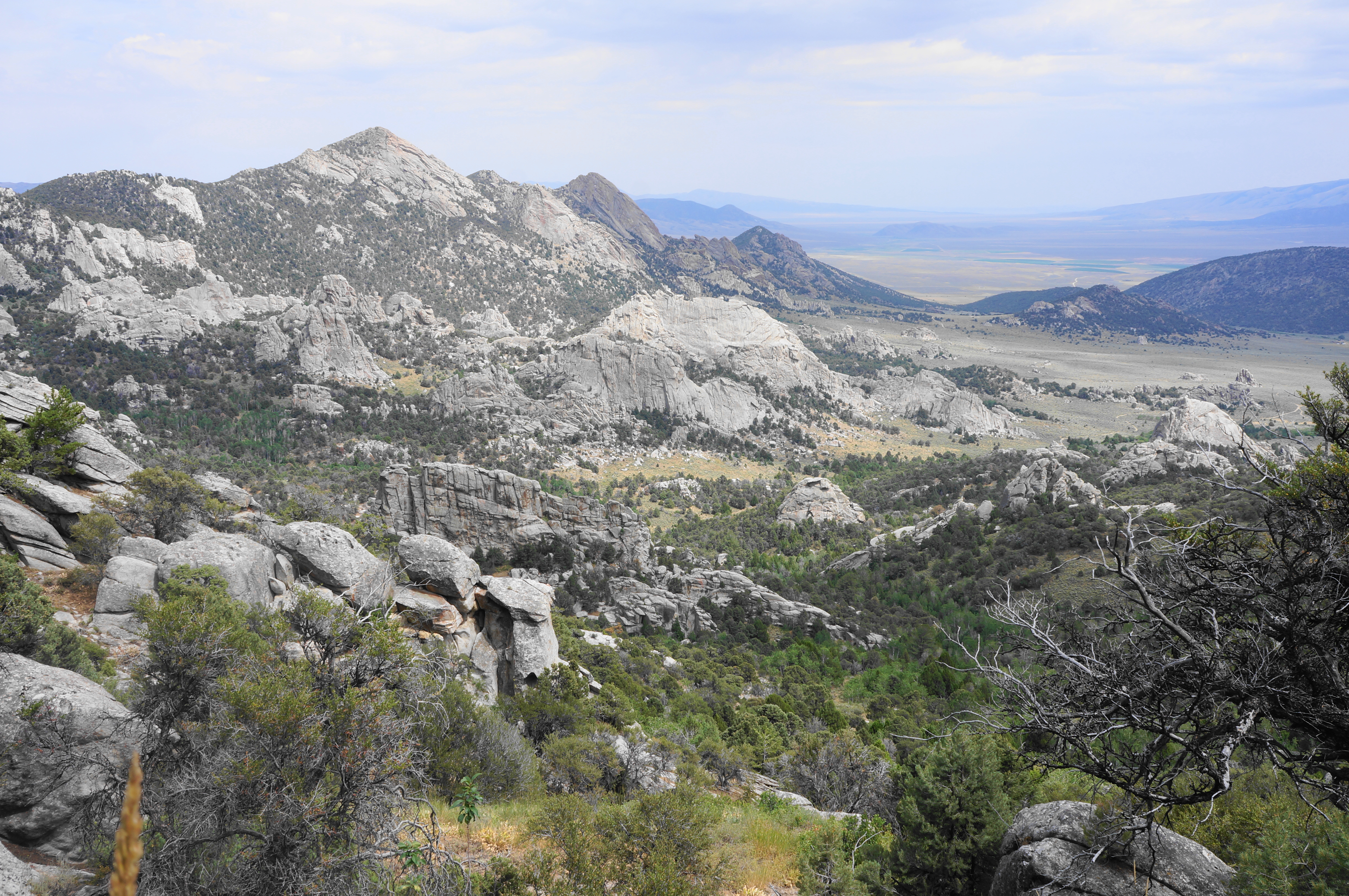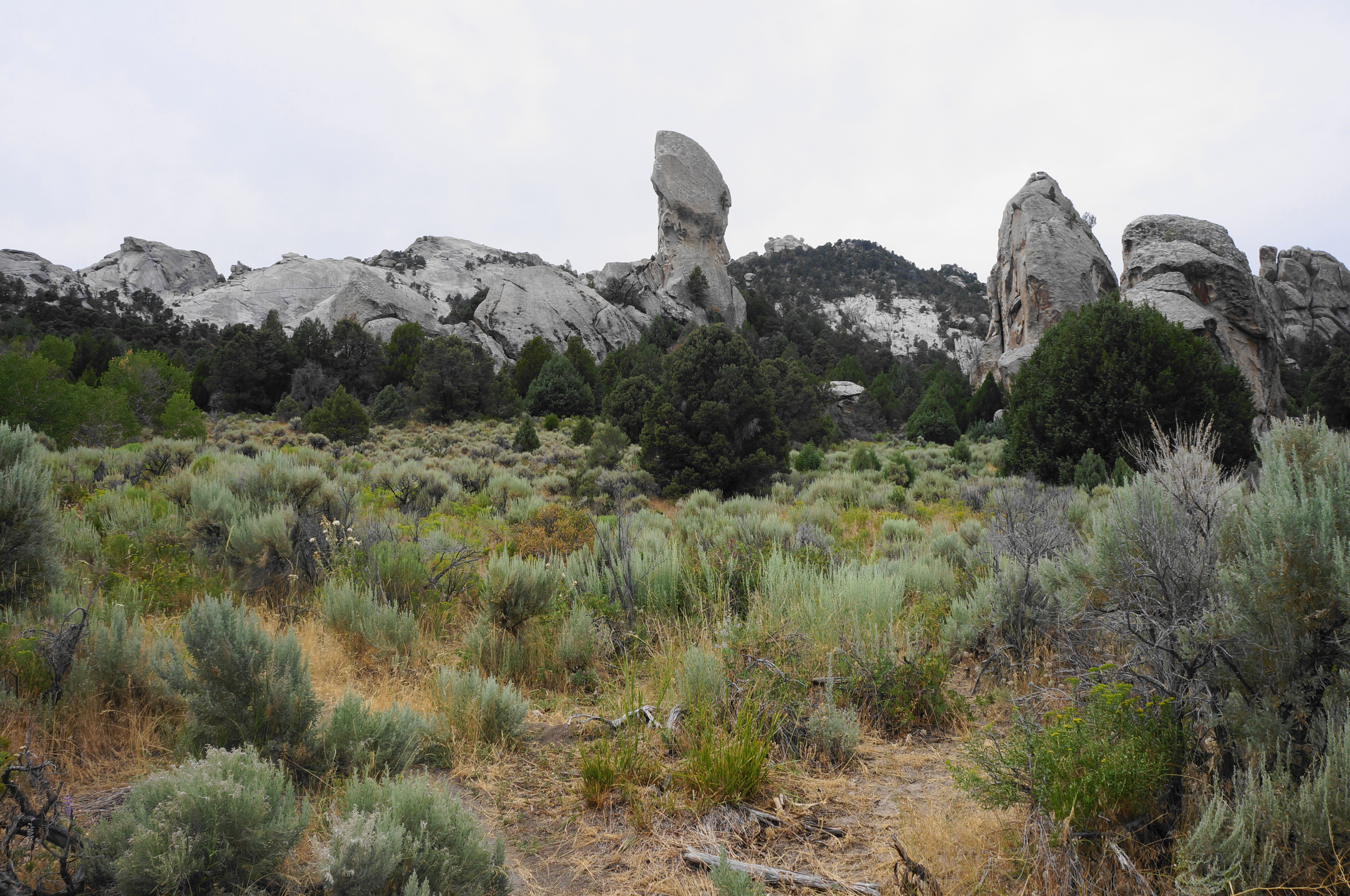 Head right, then left at the next turn seconds later, continuing northward. After passing the “Animal Cracker” routes on the right, the trail makes a final sustained climb, ascending a drainage with views back over the City of Rocks to Steinfells Dome and Smoky Mountain.