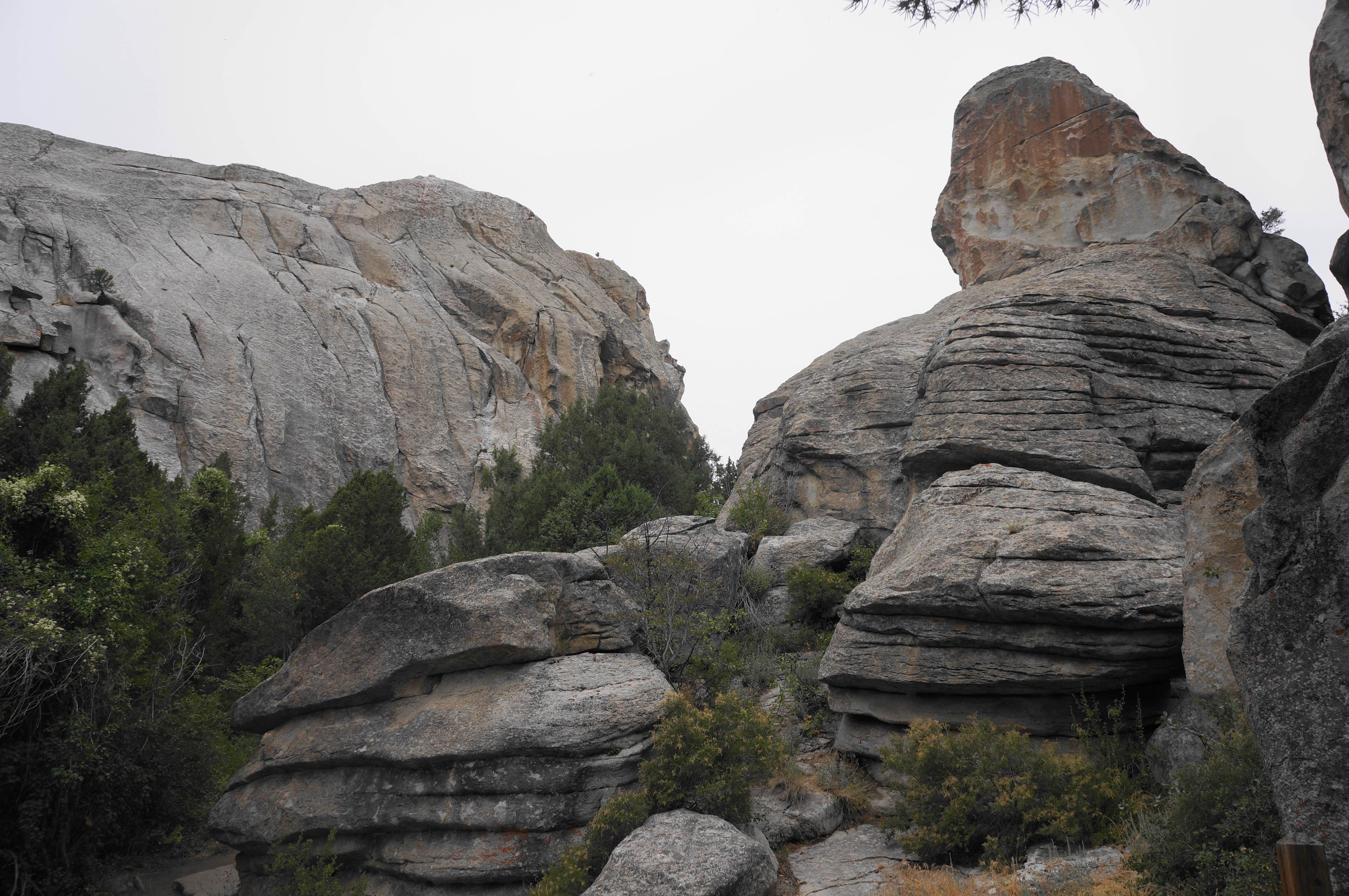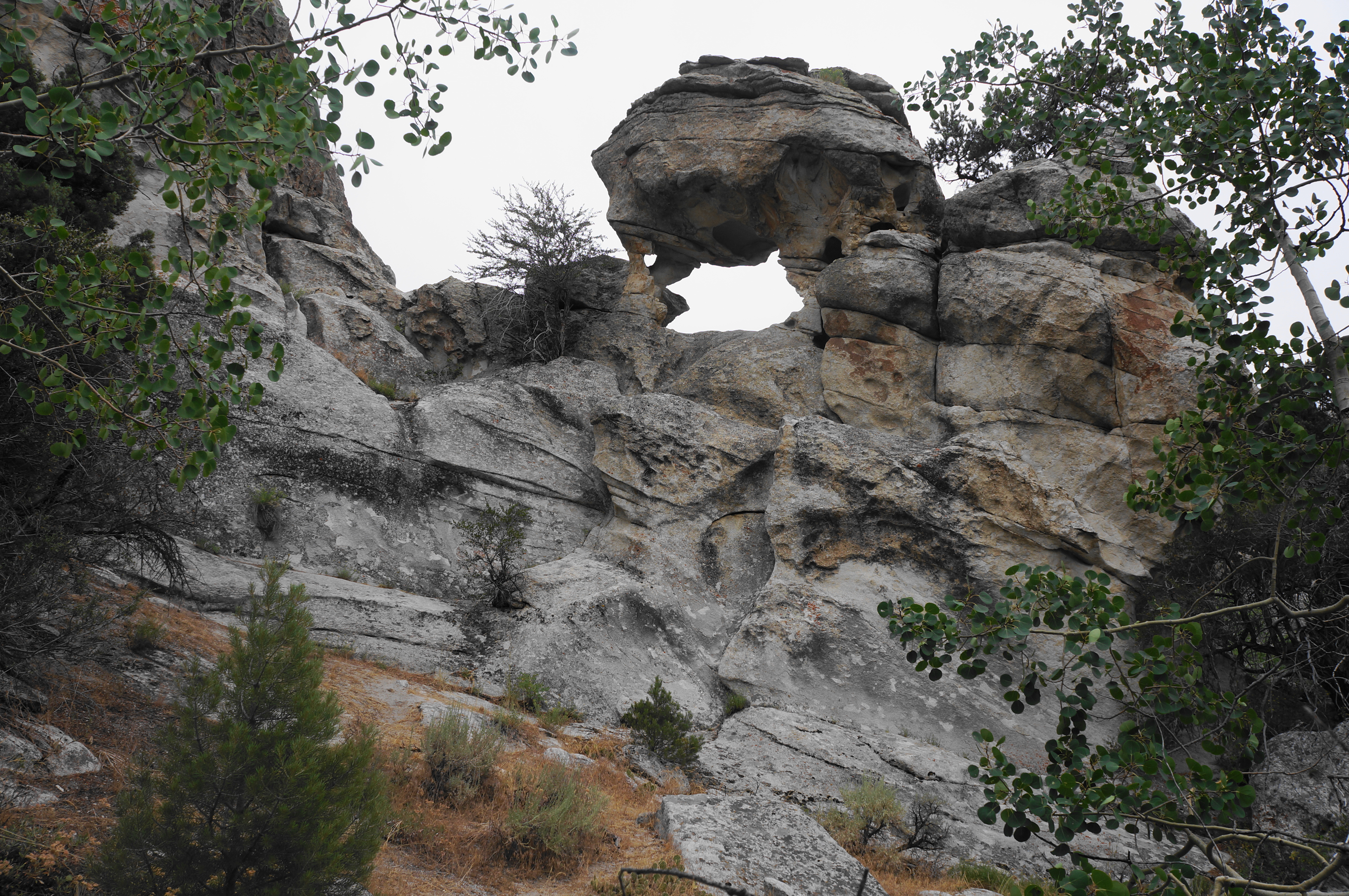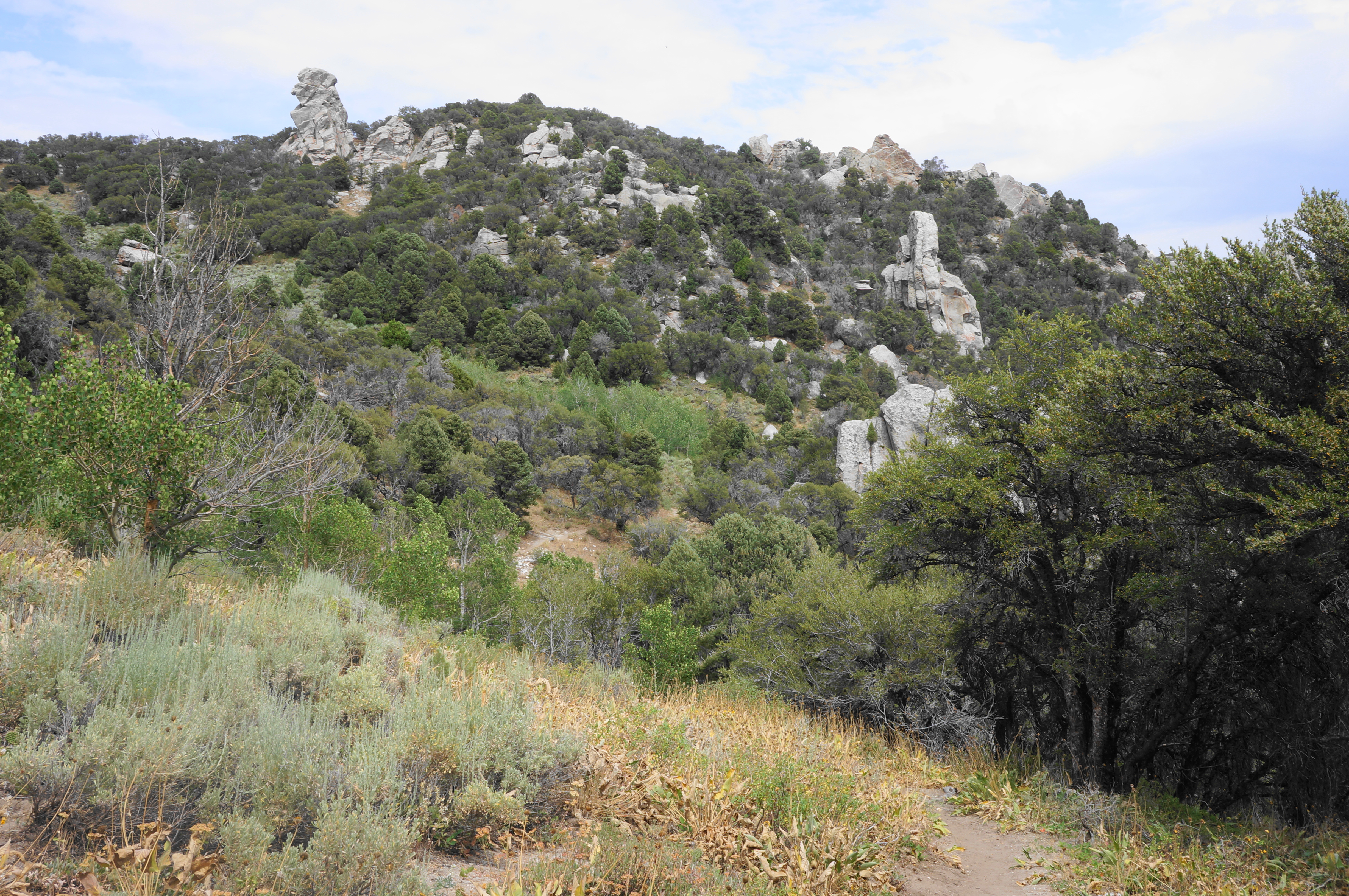 By now hikers are back in the thick of the City of Rocks, and the South Fork Trail (ak.a. South Fork Circle Creek Trail, or S.F.C.C.) cuts a winding passage through the heart of “the city,” gaining more than 600 feet in elevation en route back to the start of the loop. Bear right on the trail, quickly passing a spur on the right to the Slabbage pitches, in addition to a small natural arch that is worth the couple-dozen yard detour to view.