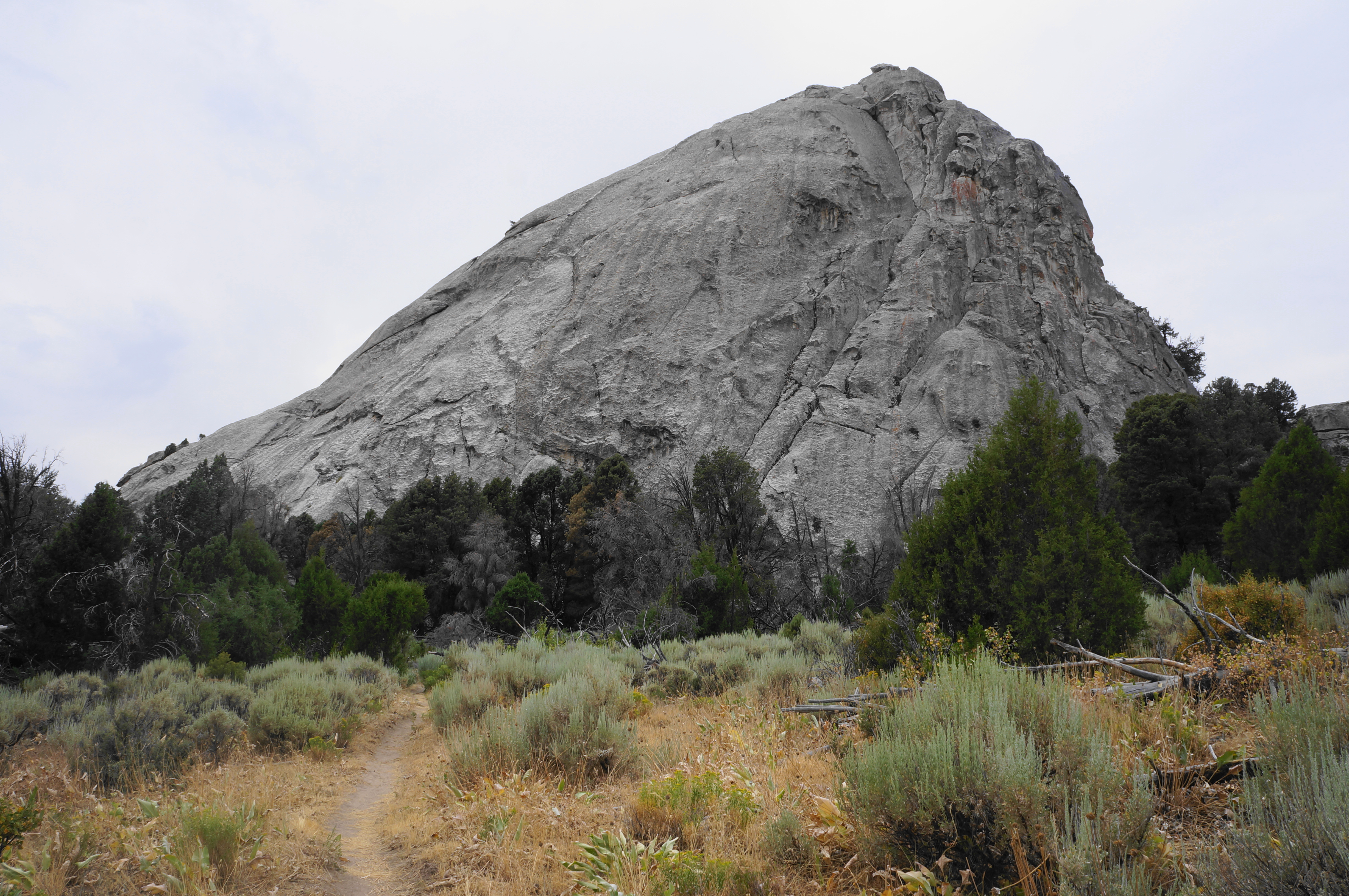 The Almo pluton comprise the bulk of the rock formations, which start to come into focus as the unpaved City of Rocks Road enters the park, following the old trace of the California Trail, used by pioneers in the mid-19th century. As one can imagine, the cluster of jagged rocks represented both a considerable obstacle and spectacle for such travelers—emigrants left their mark at a series of trail registers, carving their names into the rock or painting them with axle grease.