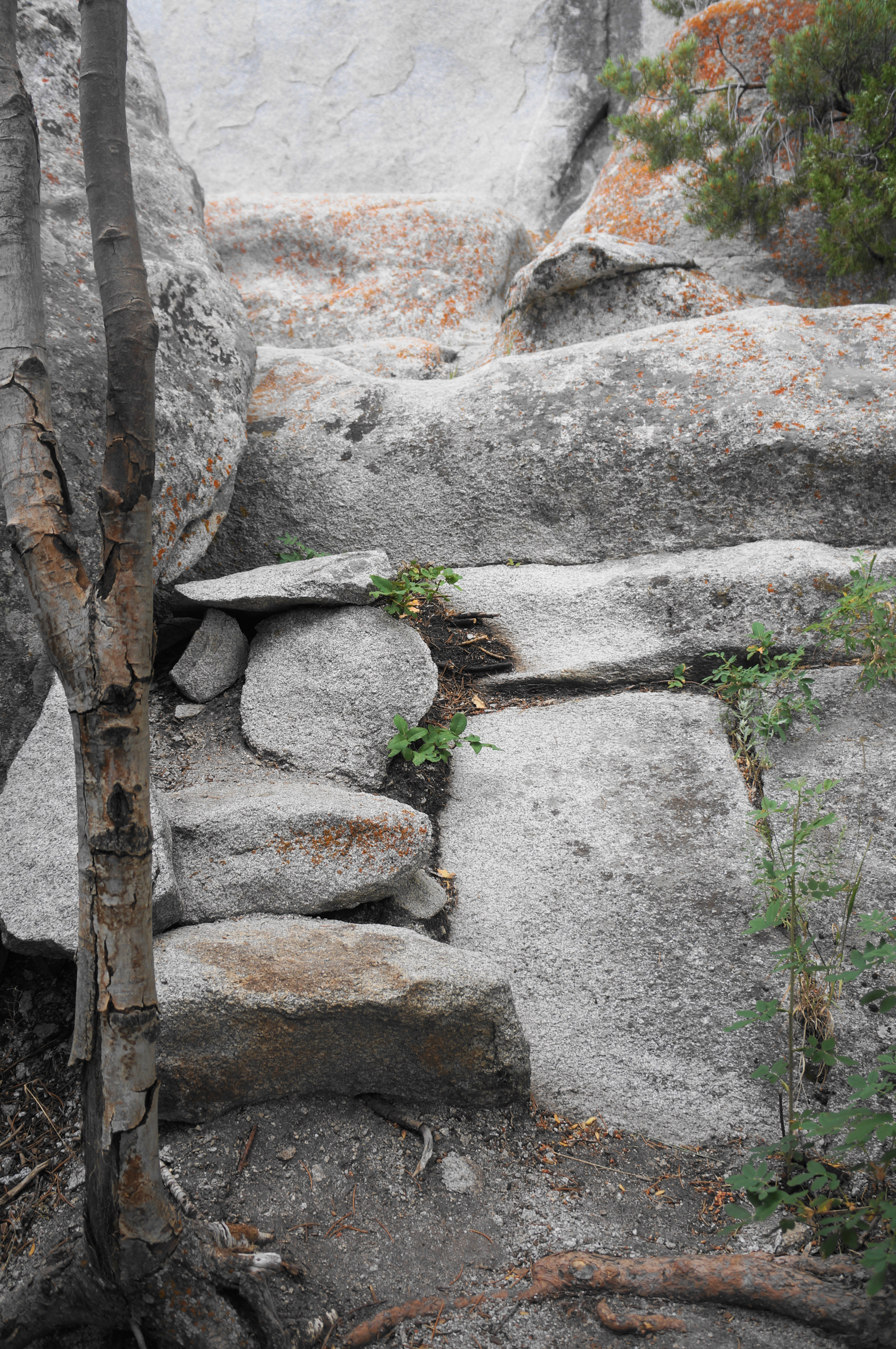 Pass Lady J on the right, then continue south on the Bumblie Trail to crest a higher hill. Pass through a gate, then follow a relatively granite-free saddle where the onward route becomes harder to follow. At one point, just as hikers start to get a further look south down to the South Fork drainage, the path appears to split, with a well-defined track continuing to skirt the ridgeline to the left and a less-trodden path bearing right, dropping down a minor ravine. Counterintuitively, the correct route is to stay right on the fainter path, as the deceptive alternative eventually sputters out amid a set of cliffs and ledges.