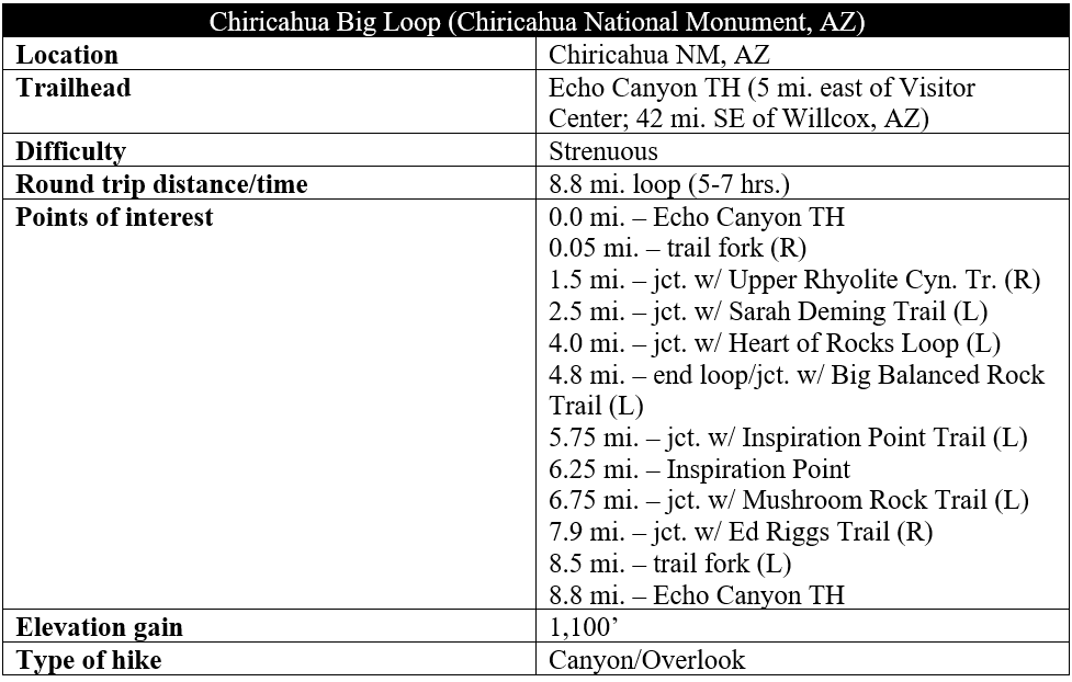 I’m a big fan of Chiricahua NM. I feel like I’ve done the Big Loop. (In fact, my blog suggests that I have. It mentions 9 miles: https://daringdayhikes.home.blog/2018/12/30/chiricahua-heart-of-rocks/ .) However, I don’t remember the Echo Canyon Grottoes. Guess it’s time to go back. Thanks!