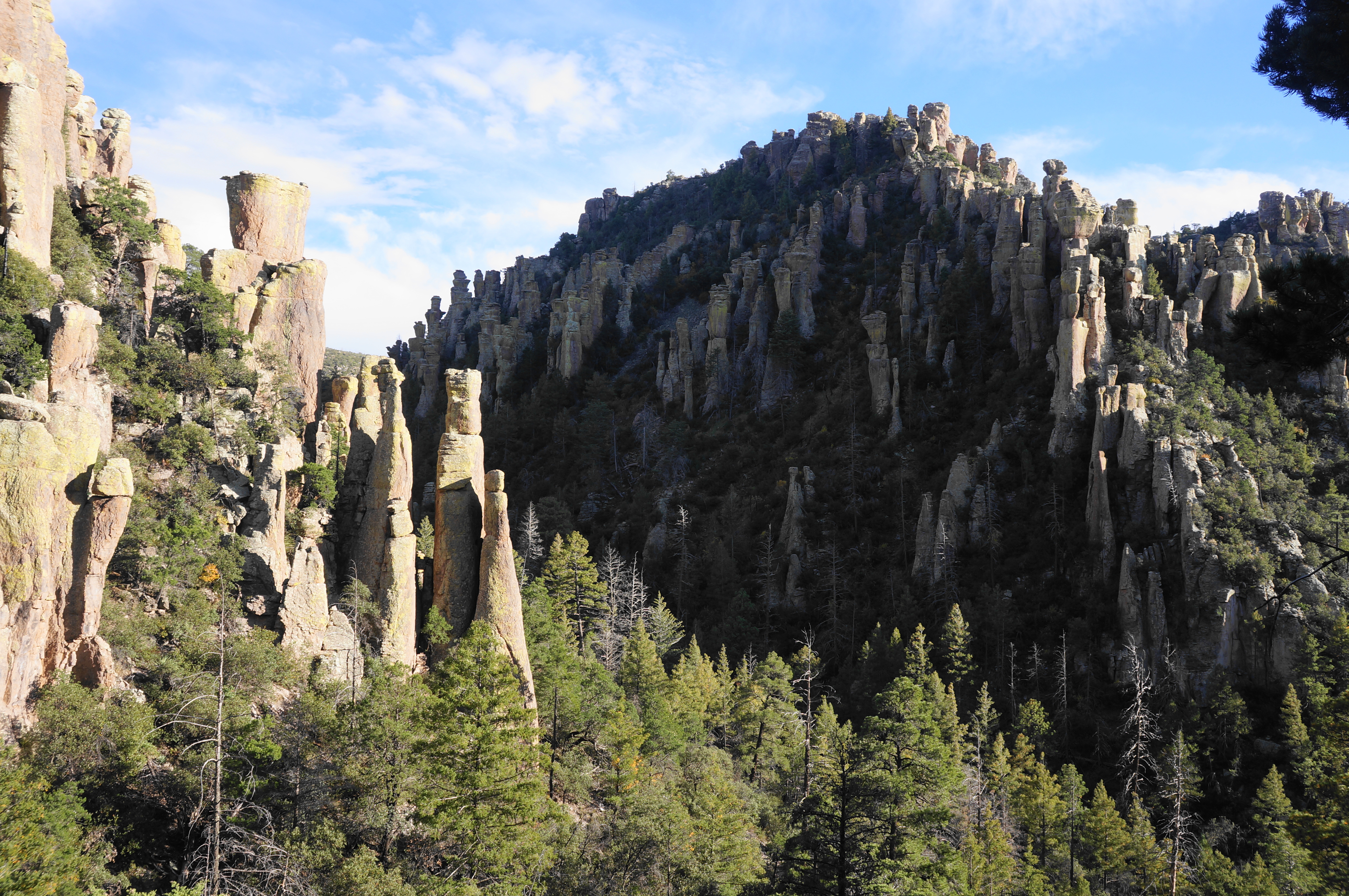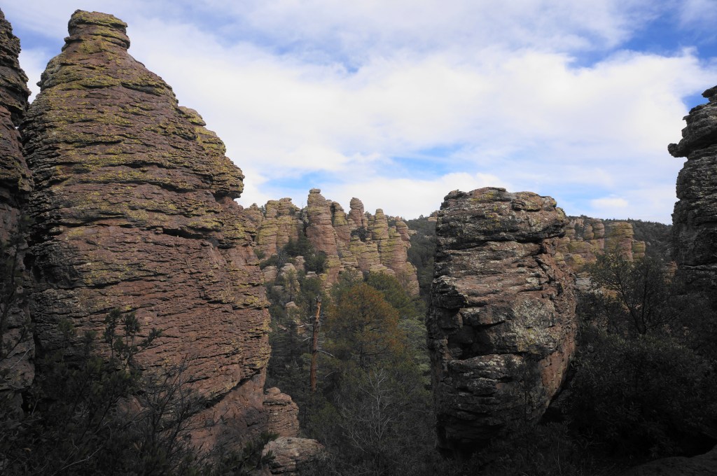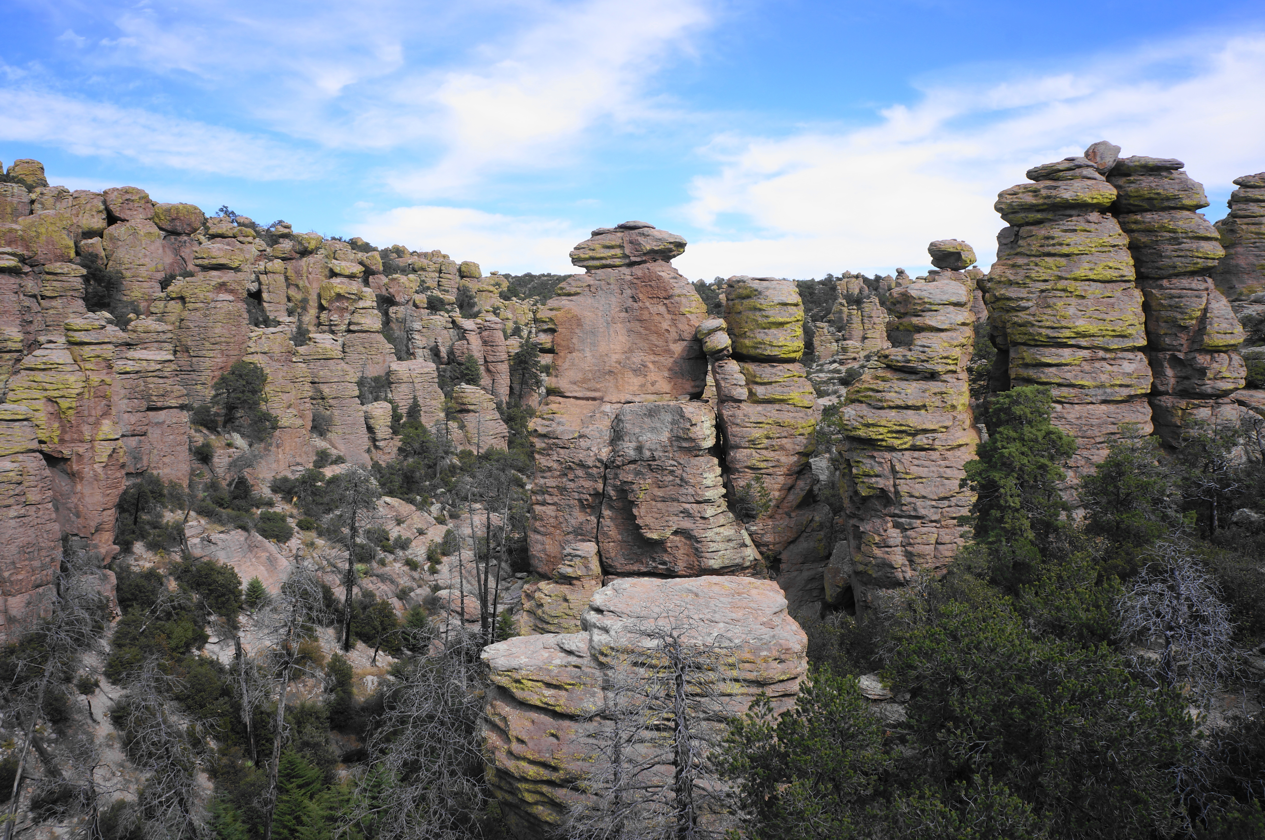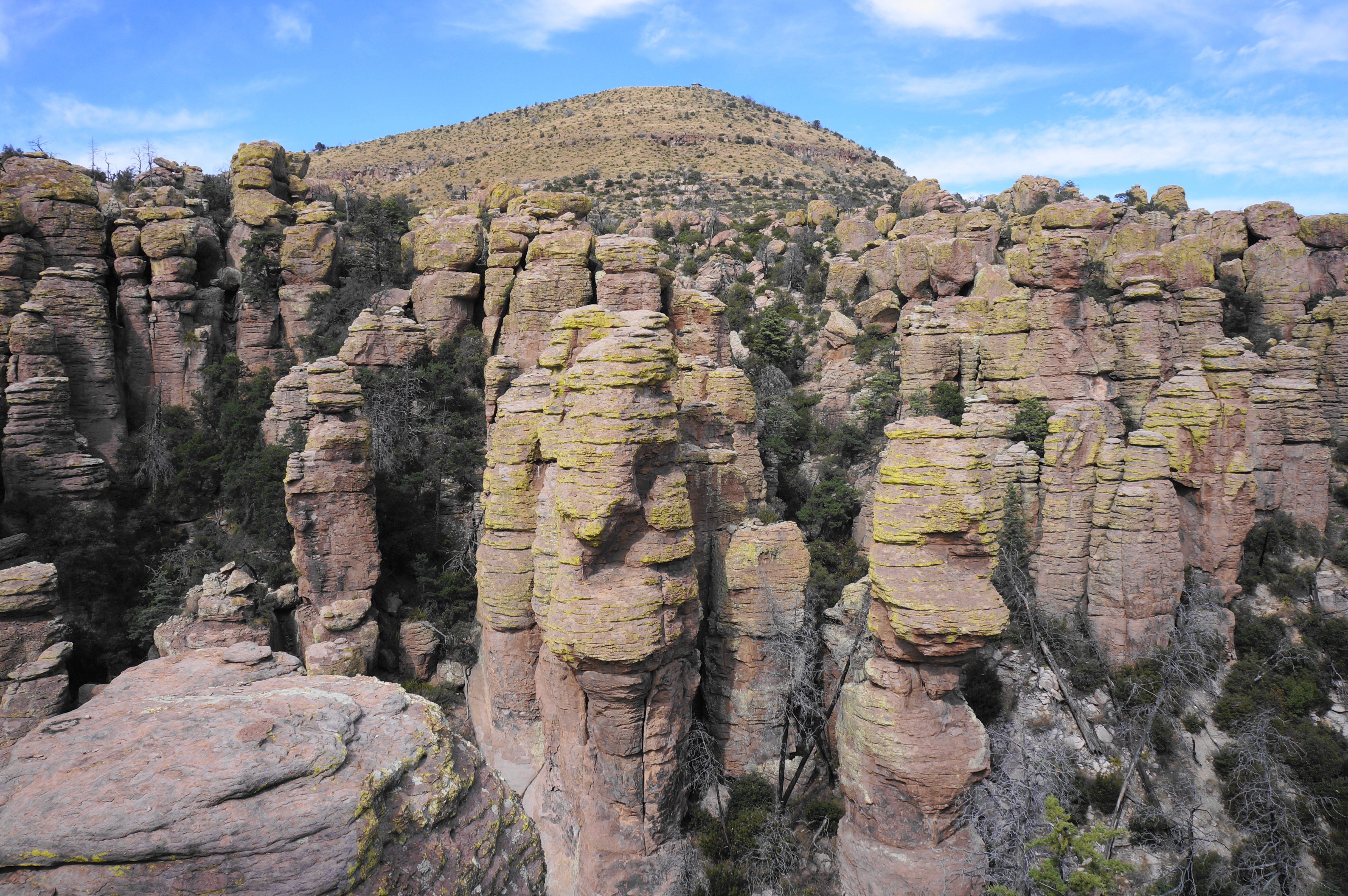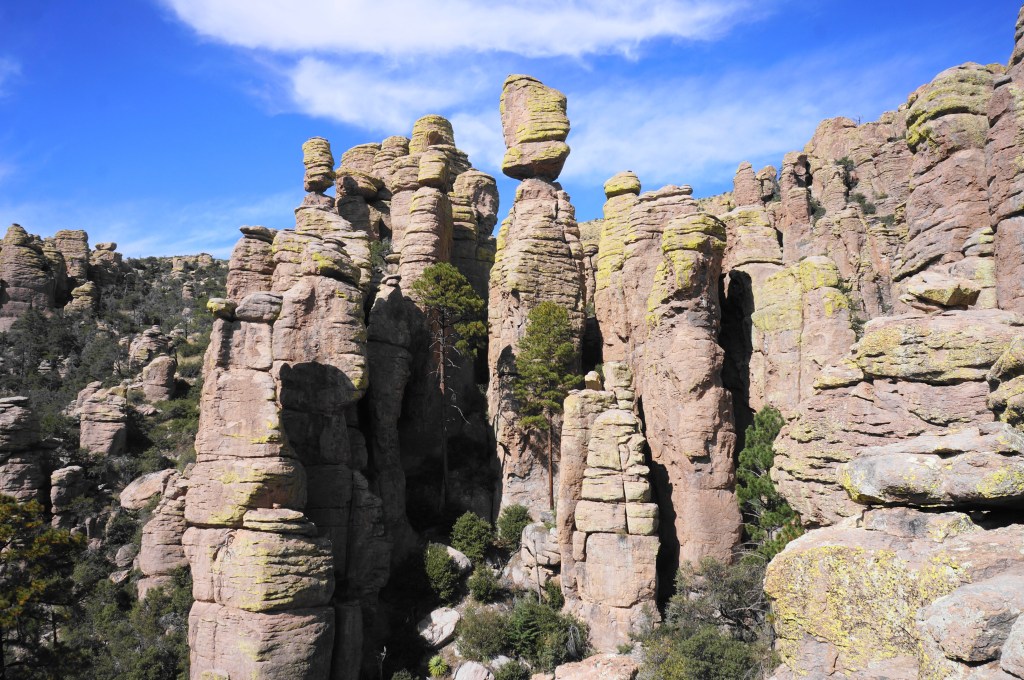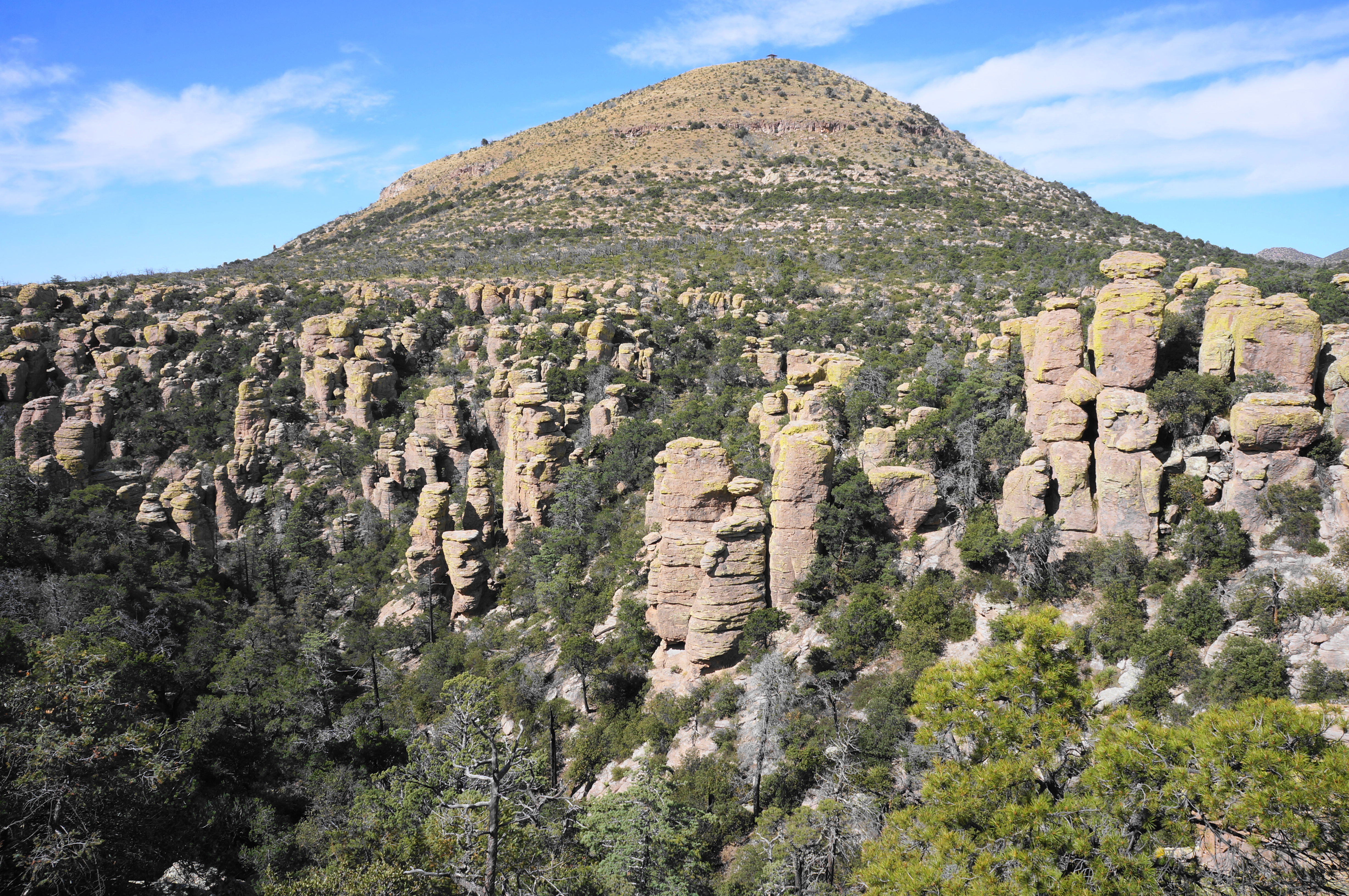 As one approaches the Chiricahuas, however, visitors quickly realize that this is no usual mountain range. Rather, the opening of Bonita Canyon—which offers passage into the park—is lined with tall sides dotted with colorful rhyolite, a volcanic rock layer thought to have been deposited around 27 million years ago. The volcanic eruptions left behind a caldera, and the rhyolite tuff has since eroded into wild shapes, with the largely concentration situated at the heads of Bonita and Rhyolite Canyons.