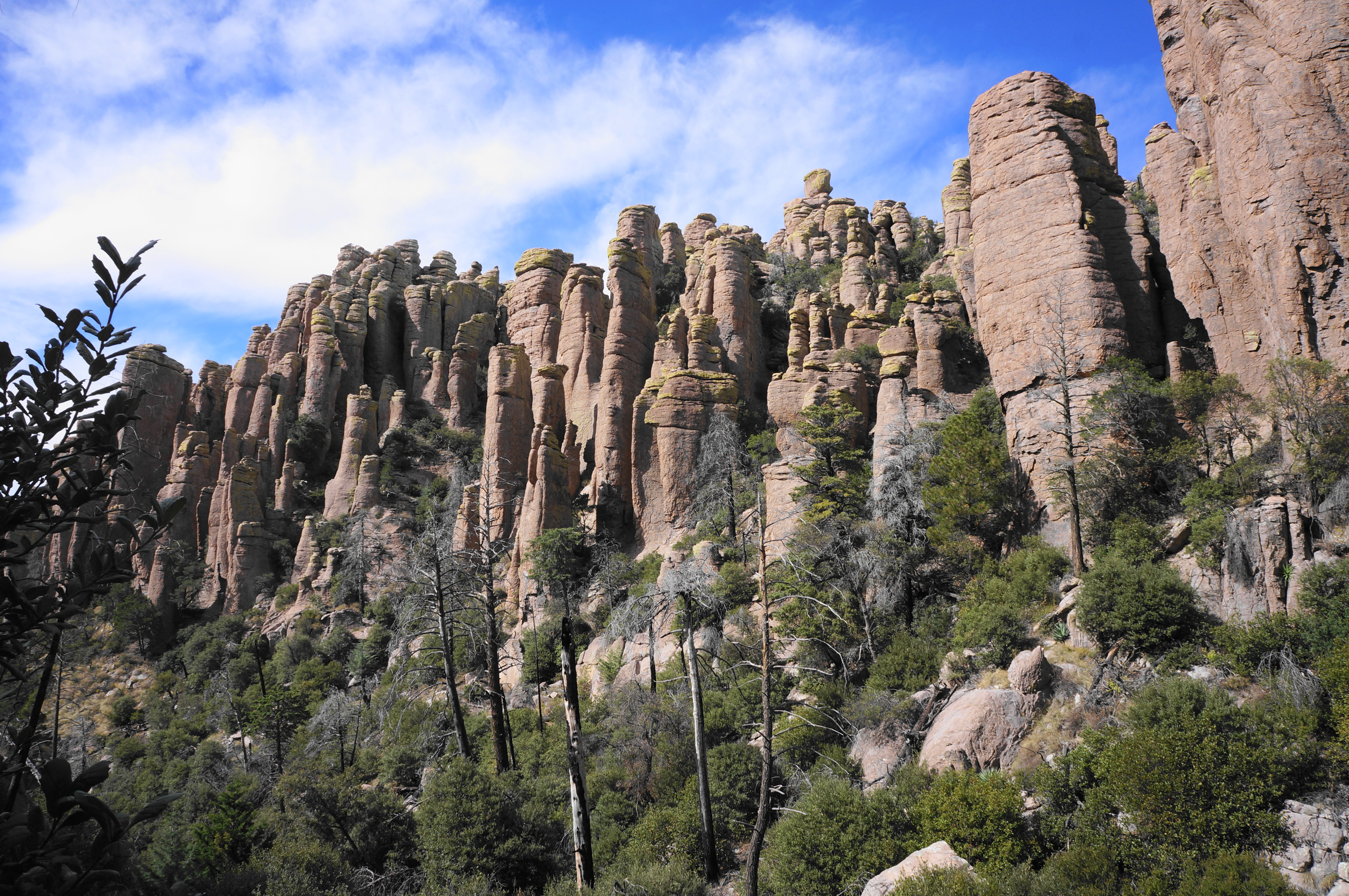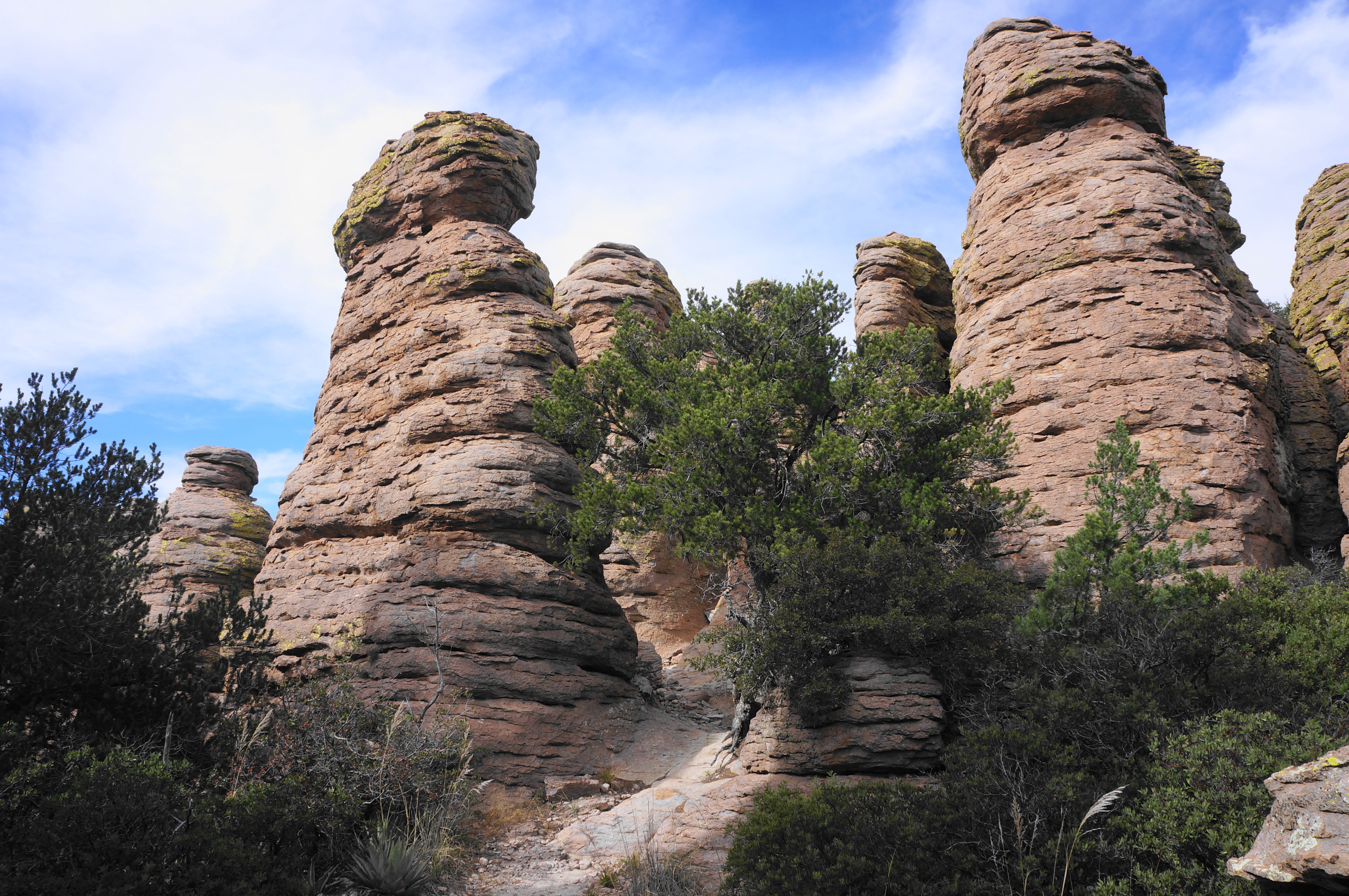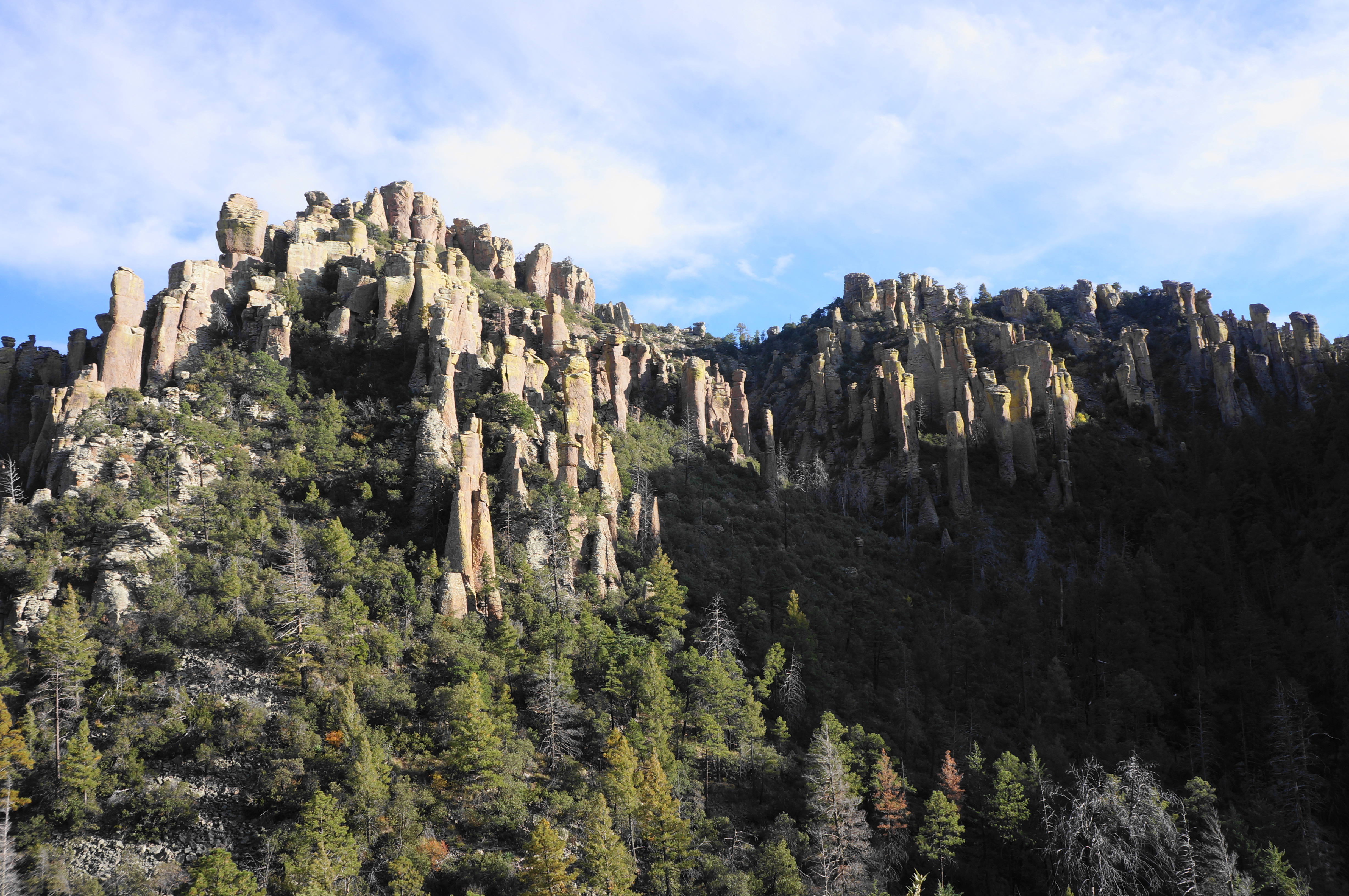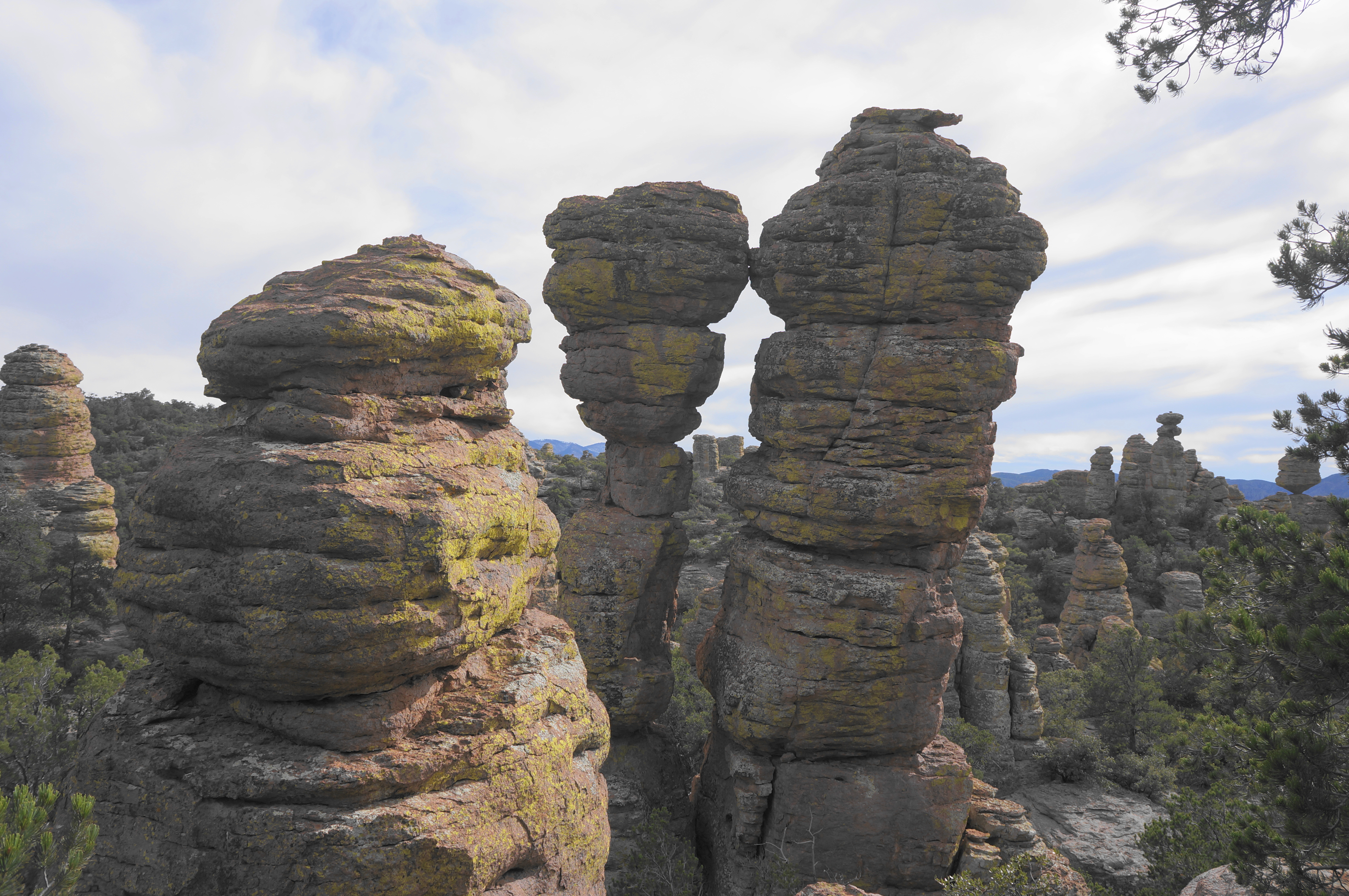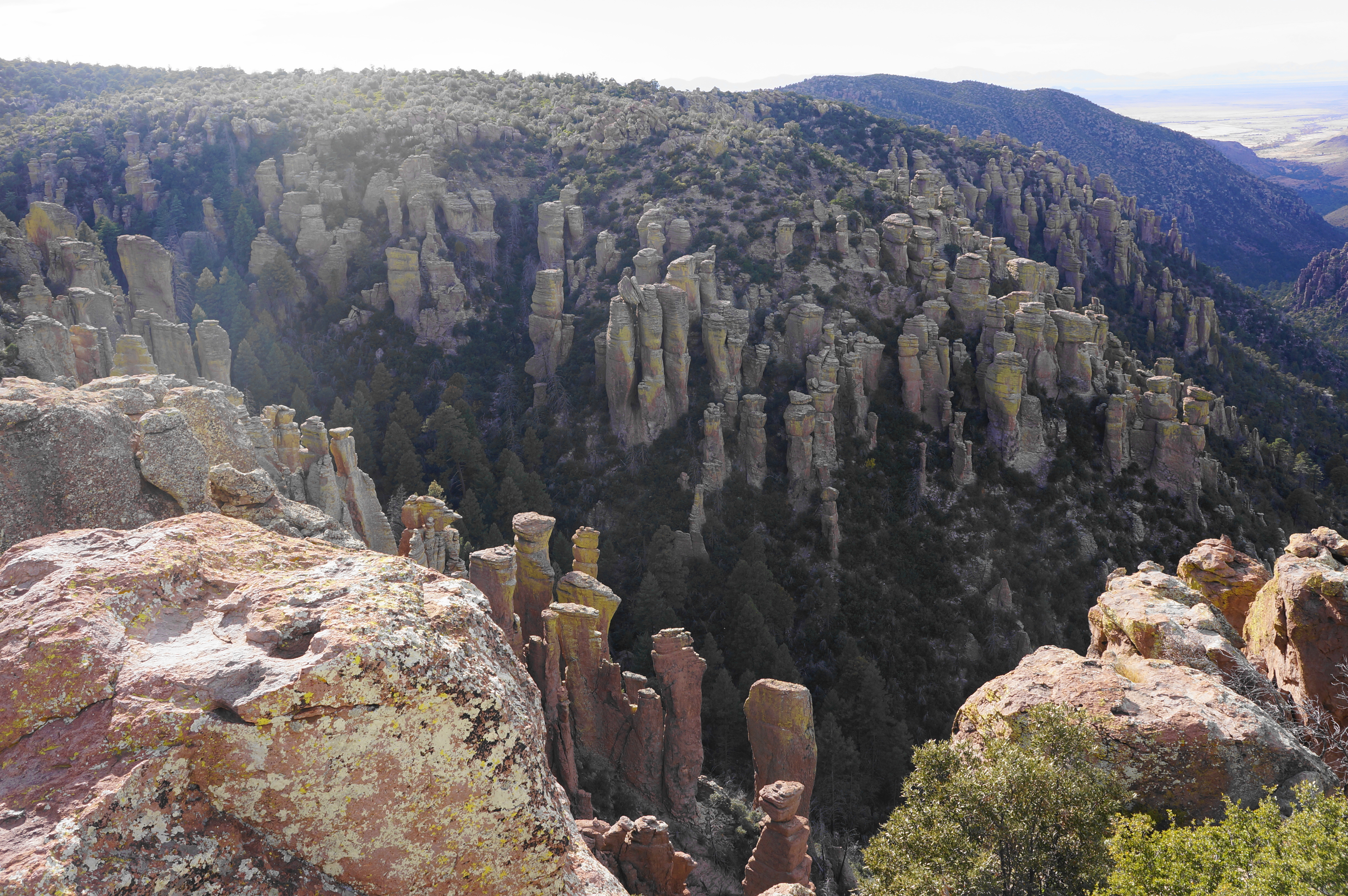 As one approaches the Chiricahuas, however, visitors quickly realize that this is no usual mountain range. Rather, the opening of Bonita Canyon—which offers passage into the park—is lined with tall sides dotted with colorful rhyolite, a volcanic rock layer thought to have been deposited around 27 million years ago. The volcanic eruptions left behind a caldera, and the rhyolite tuff has since eroded into wild shapes, with the largely concentration situated at the heads of Bonita and Rhyolite Canyons.