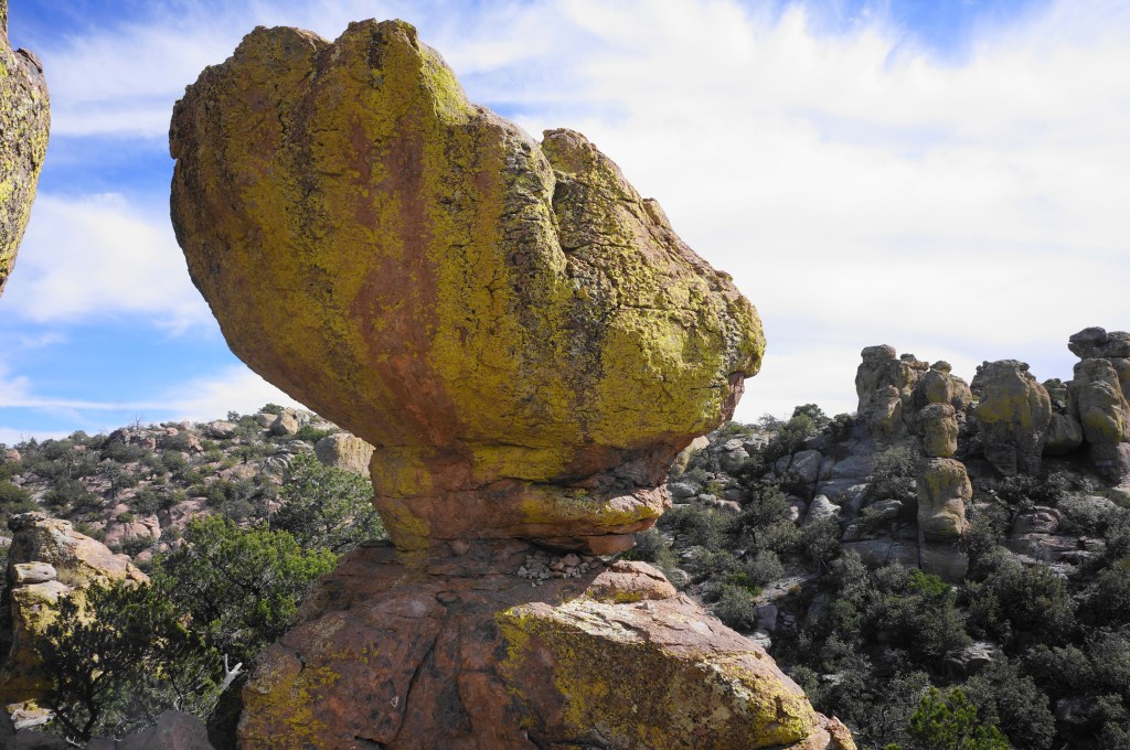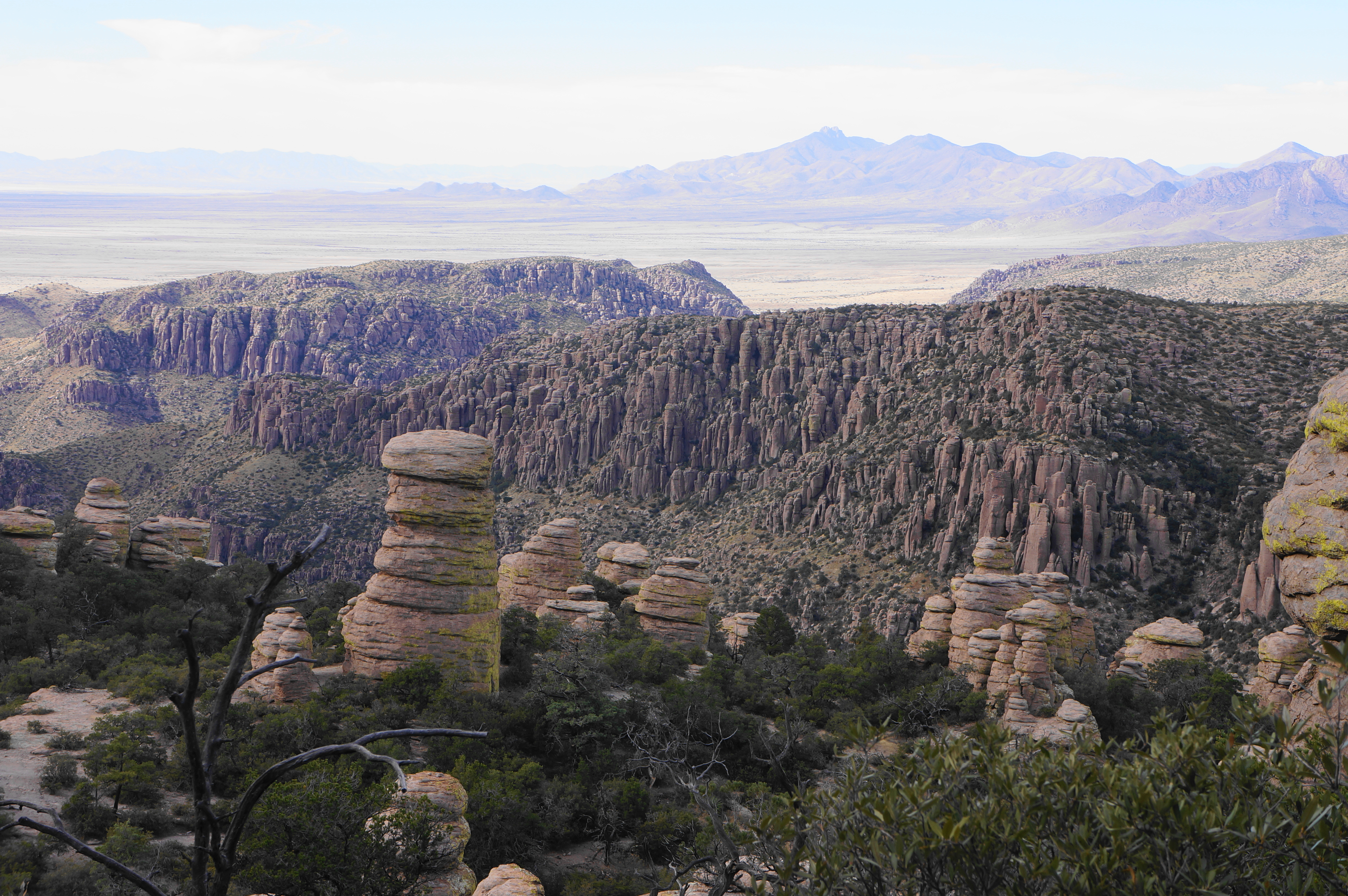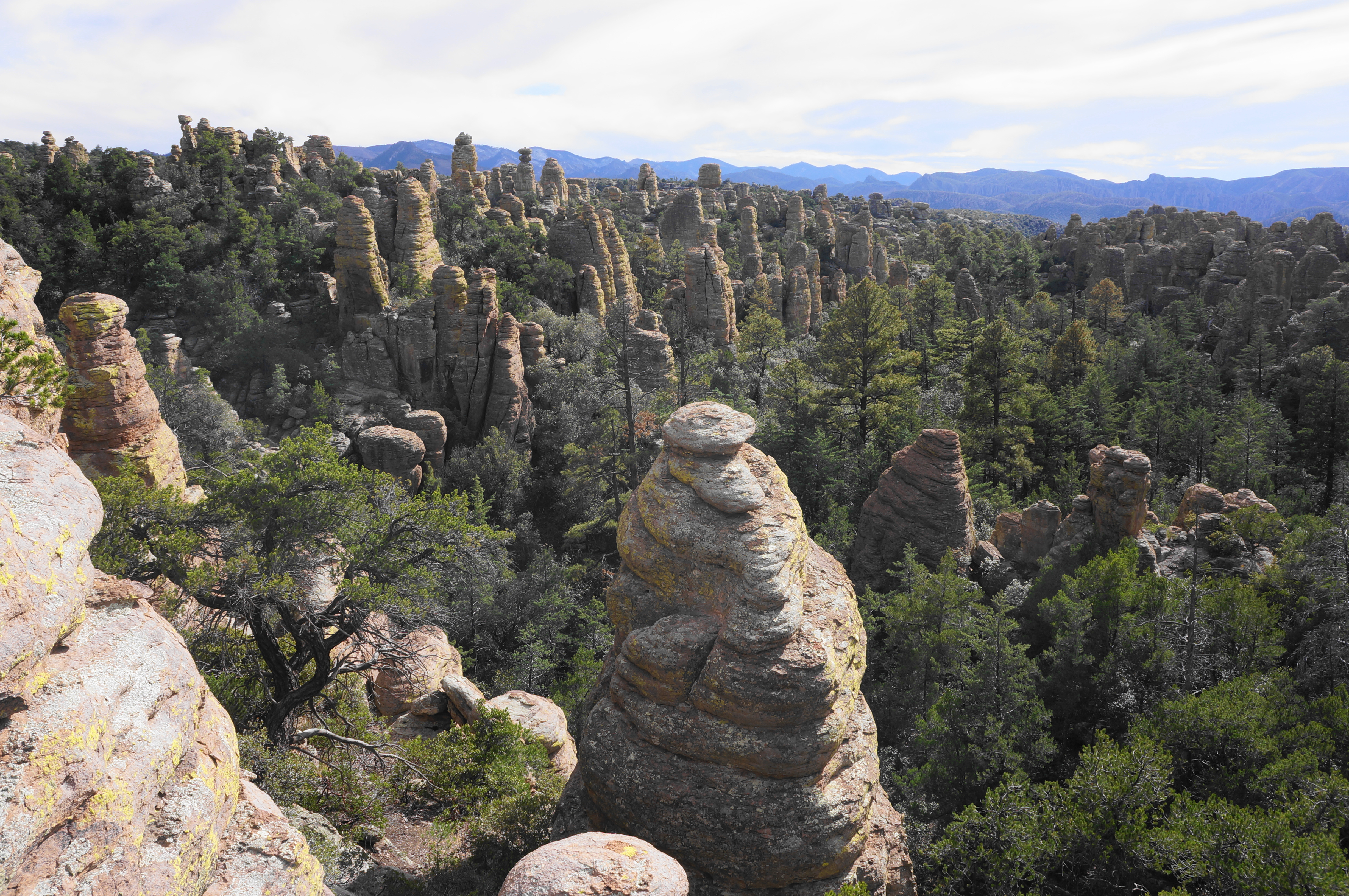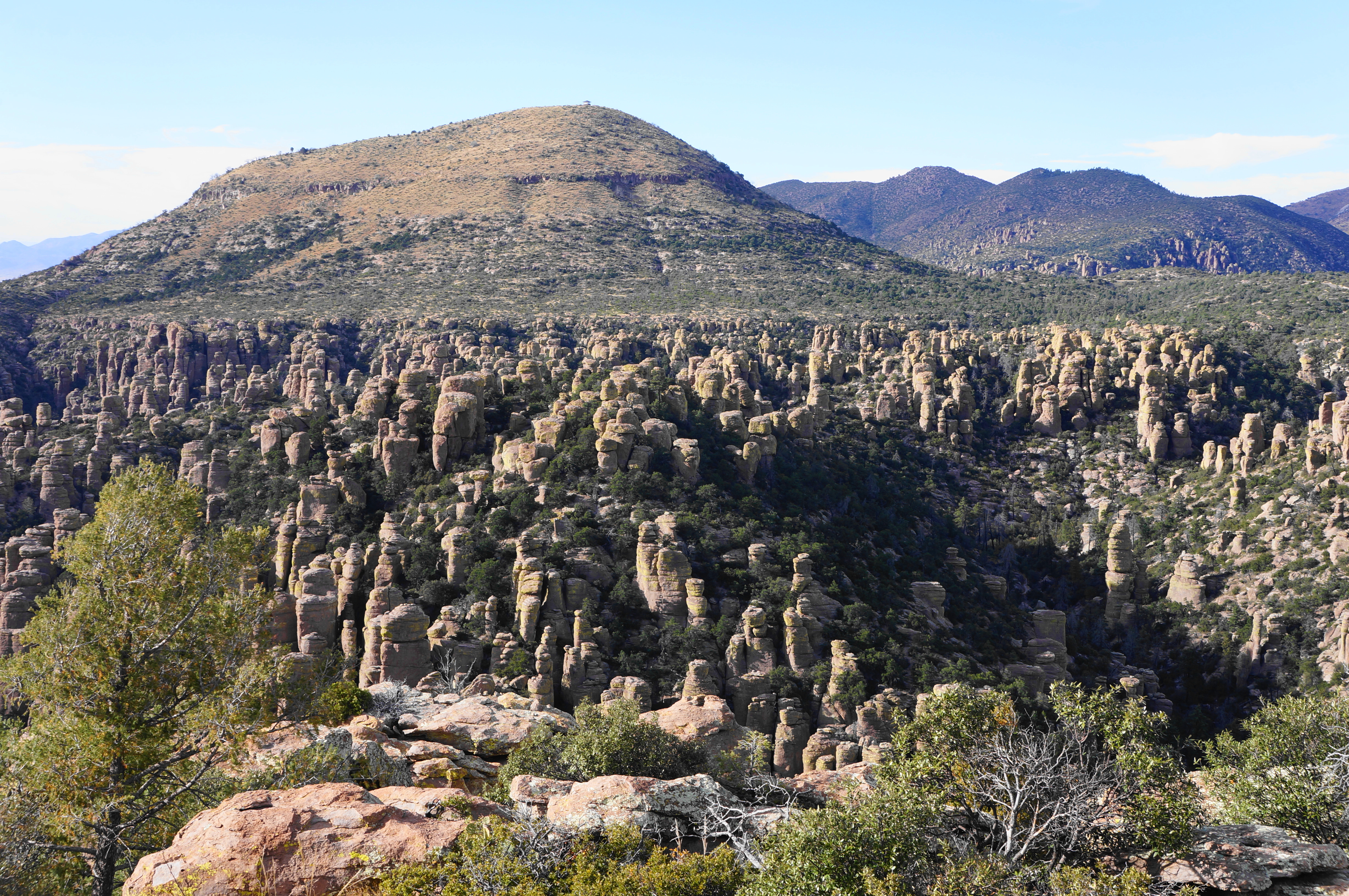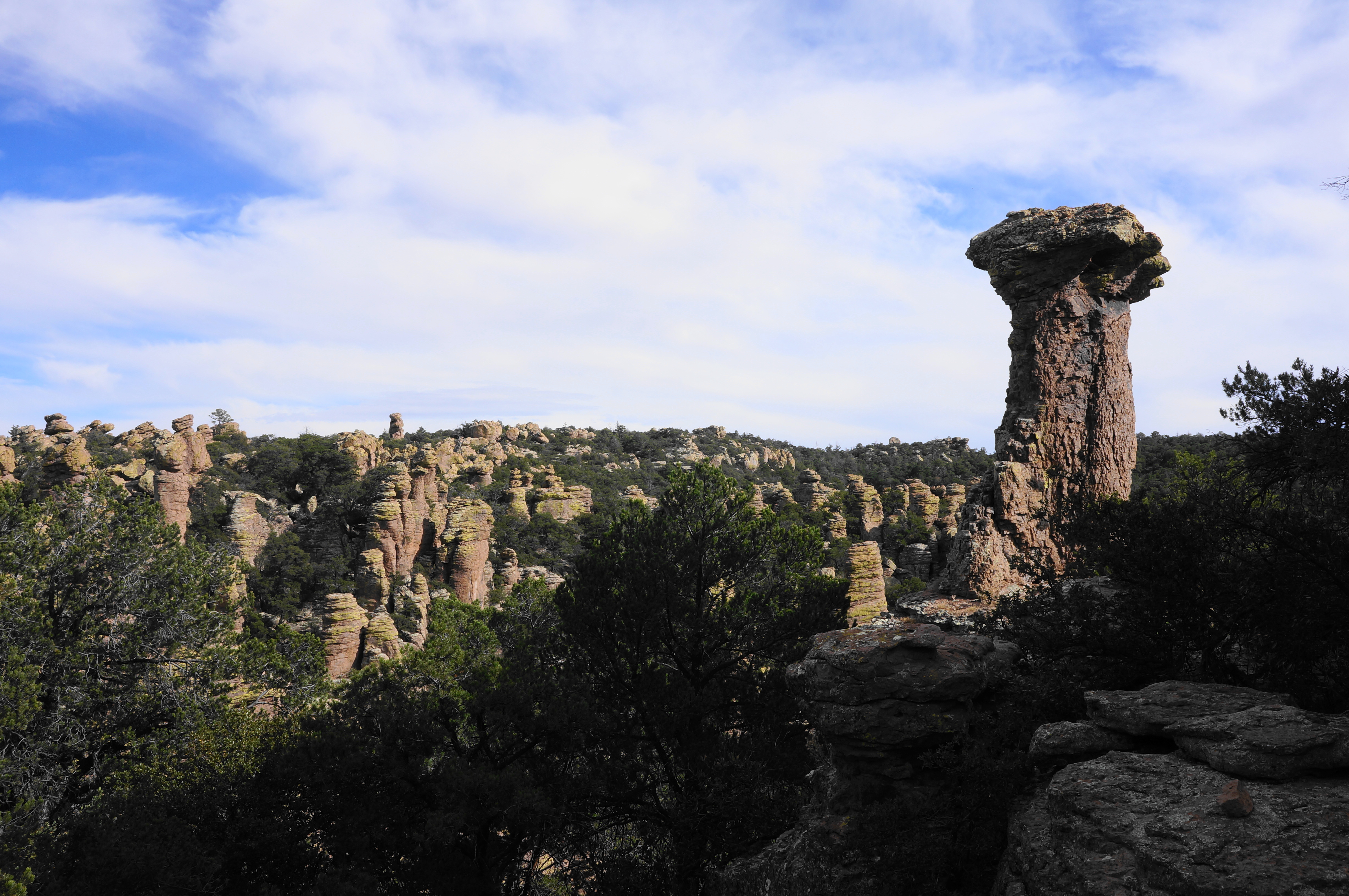 Chiricahua National Monument spans 12,000 acres in the northern half of the Chiricahua Mountains, with the entrance situated about 35 miles southeast of Willcox, Arizona. The range is located along the boundary of the Sonoran and Chihuahuan Deserts and approximates the northern terminus of the lengthy Sierra Madre Mountains, located primary in neighboring Mexico. The Chiricahua Mountains—named for a group of Apache who once controlled the area—are one of many so-called “sky islands,” or mountain ranges that appear to rise from a surrounding desert “sea.”