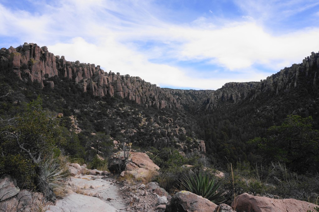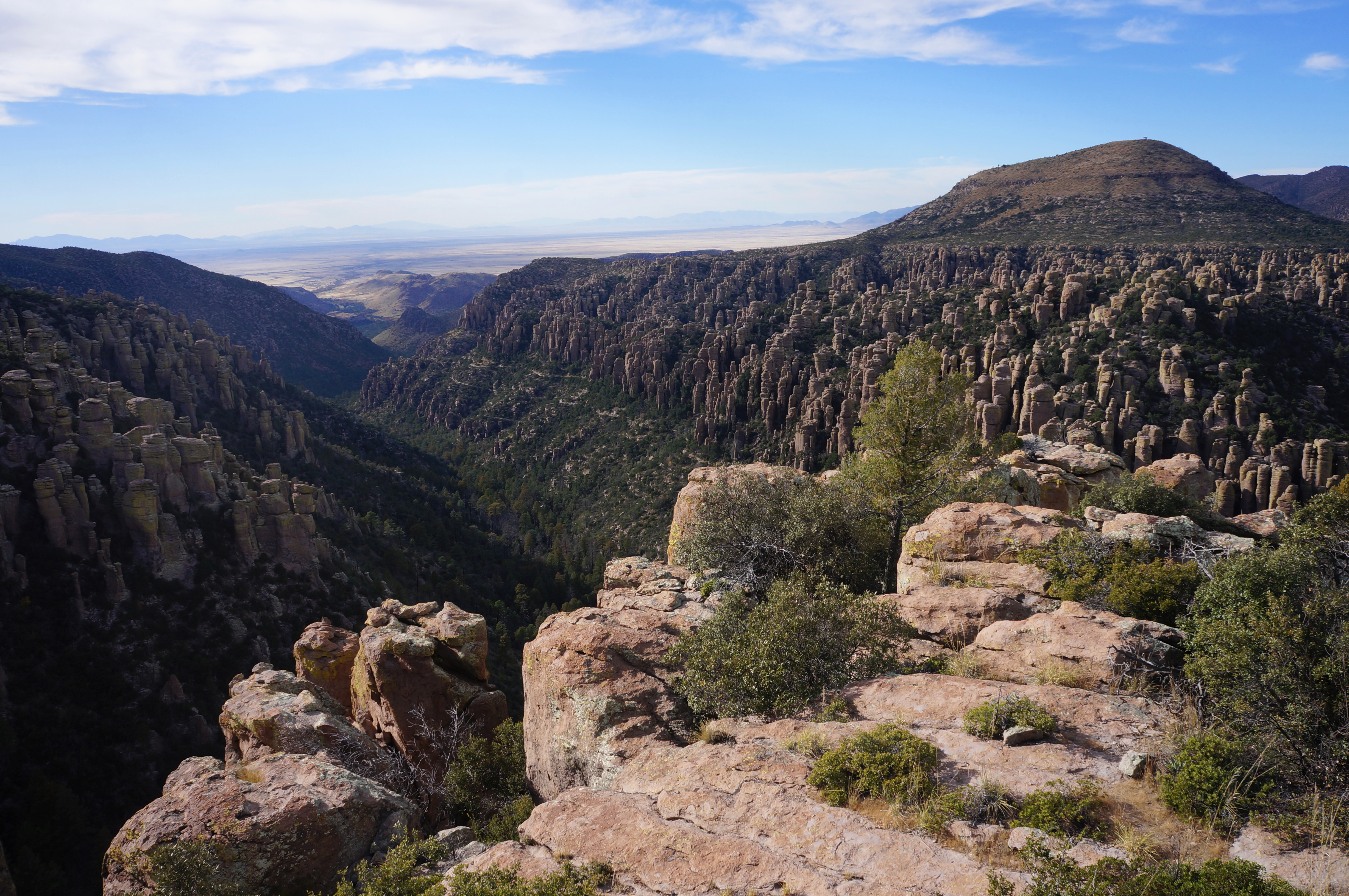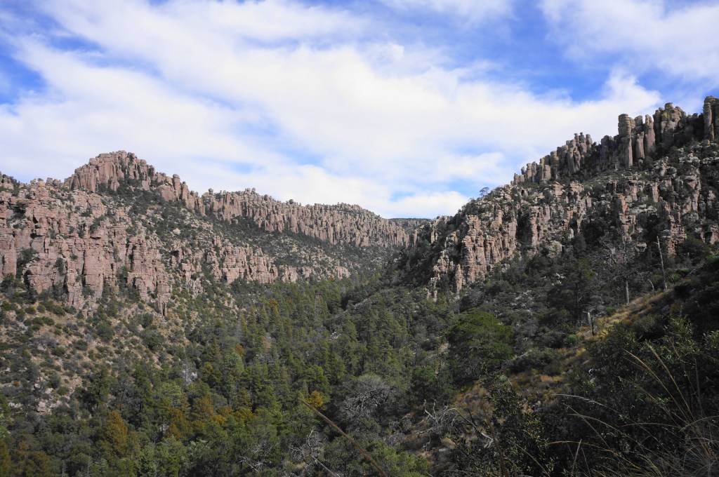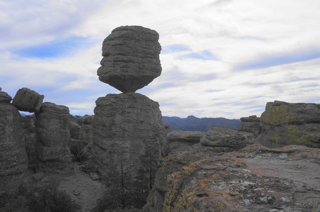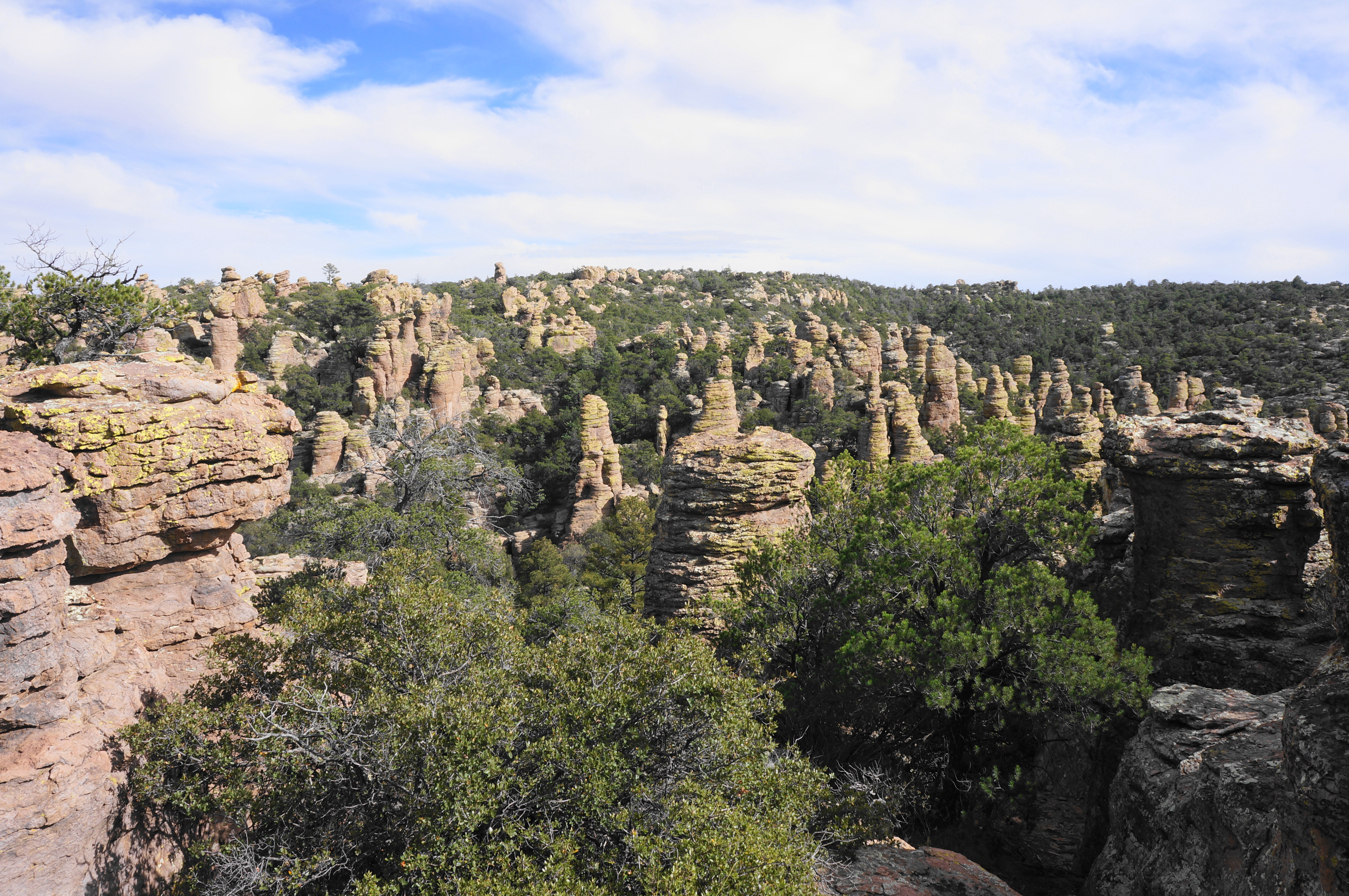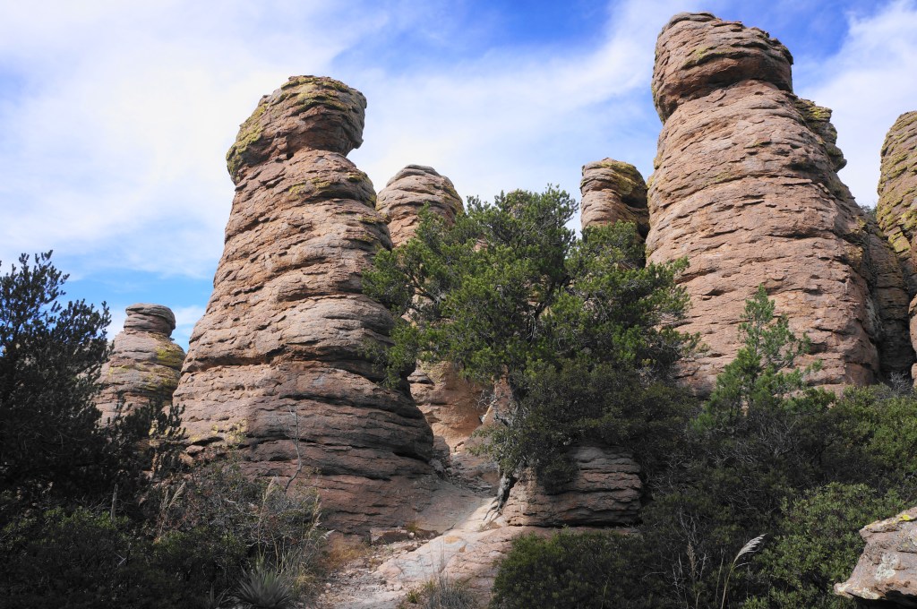 Chiricahua National Monument spans 12,000 acres in the northern half of the Chiricahua Mountains, with the entrance situated about 35 miles southeast of Willcox, Arizona. The range is located along the boundary of the Sonoran and Chihuahuan Deserts and approximates the northern terminus of the lengthy Sierra Madre Mountains, located primary in neighboring Mexico. The Chiricahua Mountains—named for a group of Apache who once controlled the area—are one of many so-called “sky islands,” or mountain ranges that appear to rise from a surrounding desert “sea.”