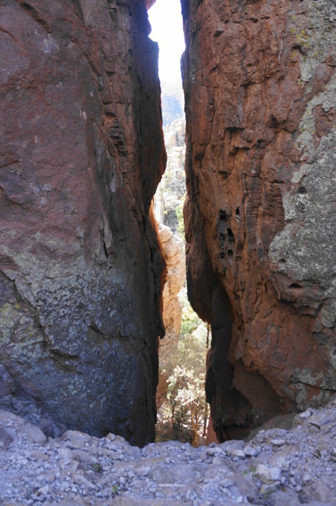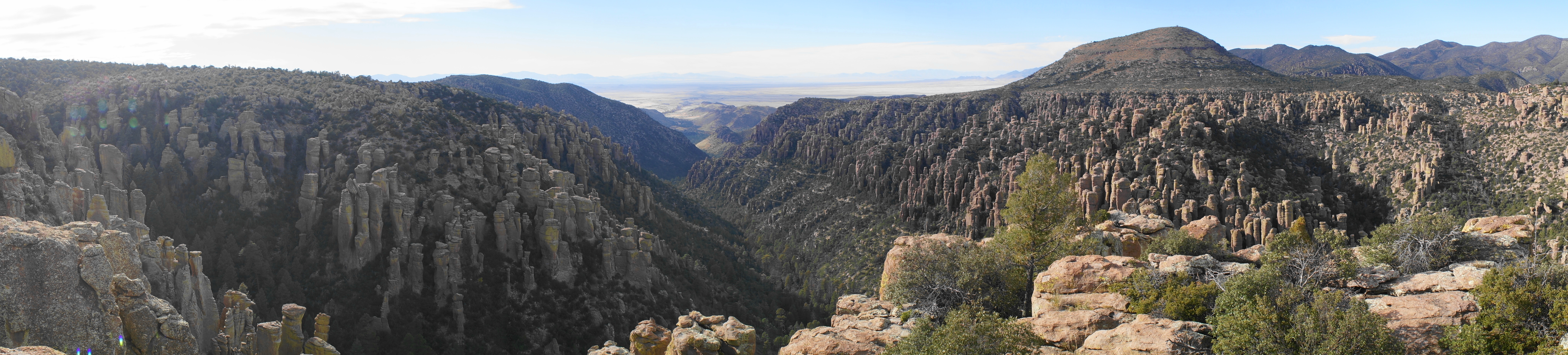 After clearing another notch, the trail levels off, and spurs off to the left offer vista points overlooking Rhyolite Canyon and the vast valley to the northwest, with the Dos Cabezas, Winchester, Galiuro, and Pinaleño Mountains beyond. This is one of the best overlooks in the park.