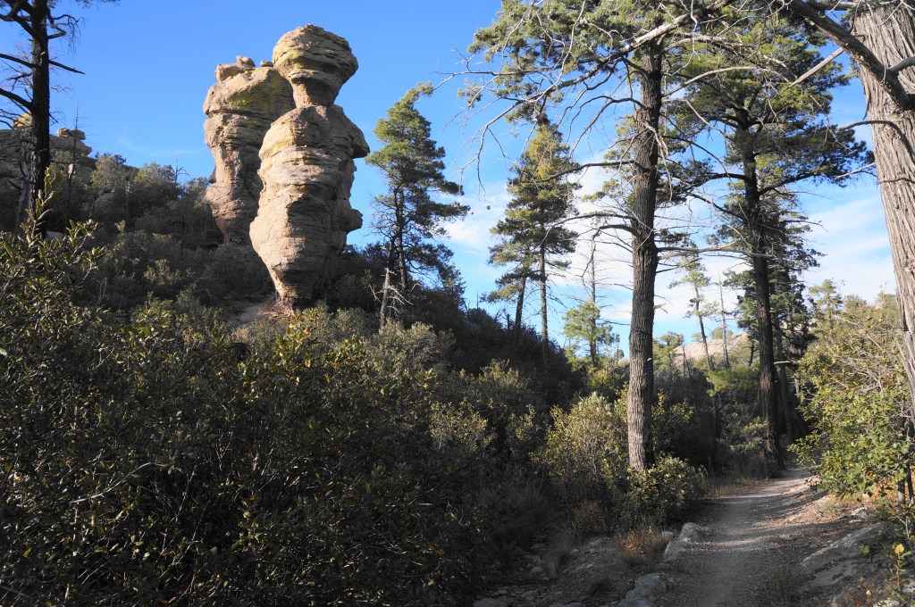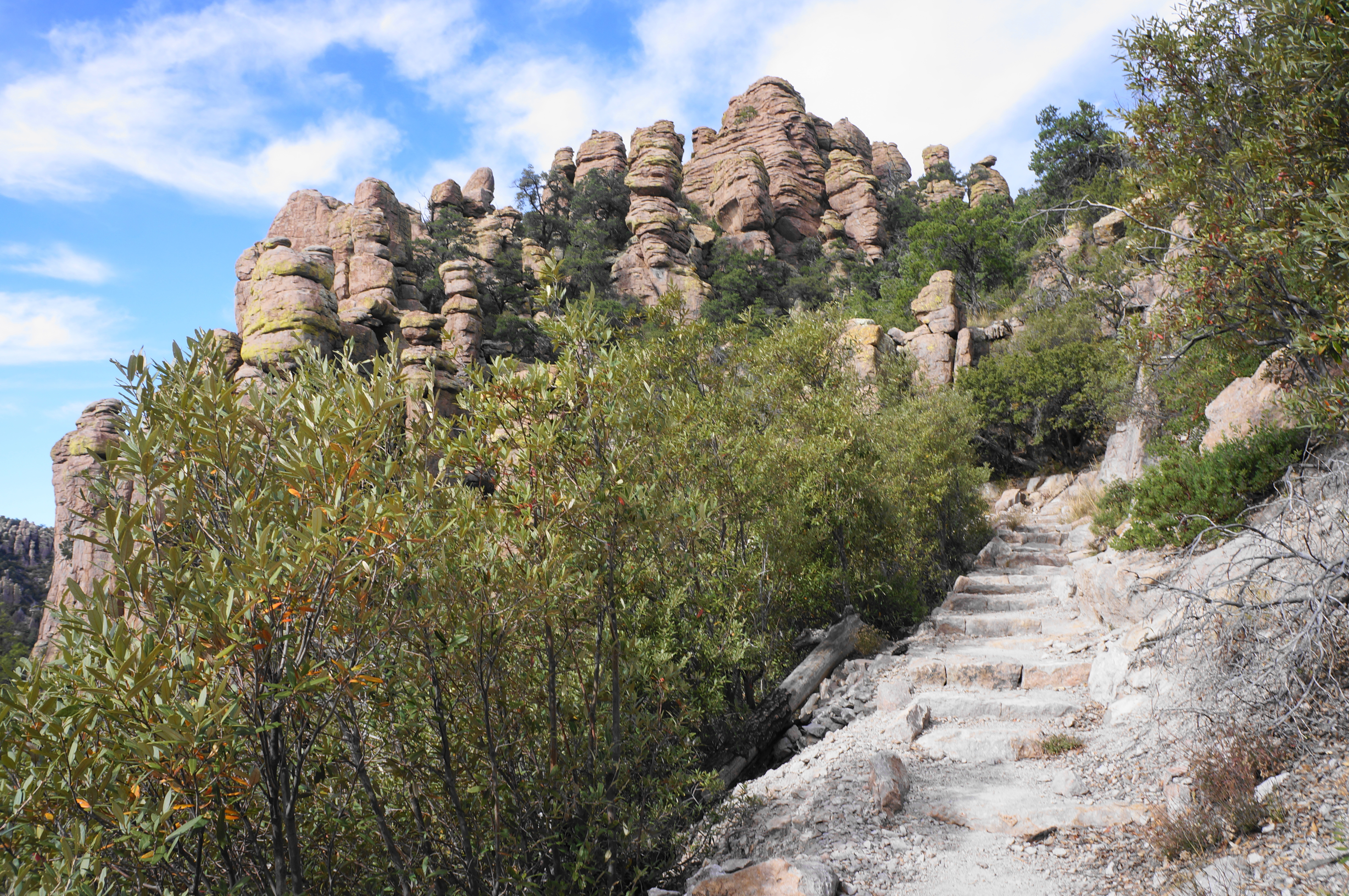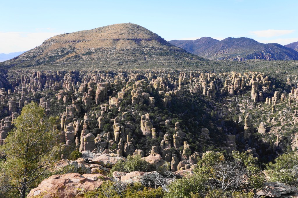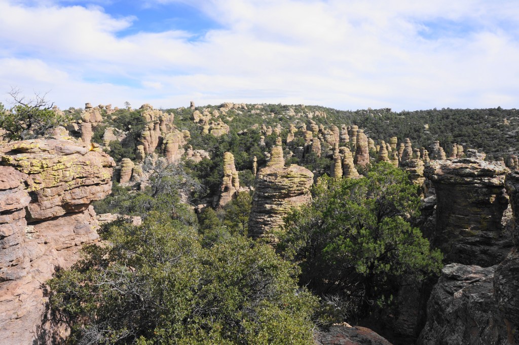 At first glance, the Chiricahua Mountains of southeast Arizona appear little different from the hundreds of other small ranges of the Basin and Range area, which spans from southern Oregon and Idaho down to Mexico: an abrupt north-south range rising from open, scrubby valleys, seemingly the same pattern of dry escarpments with the usual features of rocky peaks and some limited woodlands. But the Chiricahua range harbors a secret that sets it apart from the others: a hidden landscape of thousands of naturally-carved pinnacles composed of yellow-brown rhyolite tuff, evidence of ancient lava flows, uplift, and intense erosion. The result is a “wonderland of rocks” resembling a slightly more subdued version of Bryce Canyon—but spectacular in its own way. Like Bryce, there is an extensive trail network crisscrossing the landscape, with far and away the best option being the Chiricahua Big Loop, an 8.8-mile excursion that combines several trails in Chiricahua National Monument, included the famed “Heart of Rocks” area. The extensive scenery and bounty of spur trails easily make this challenging hike a most-of-the-day affair that visitors are unlikely to forget.
