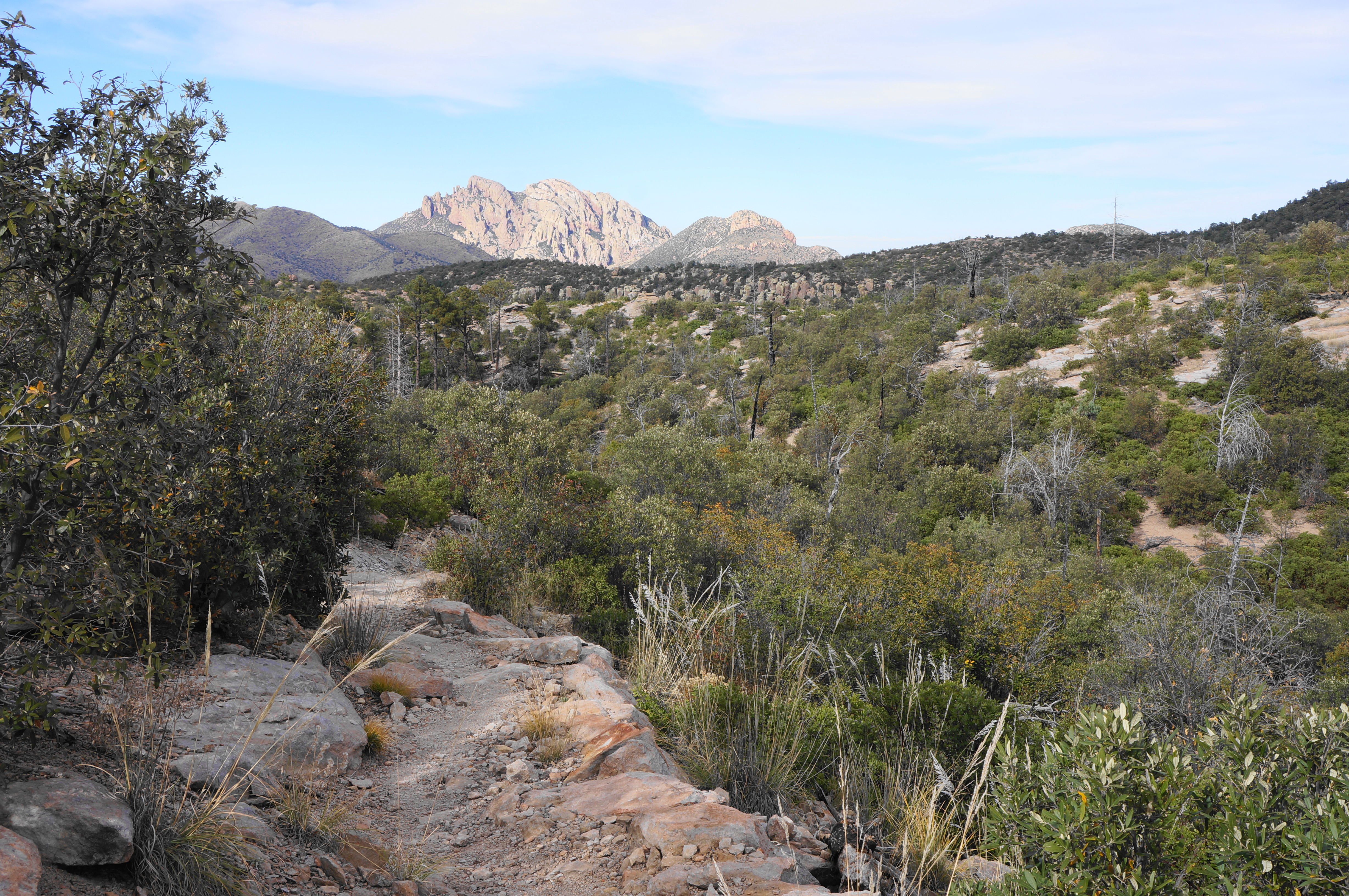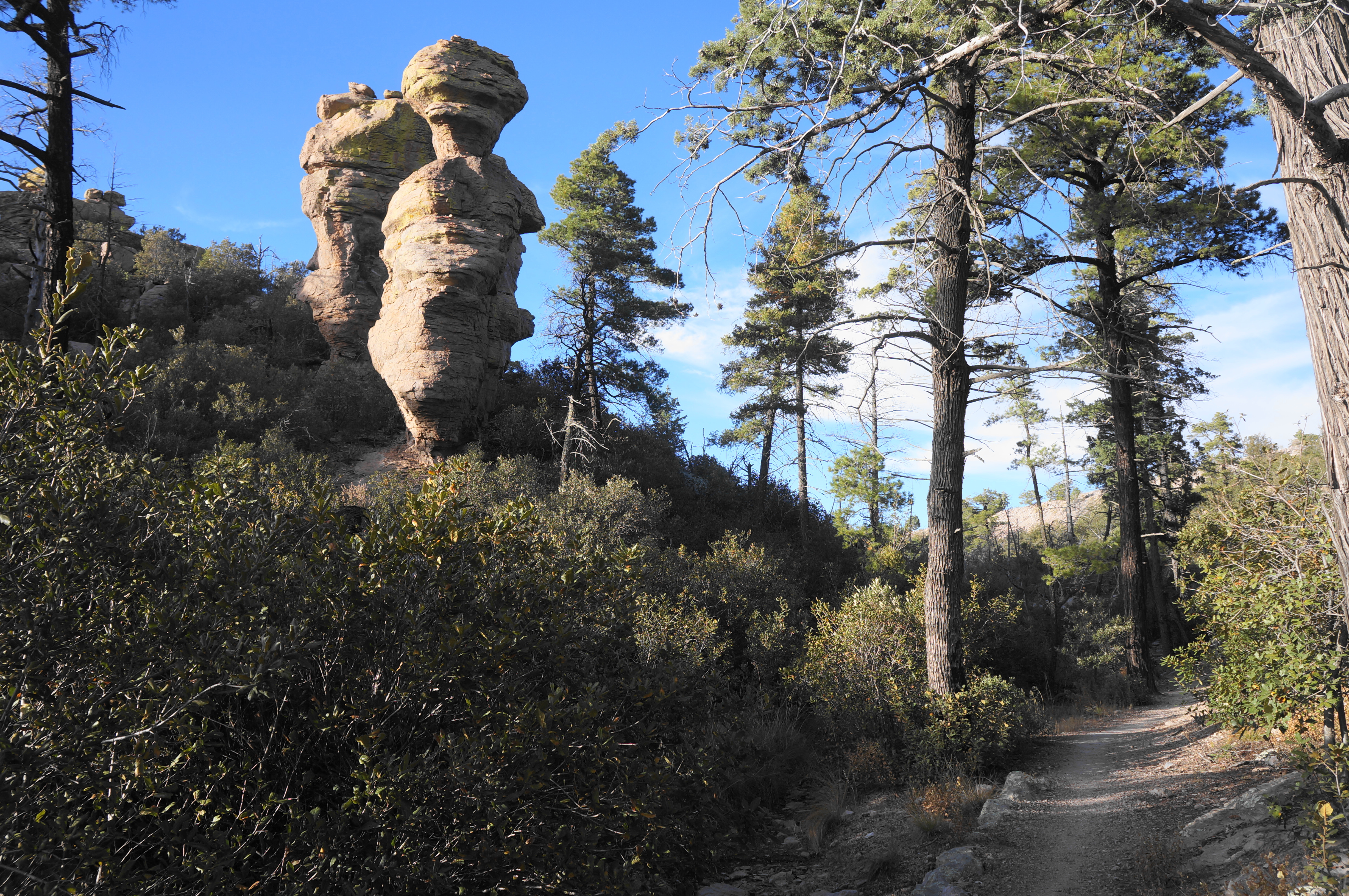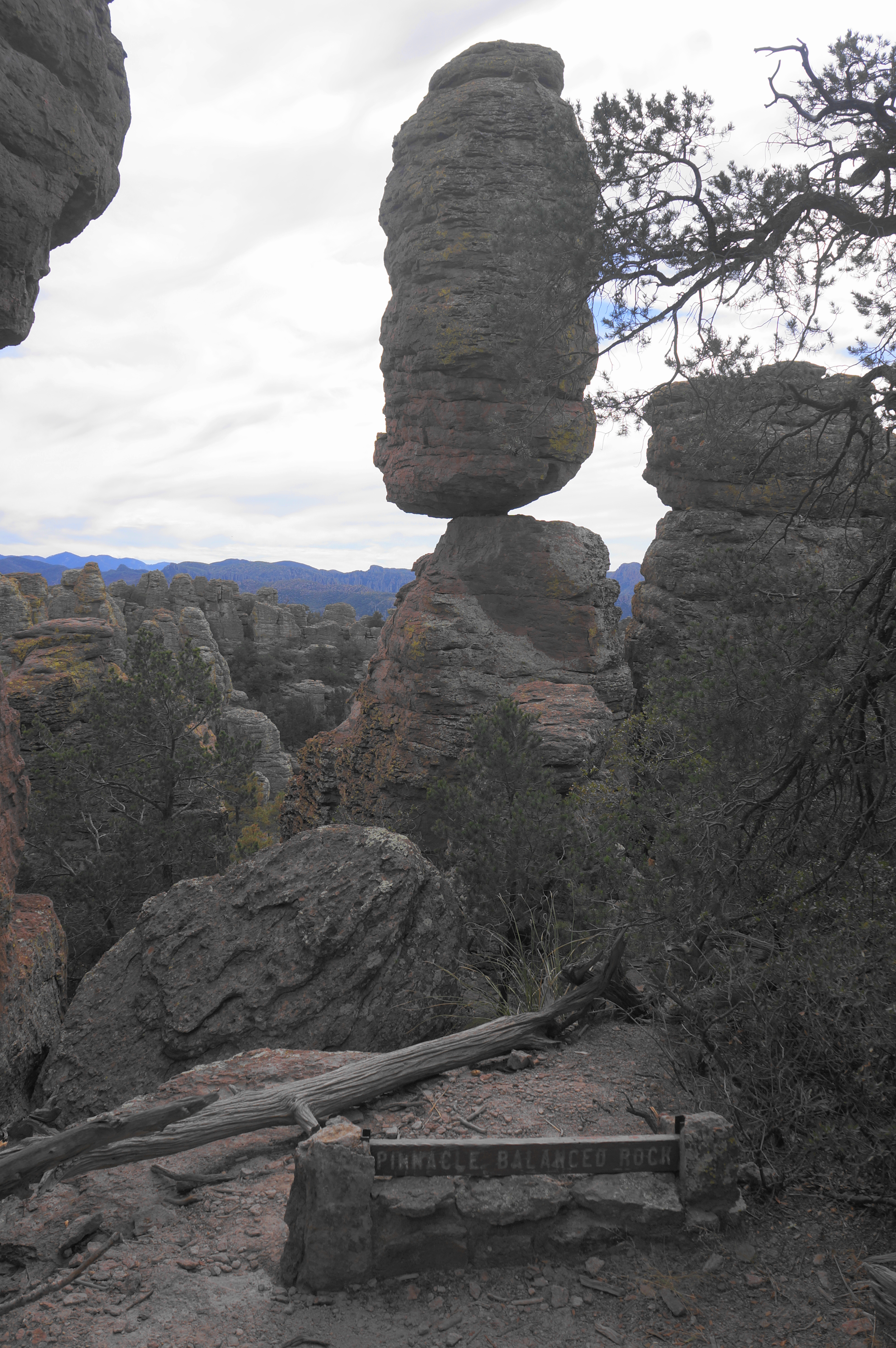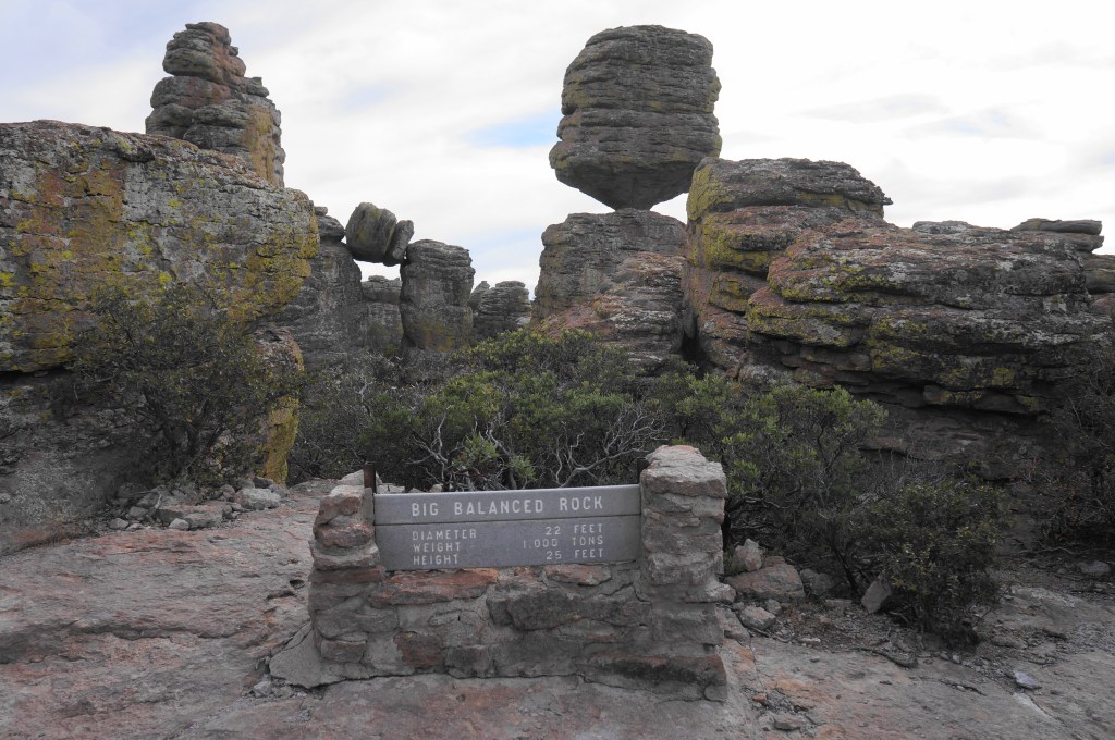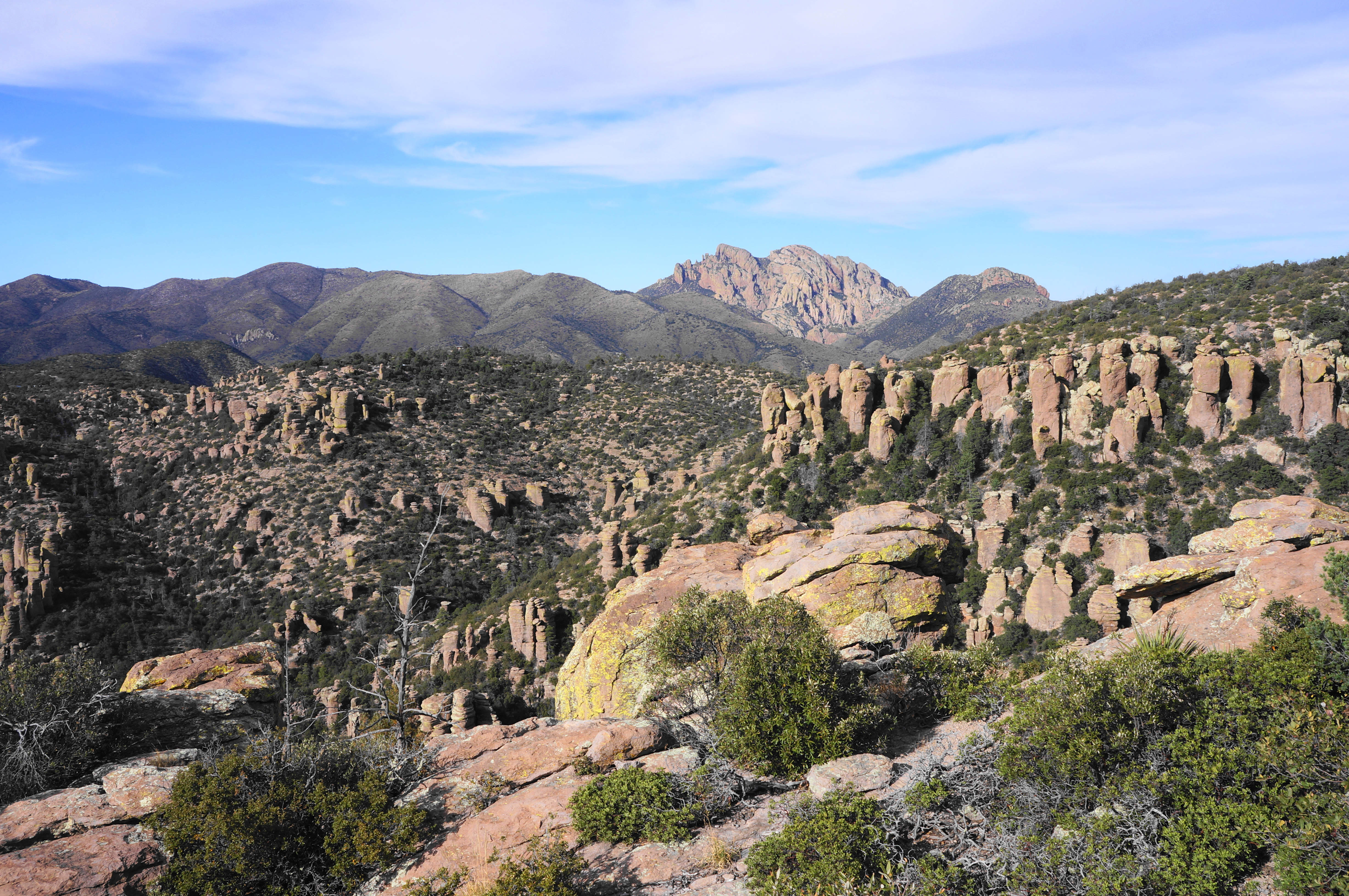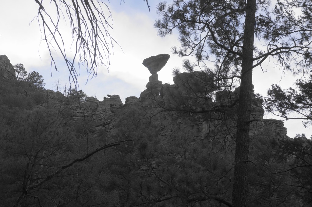 The Big Balanced Rock Trail offers the loop’s best southward views, however, to the higher peaks of the central Chiricahuas—much of this landscape is protected as part of the Chiricahua Wilderness. There are also distant views to Cochise Head and the Dos Cabezas Mountains to the north.