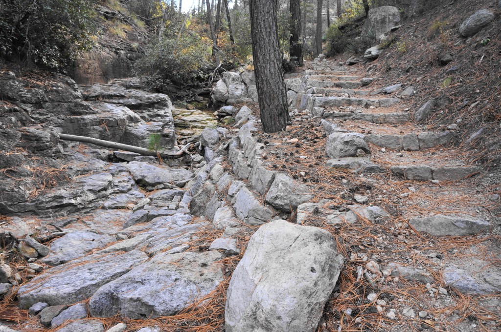 The incline steepens and vegetation lessens as hikers slog up the hill and are at least rewarded with better views as the ascent proceeds. The trail more or less makes for an easement in the rhyolite rim, some 300 feet above the canyon. Expect many stone steps in this section—a testament to decades of trail work and maintenance.
