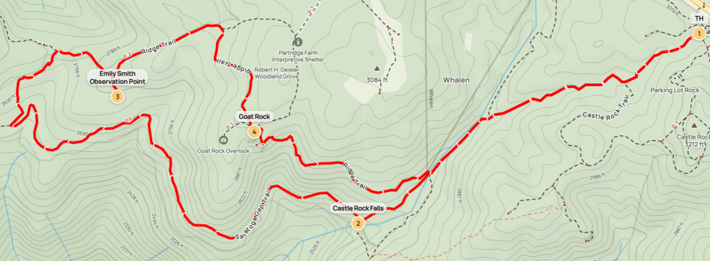 The Saratoga Gap Trail continues onward to the Castle Rock Trail Camp, another mile away, but hikers on this 3-mile loop will want to bear right on the Interconnector Trail at 1.4 miles. This relatively uninteresting track involves a short uphill, ending quickly at the wider and more heavily-trafficked Ridge Trail.