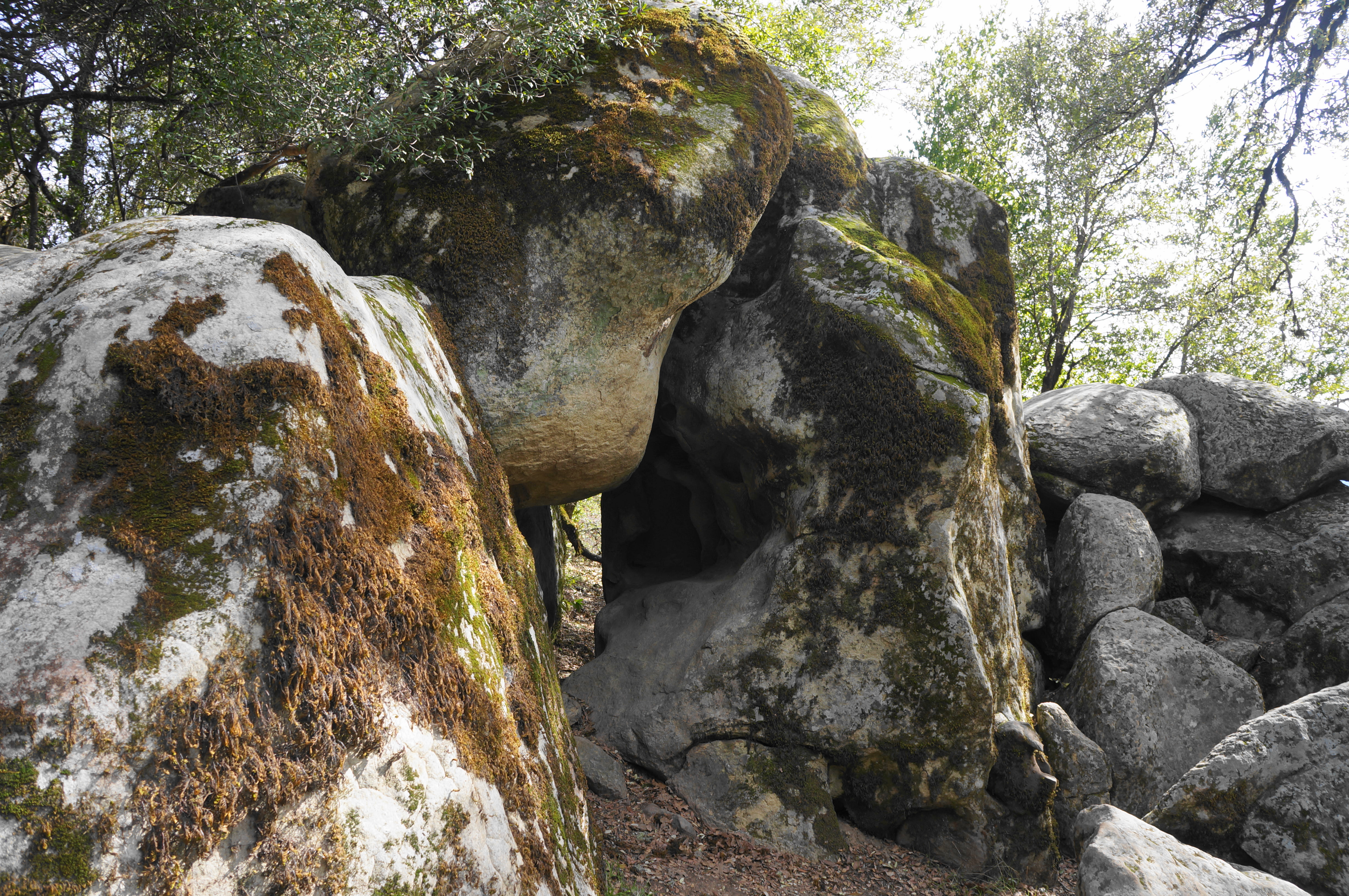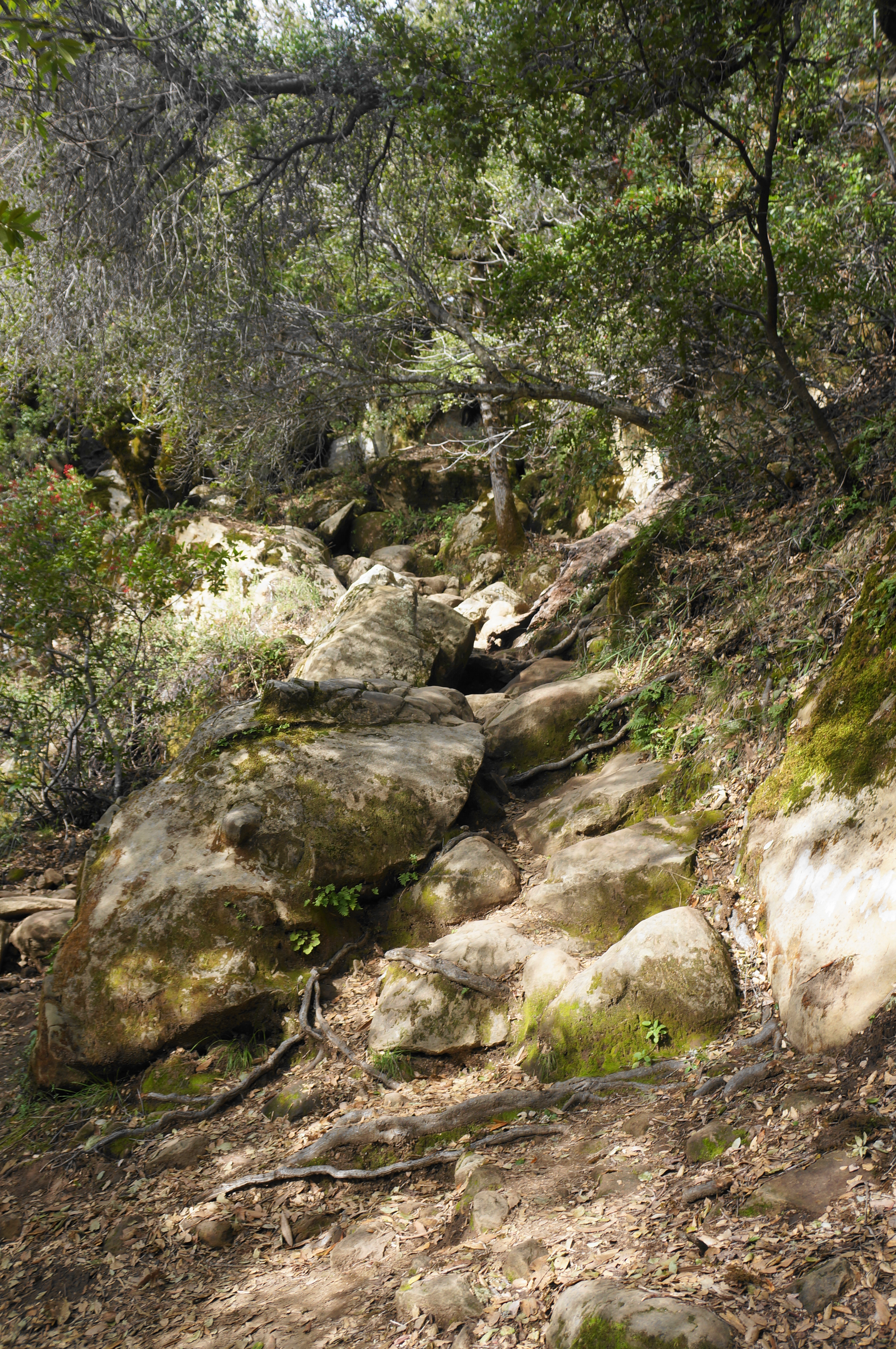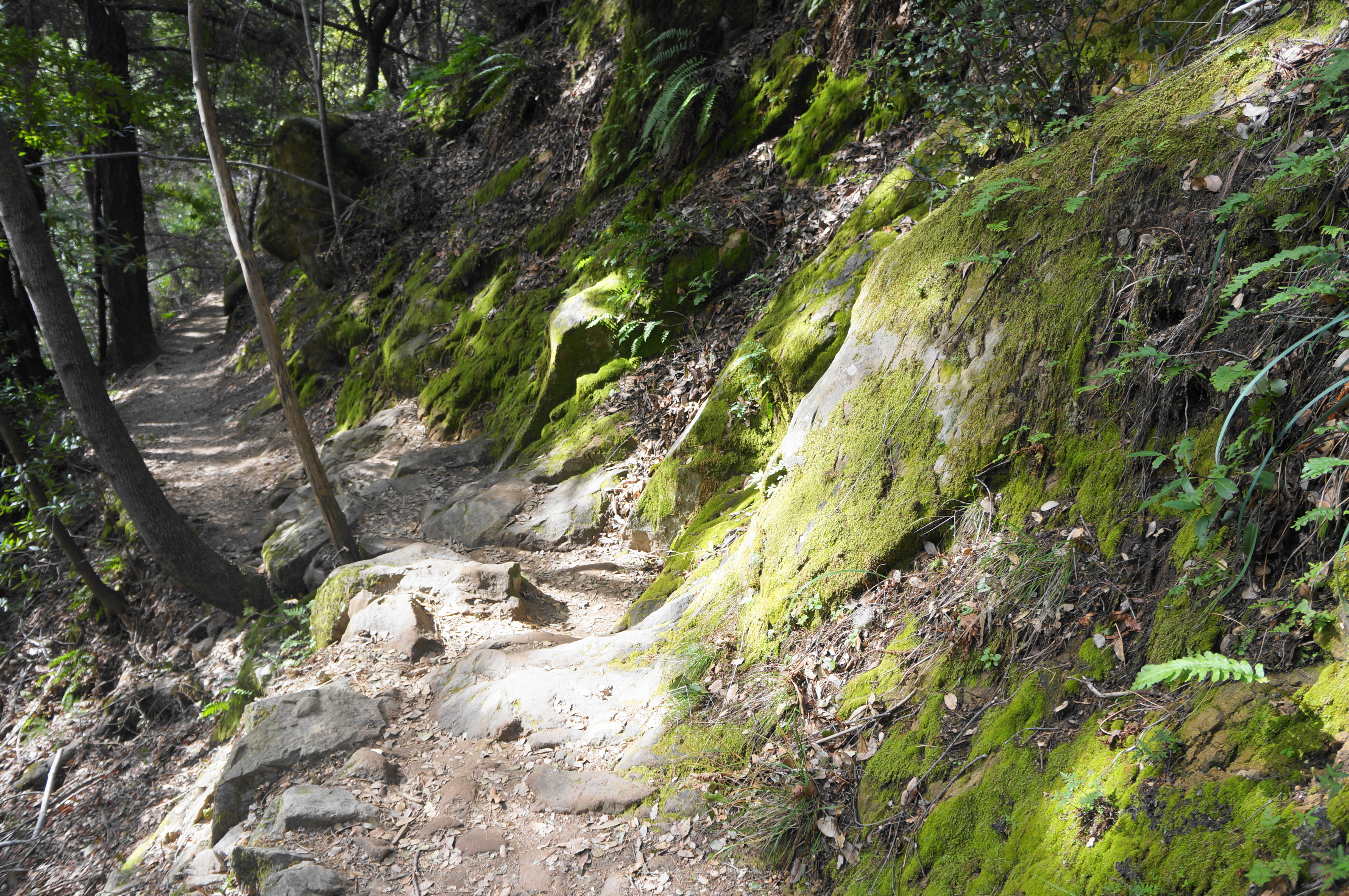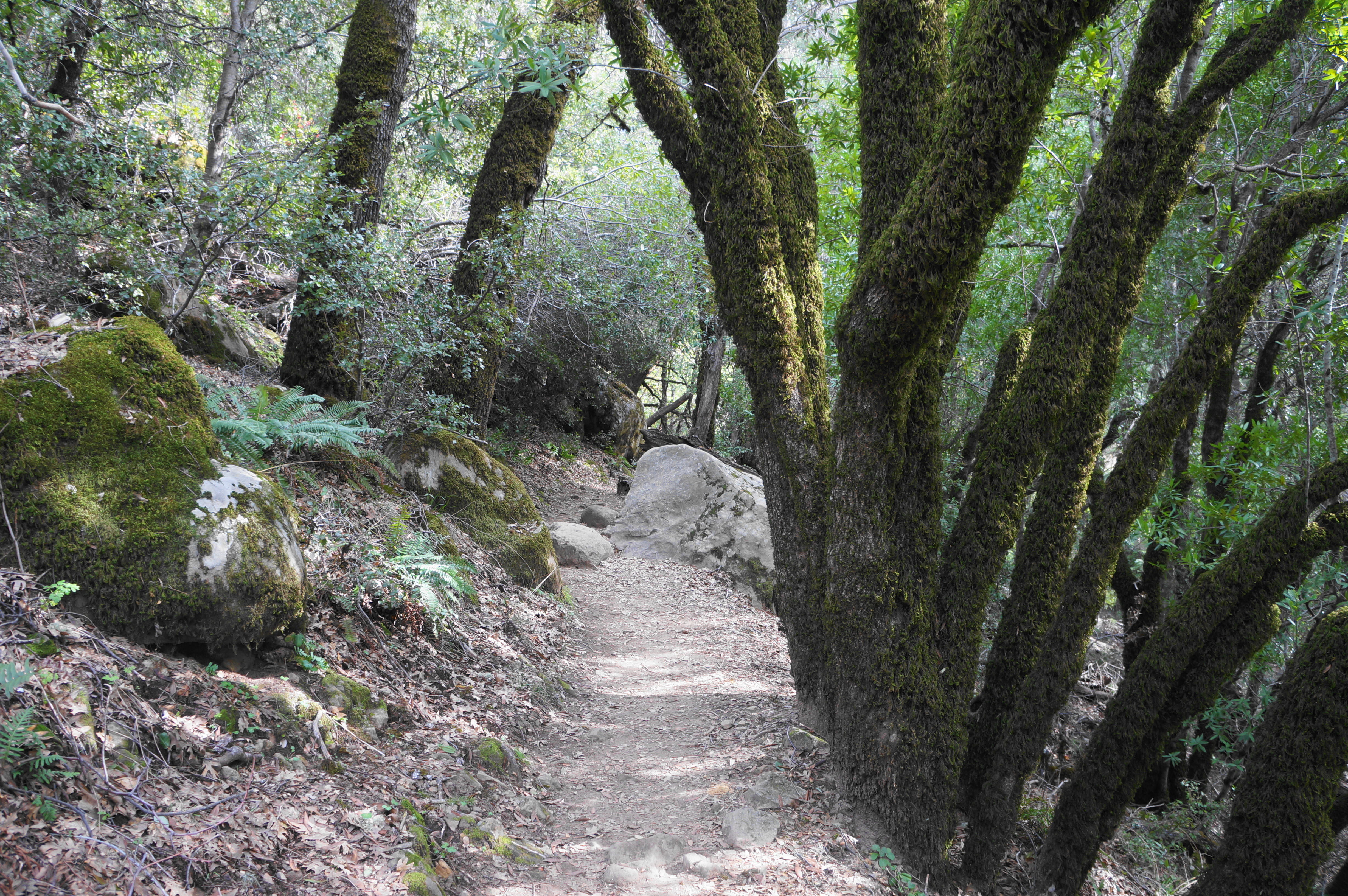 From the overflow lot, there are at least three separate trails fanning out into the woods. Take the path in the center, next to the large trail map kiosk, which offers information on various hikes of all difficulties. The first stretch of the Saratoga Gap Trail follows a very minor ravine, reaching barely more than a trickle even in the wet season. Off to the right is a 25-foot behemoth known to climbers as “Cave Boulder”—aptly named given its many deep cavities. This is the first of many sandstone outcrops that hikers will encounter on the stem-and-loop.