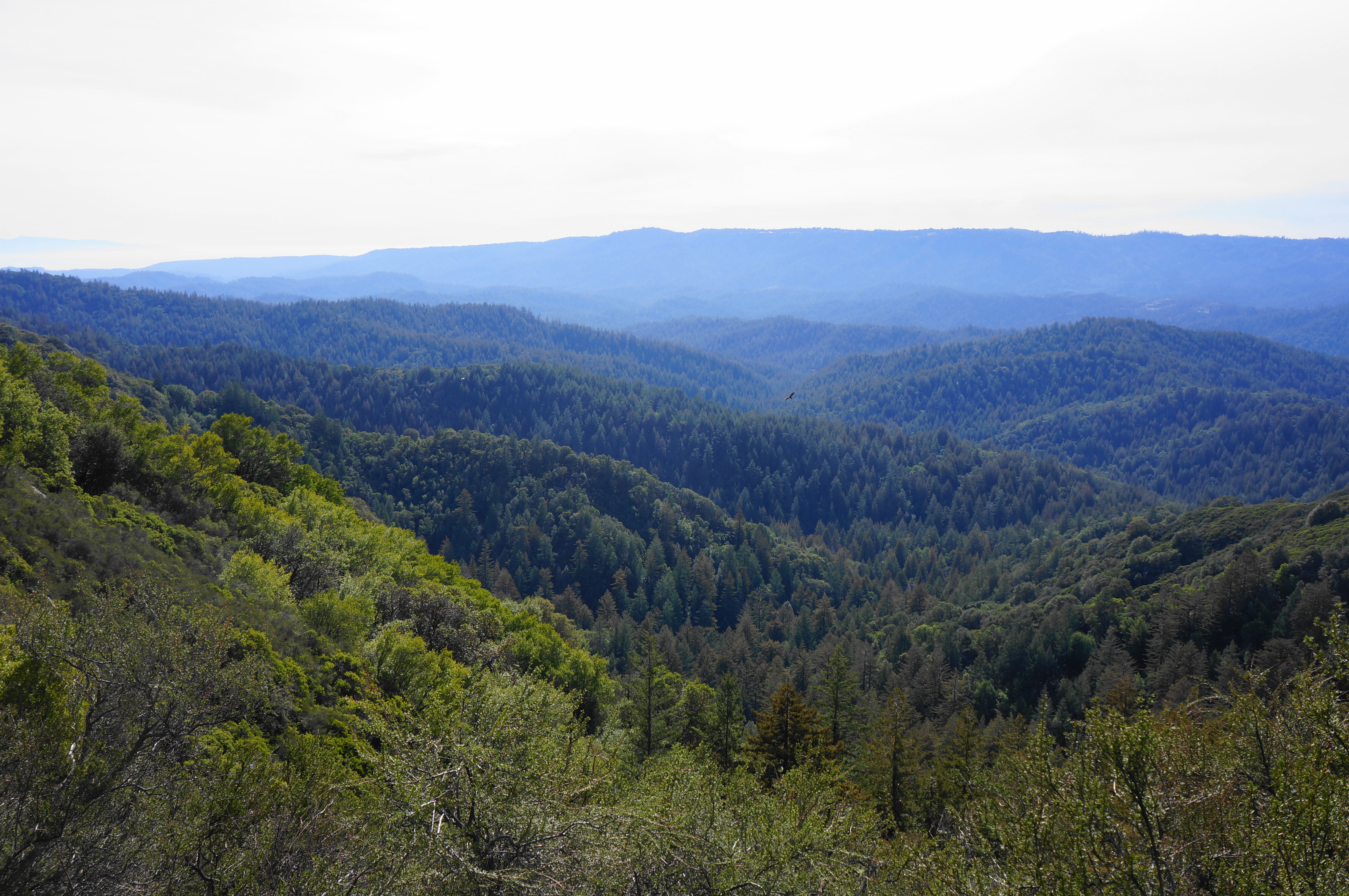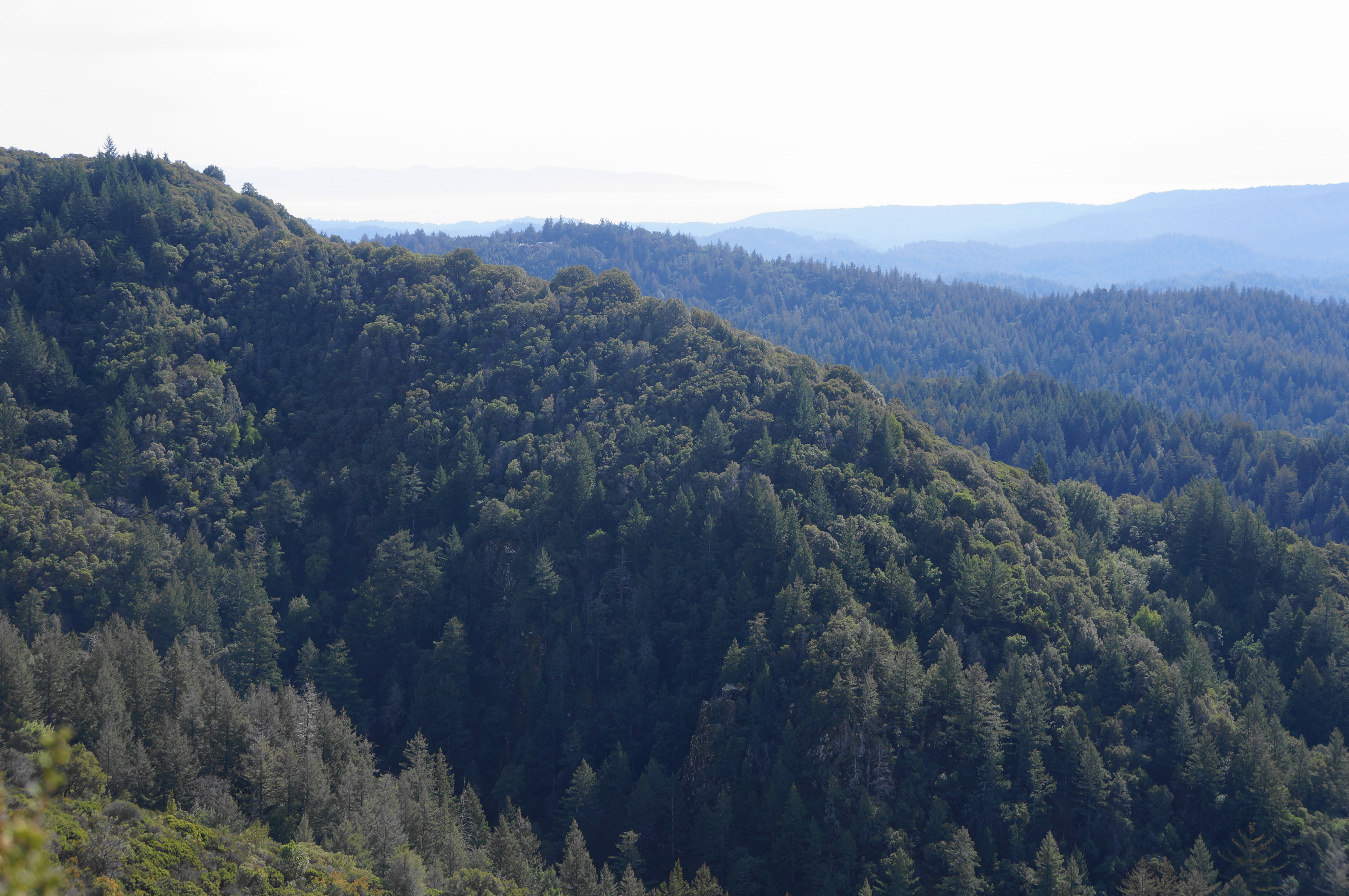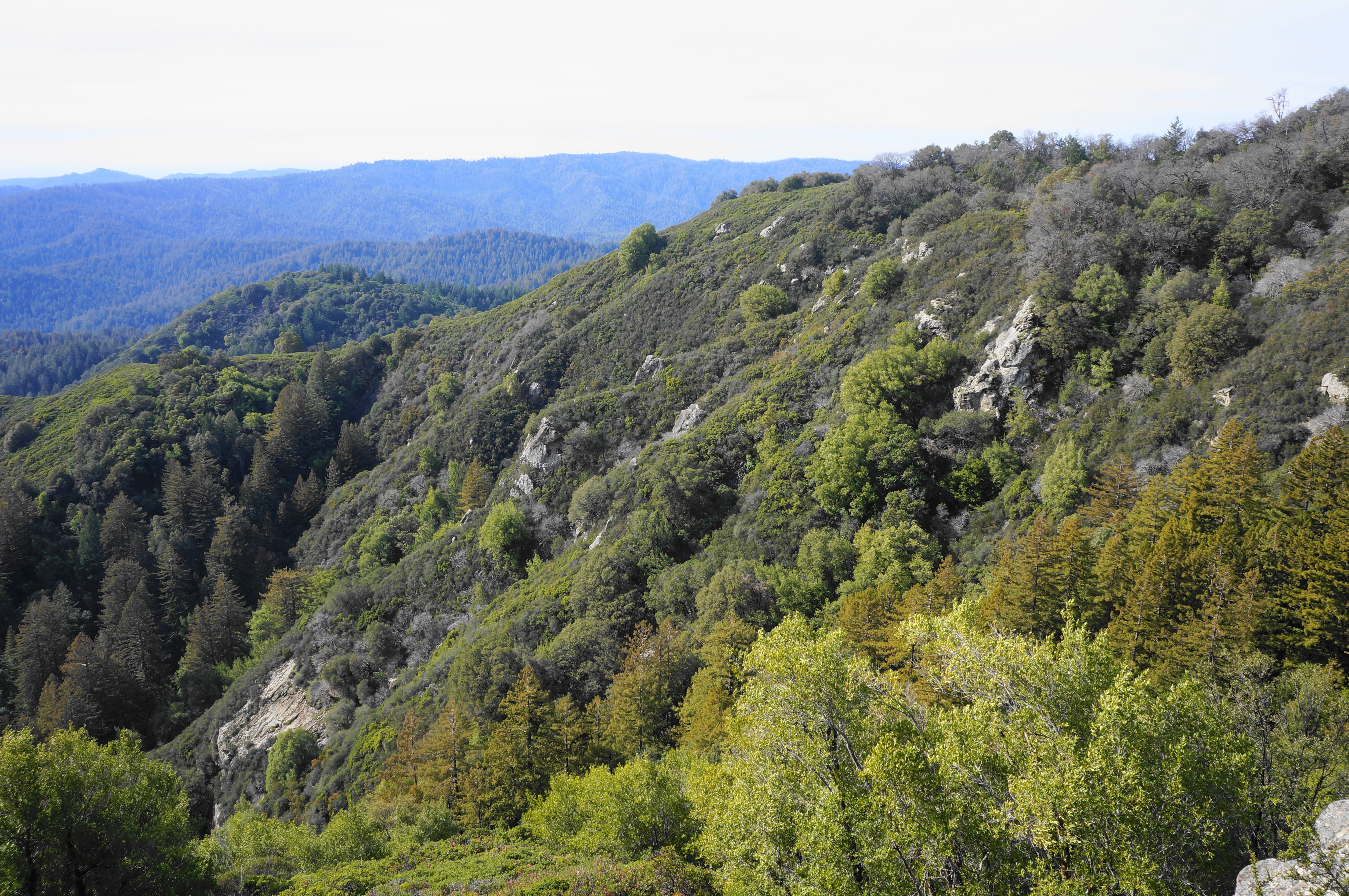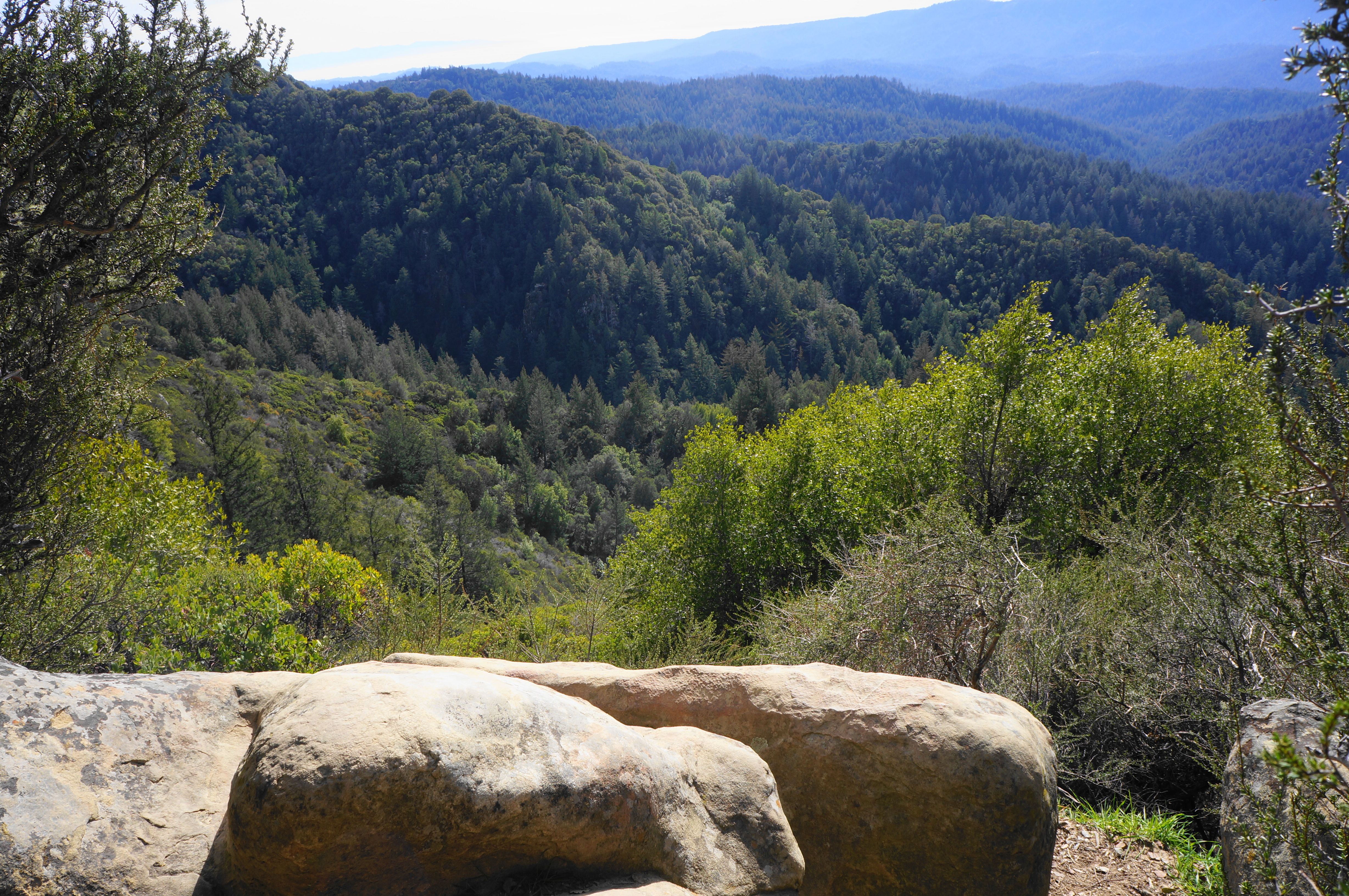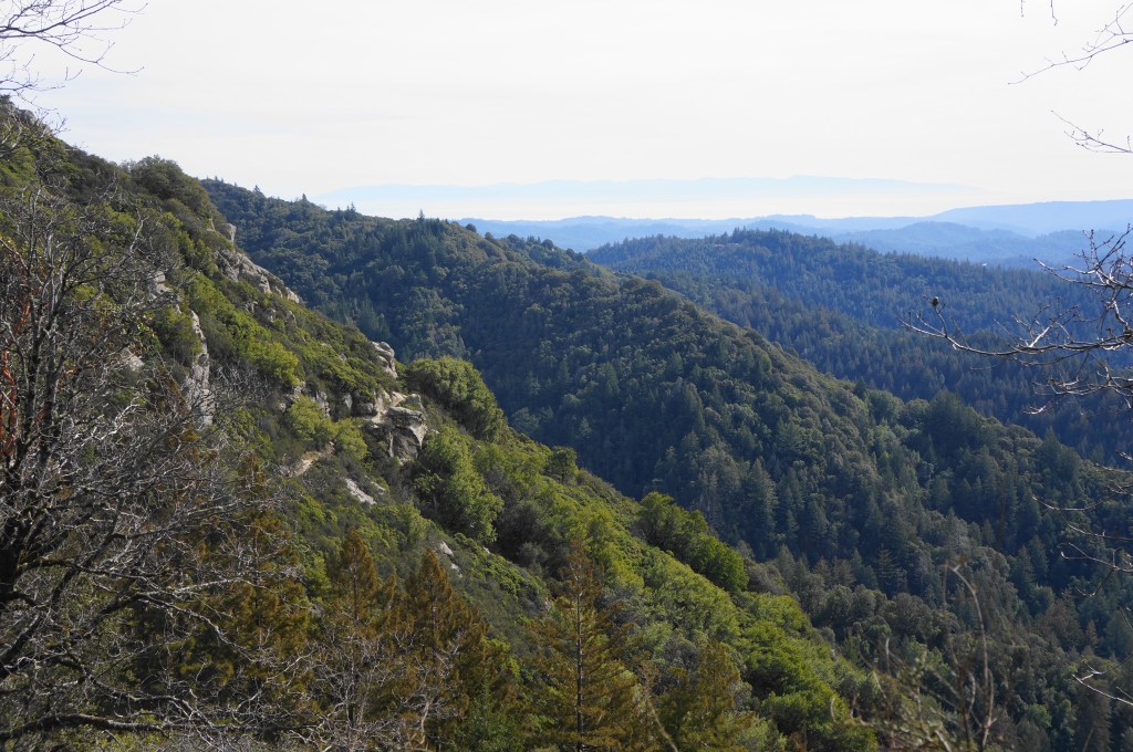 Beyond the waterfall, the trail continues treading westward, rounding another ravine lined with blocky boulder jumbles. At last, at about 9/10 mile, the tall trees recede, replaced by scrubby chaparral and low manzanitas, allowing for wide vistas to the south and west. On clear days, one can see down across the San Lorenzo watershed to Monterey Bay, with the taller Santa Lucia Range rising beyond. Immediately across the wooded watershed, the ridge in the distance is Ben Lomond Mountain, rising to heights almost as high as Castle Ridge, on which one now stands.