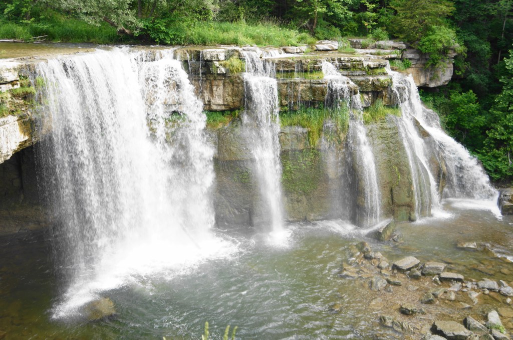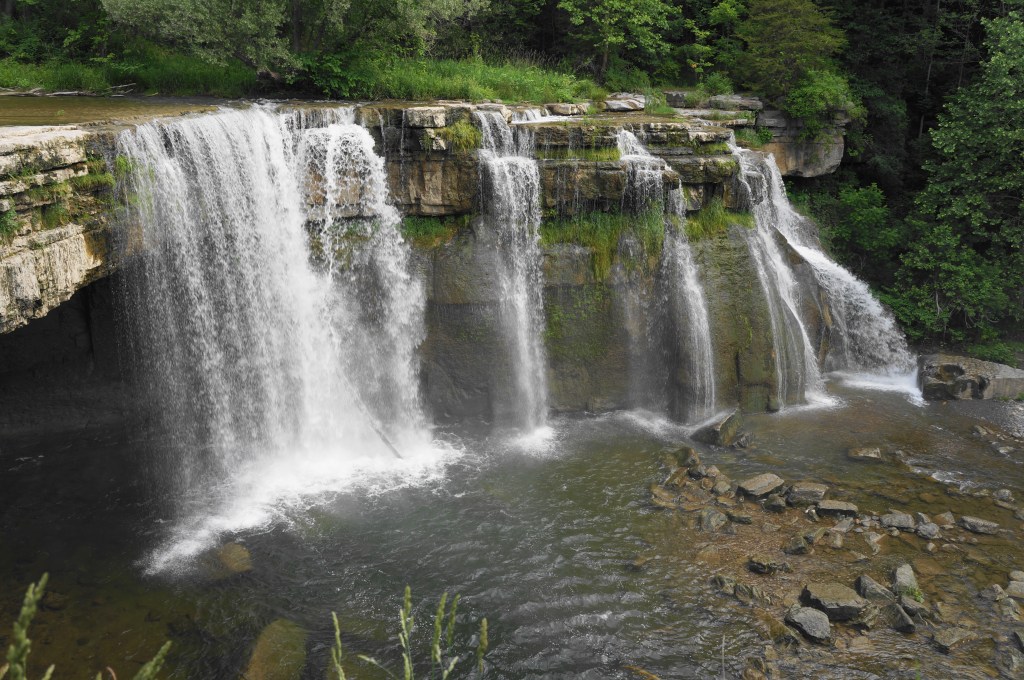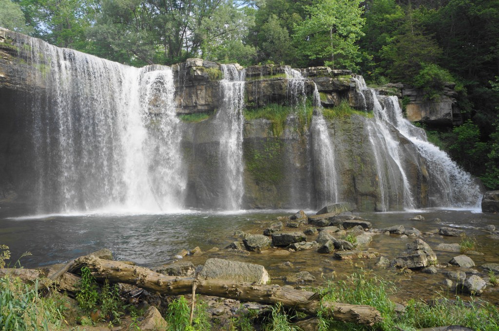 Ludlowville Falls (a.k.a. Salmon Creek Falls) is less impressive for its height (35-40 feet) than its width, falling in multiple chutes (or one mega-drop after snowmelt or heavy rains). The waterfall—less than a 20-minute drive from Ithaca, New York—is also notable for its residential setting: it must be a joy for residents of the small, quaint community of Ludlowville to have such a thunderous drop merely steps from home. The falls can be viewed from the north end of leafy Ludlowville Park. Here a fence prevents visitors from getting too close to the rim. But an unofficial but often-used path leads east, then north to the base of the falls along Salmon Creek. Be very careful as one drops down a steep section with slippery boulders before tiptoeing across a muddy surface to a spot where one can feel the fall’s spray. Behind the falls is a dusky alcove, not easily accessible without taking the plunge into the surprisingly deep pool. This waterfall is a nice spot to check out as part of a broader waterfall-hunting trip in and around Ithaca.