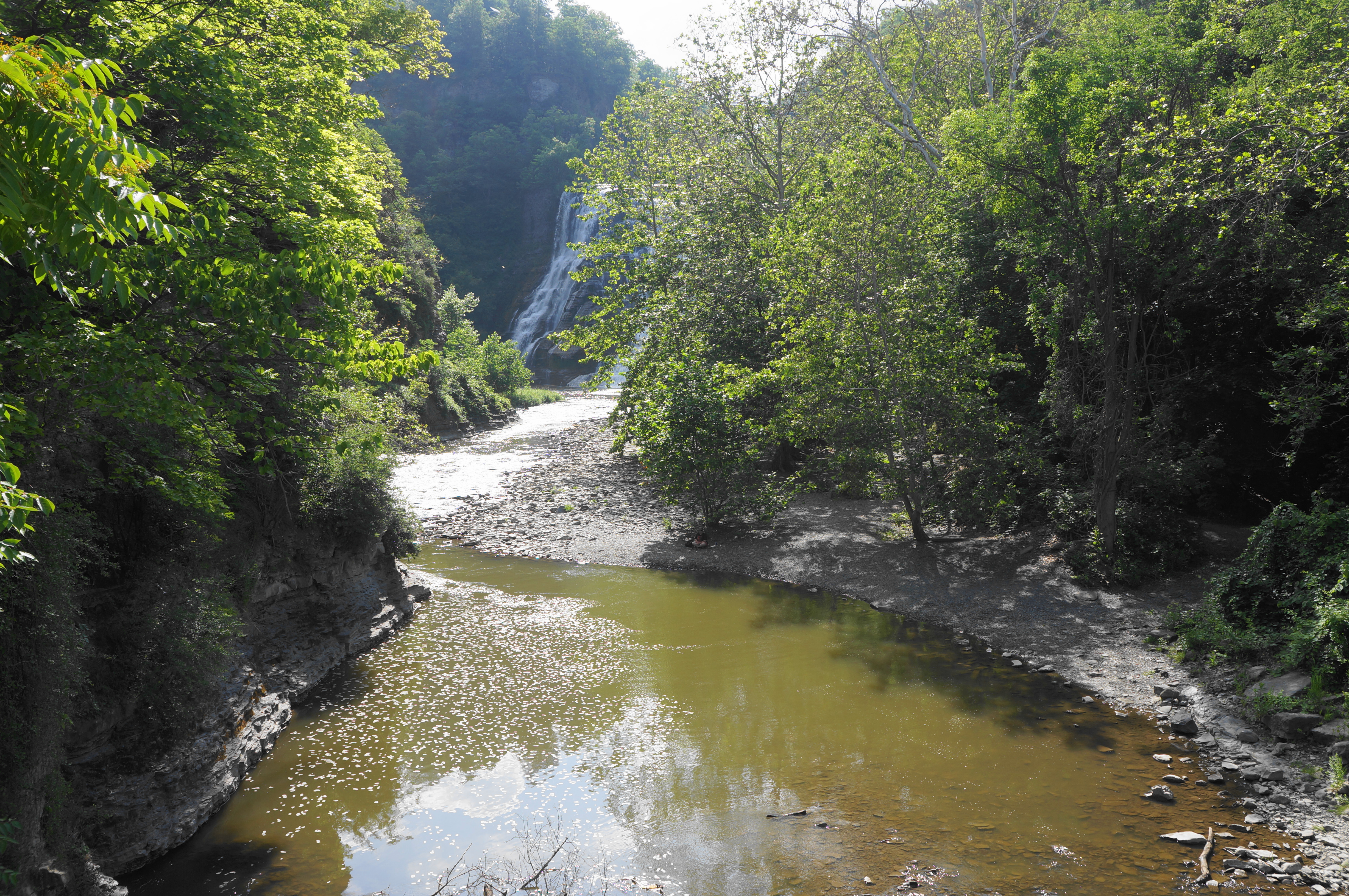 To access the falls, park along the road or in the parking lot at the corner of East Falls Street and Lake Street in northern Ithaca, just west of Cornell University. Plan to cross Lake Street and check out the bridge over Fall Creek, where one gets a first glimpse at the falls upstream. Informative waysides offer details on the history of the area, and a map suggests an additional route that continues to three other waterfalls in Fall Creek Gorge.
