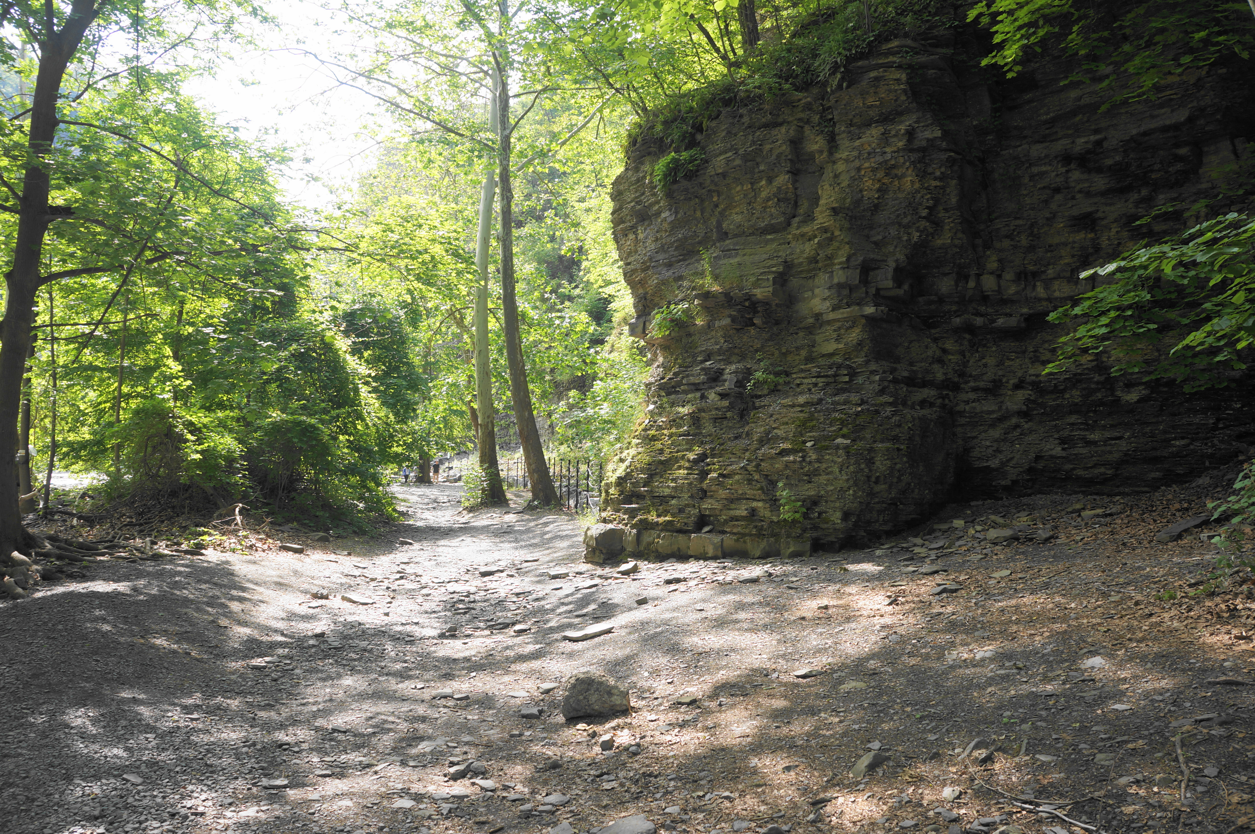 Working your way back to the south side of the creek, follow the gravelly track down to creek level; a quick diversion left offers access to the shoreline. The main trail, thinner now, continues eastward through a shady corridor, flanked by striated walls on the right.