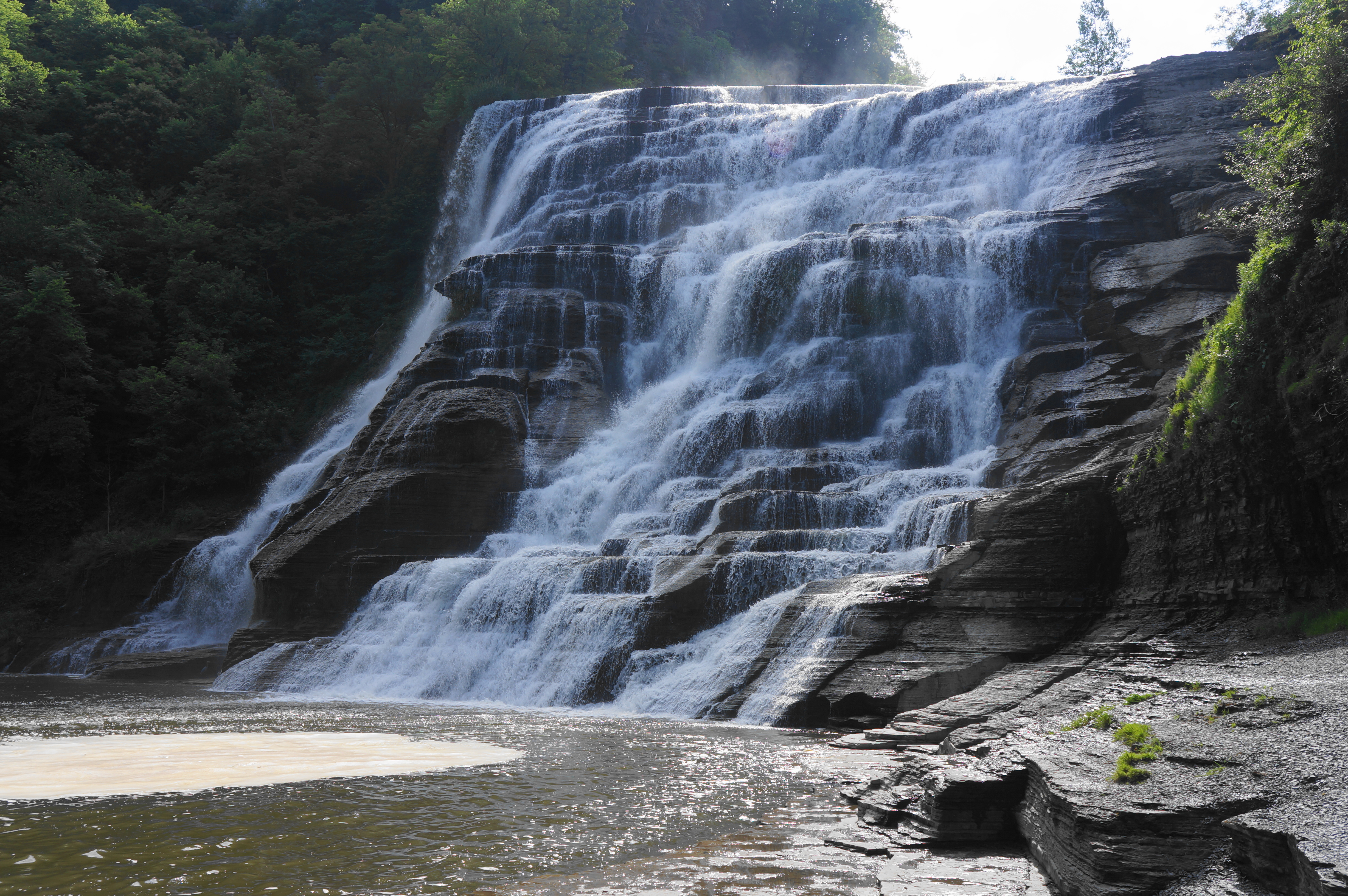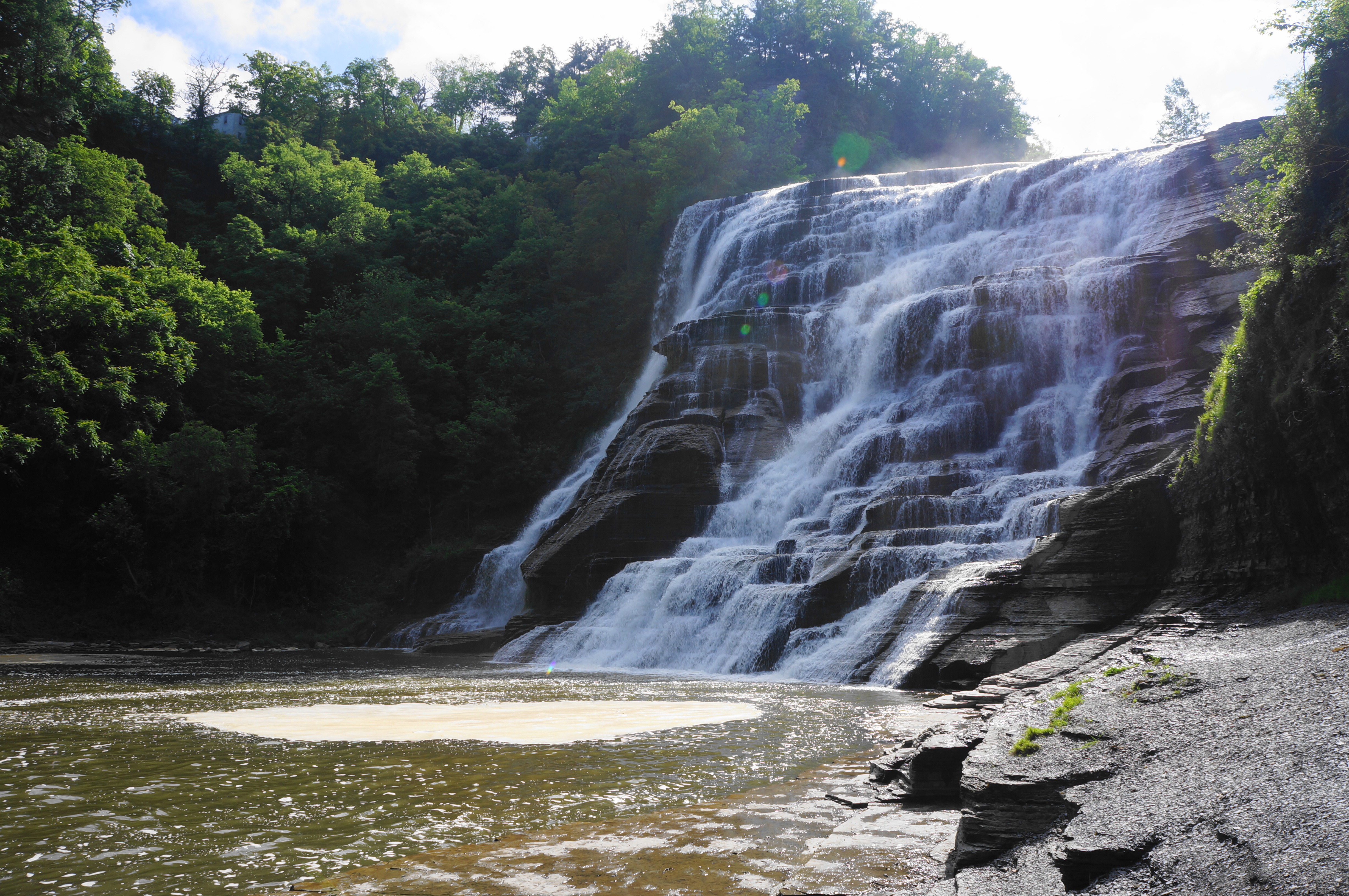 Soon the path emerges back into the sun, culminating at a stony landing where Ithaca Falls is on full display. Expect the greatest flow in spring or after heavy rains, with Fall Creek dropping a level to the large pool some 150 feet below. The beauty of such a powerful fall, so close to town, feels rather surreal, matched perhaps only by Hamilton, Ontario, the so-called “City of Waterfalls.” (Note: See an interesting collection of “urban waterfalls” here.)