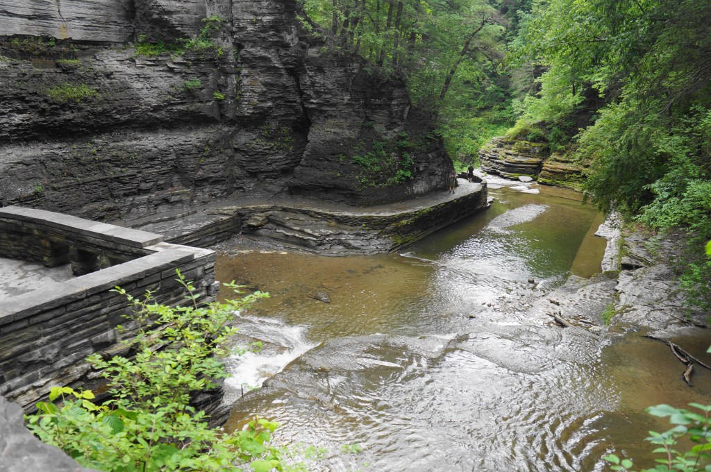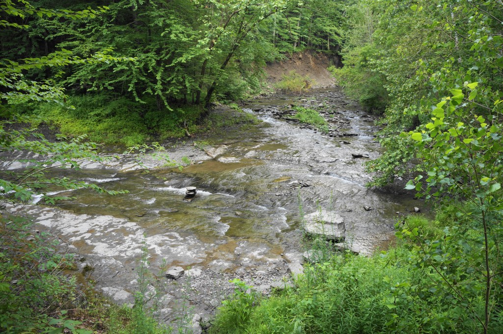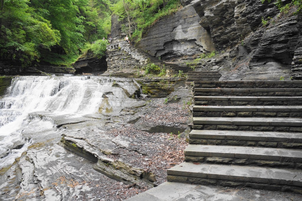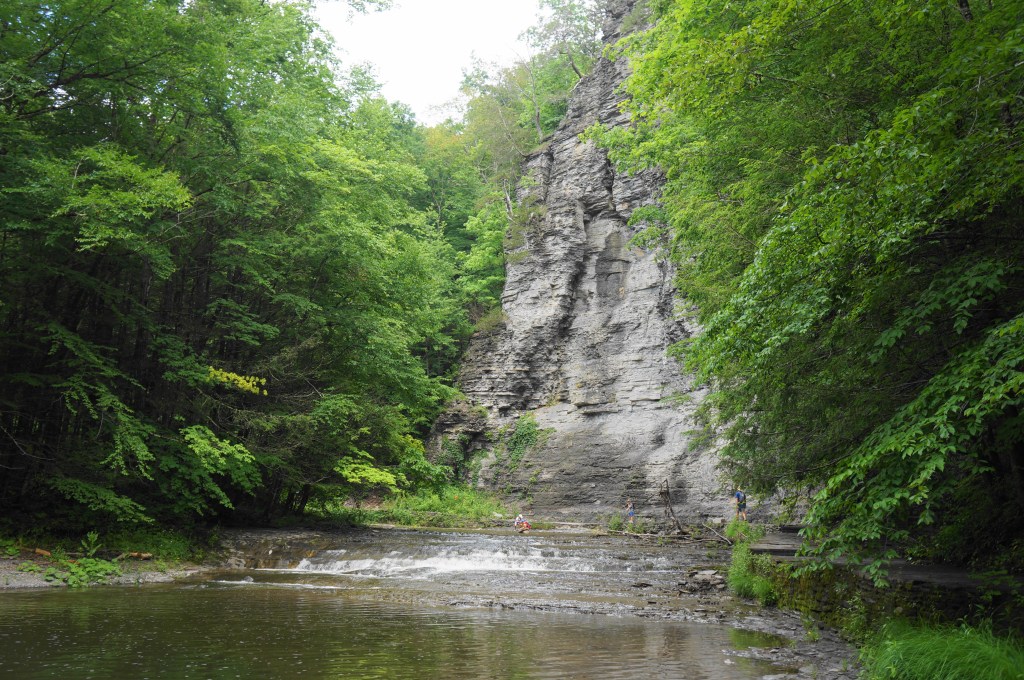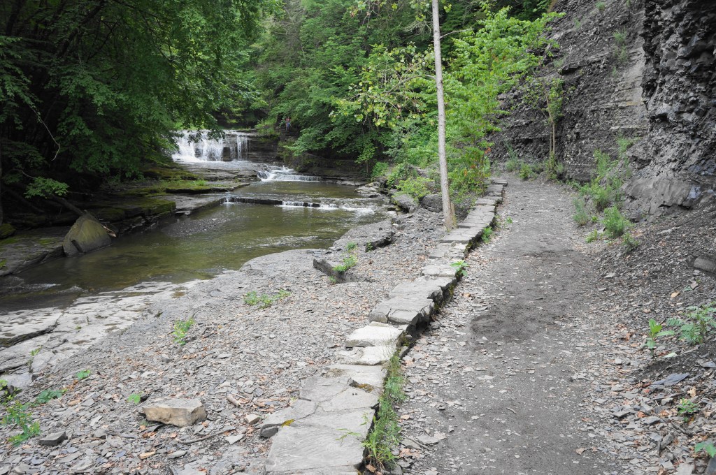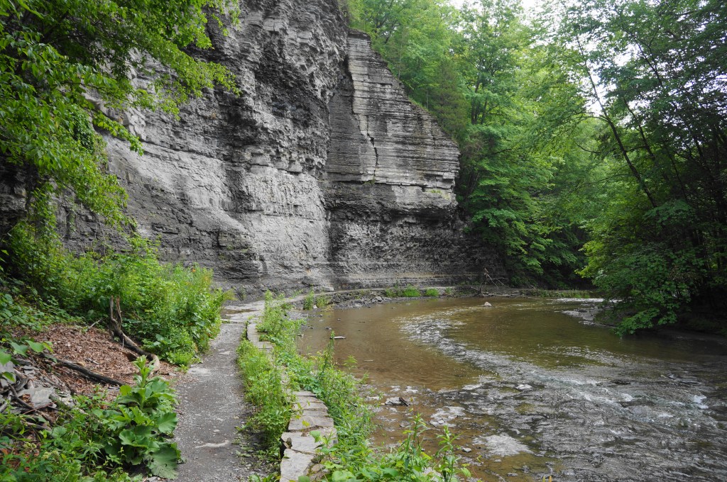 Soon after the junction, another, 10-foot falls can be viewed off to the left. The sight is followed by another, 5-foot plunge a minute later, with this one set below a trail bridge. Continue along Enfield Creek to a fork, where one could choose to cross the bridge, using it as a cutoff and connector to the Rim Trail—but doing so would be a tragedy, as some of central New York’s most stunning landscapes lie just ahead on the Gorge Trail continuation.