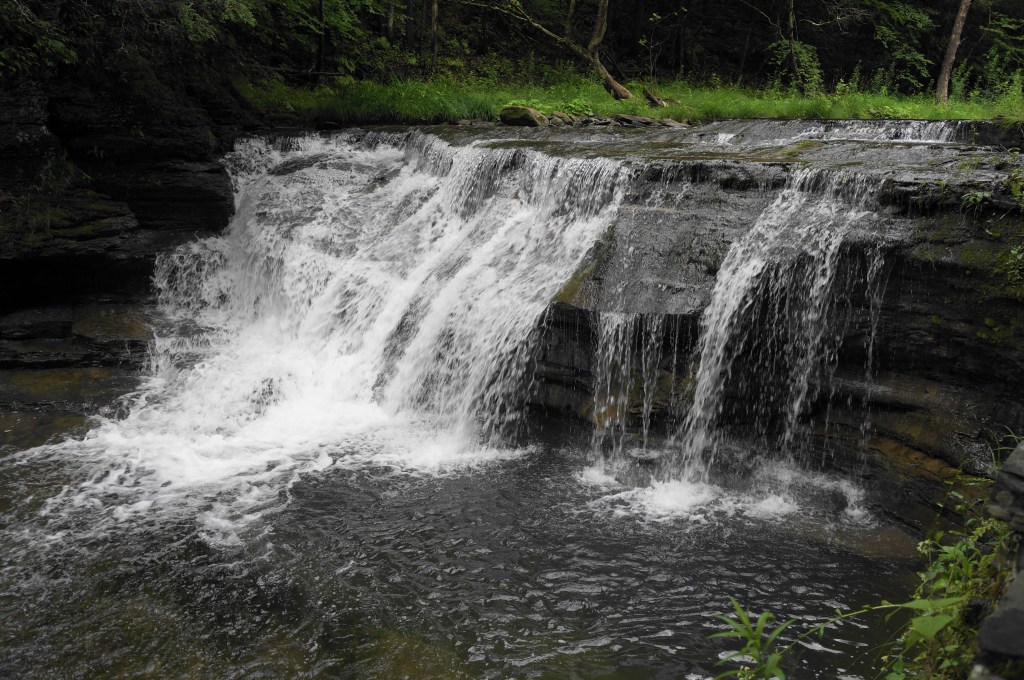 Look for the start of the Gorge Trail leaving the parking lot on the north side, just to the west of the Park Office and restrooms. Follow the signs and pass through the open, iron gate. The tread quickly turns to dirt as the Gorge Trail begins a steep ascent, assisted by switchbacks and four staircases—a quick wake-up call for hikers expecting an easy stroll in the park. After gaining the woody ridge, the track briefly levels at around 2/10 mile, with a fence paralleling the trail on the left. Even though Enfield Falls (Lower Falls) is roughly below, the dense foliage (at least in summer) obscures views of the waterfall and swimming hole.