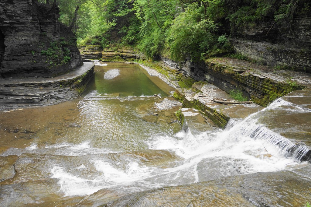 Continue up a set of staircases to reach the top of Lucifer Falls, after which Enfield Glen narrows even further. Stone steps and a bend in the trail lead to views of another impressive falls, this one about 15-20 feet in height. As one climbs to the top of this falls, look back at the surprisingly rectangular waterway—an effect that is also repeated in the pool around the next corner.