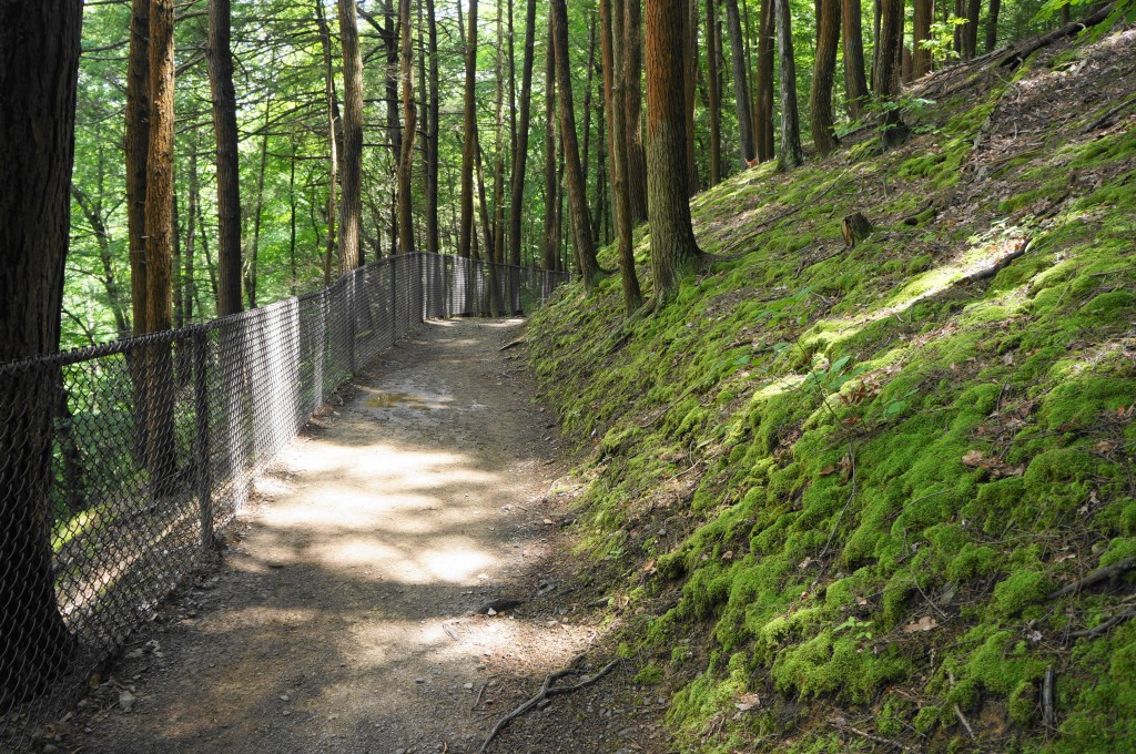 At about 7/10 mile, hikers come across another uphill stairway—this one numbering exactly 100 steps. It is followed quickly by a second staircase of 71. Now well above the glen, the trail dips up and down—again partly asphalted—on a roughly westward trajectory. The crumbly path, flanked on either side by a chain-link fence, traverses a thin ridge at 0.85 mile. The trail then drops to what appears to be an overlook—but views of the now-quick-flowing creek below are again obstructed by the summer foliage.