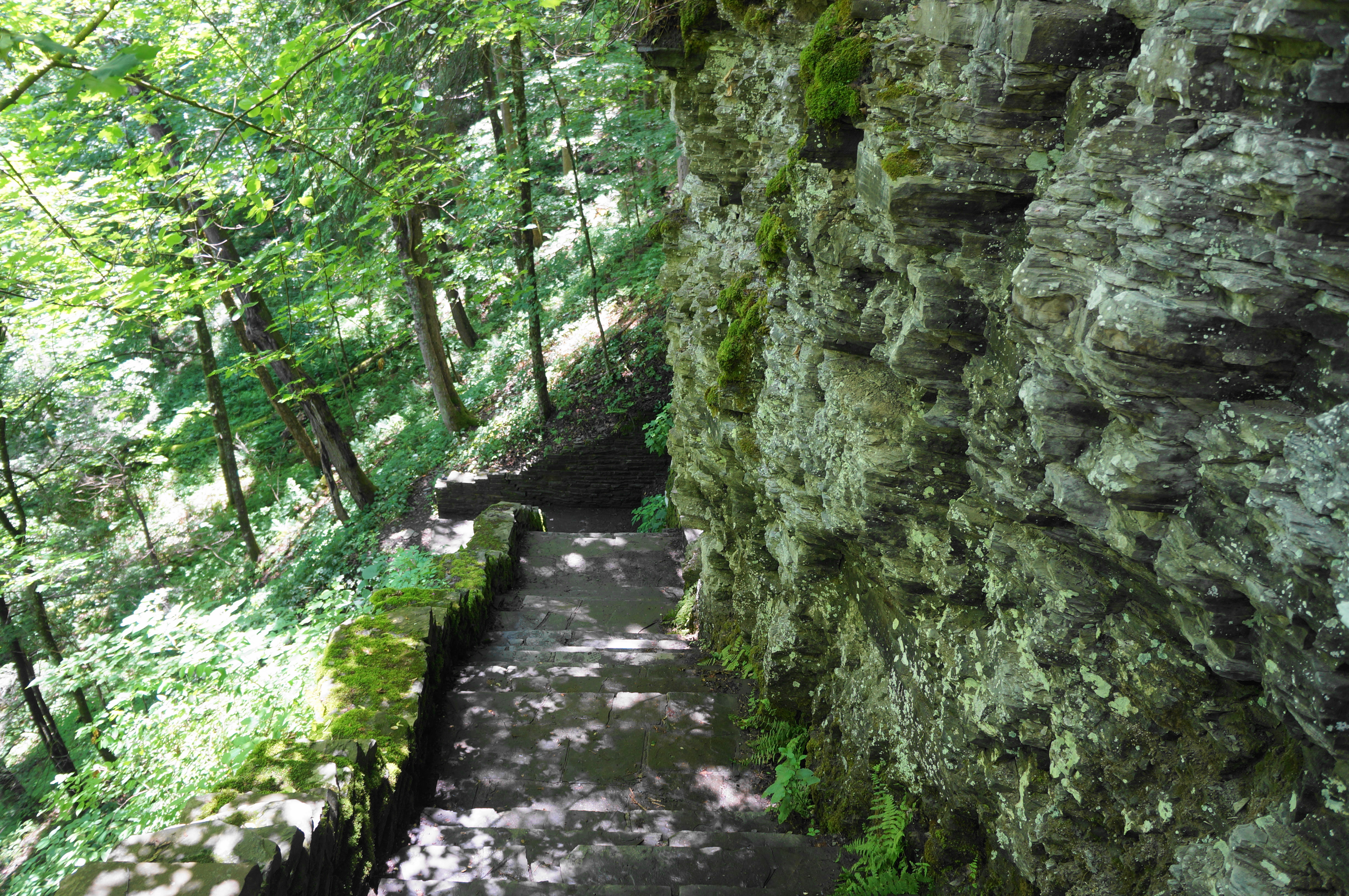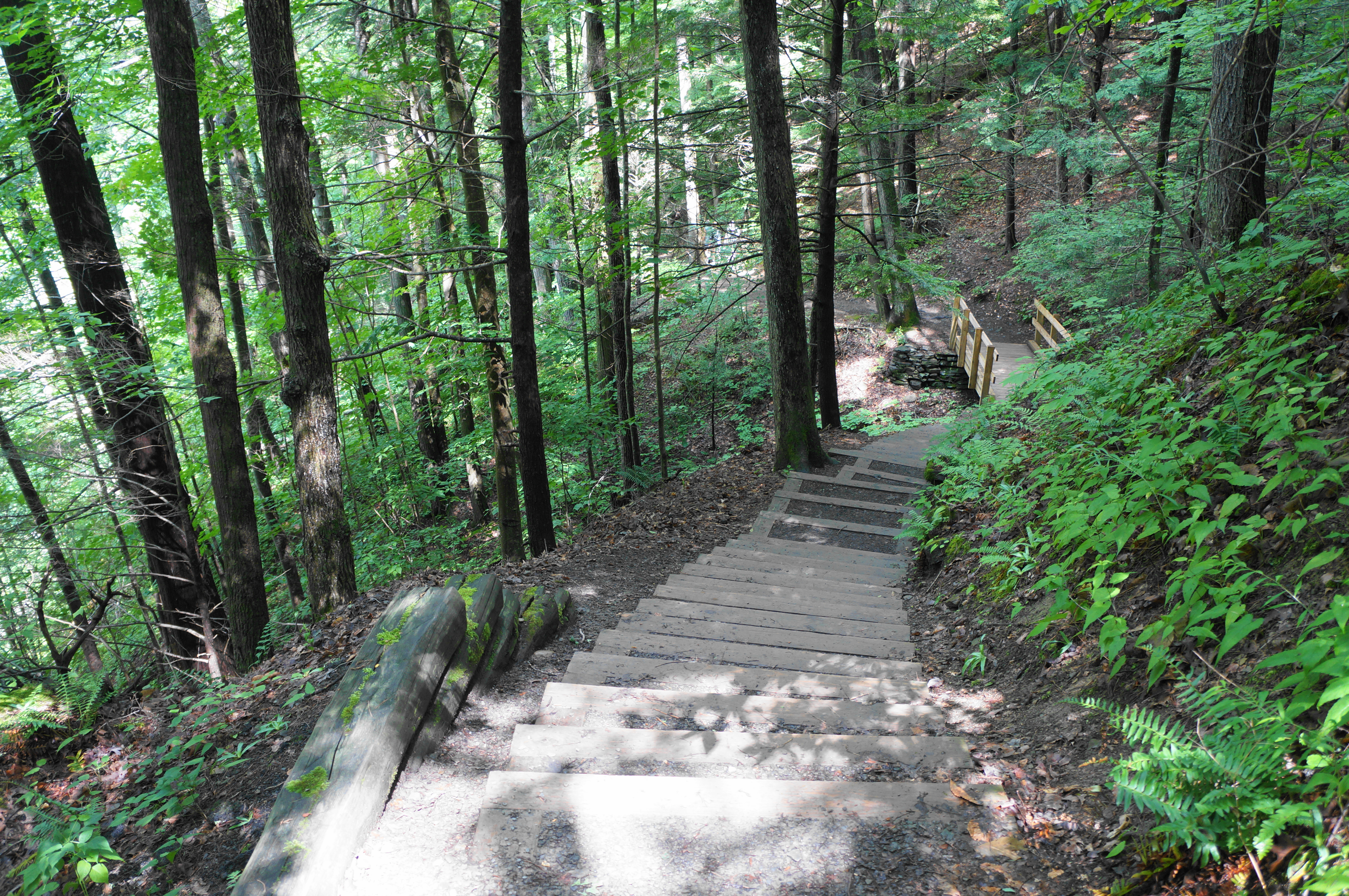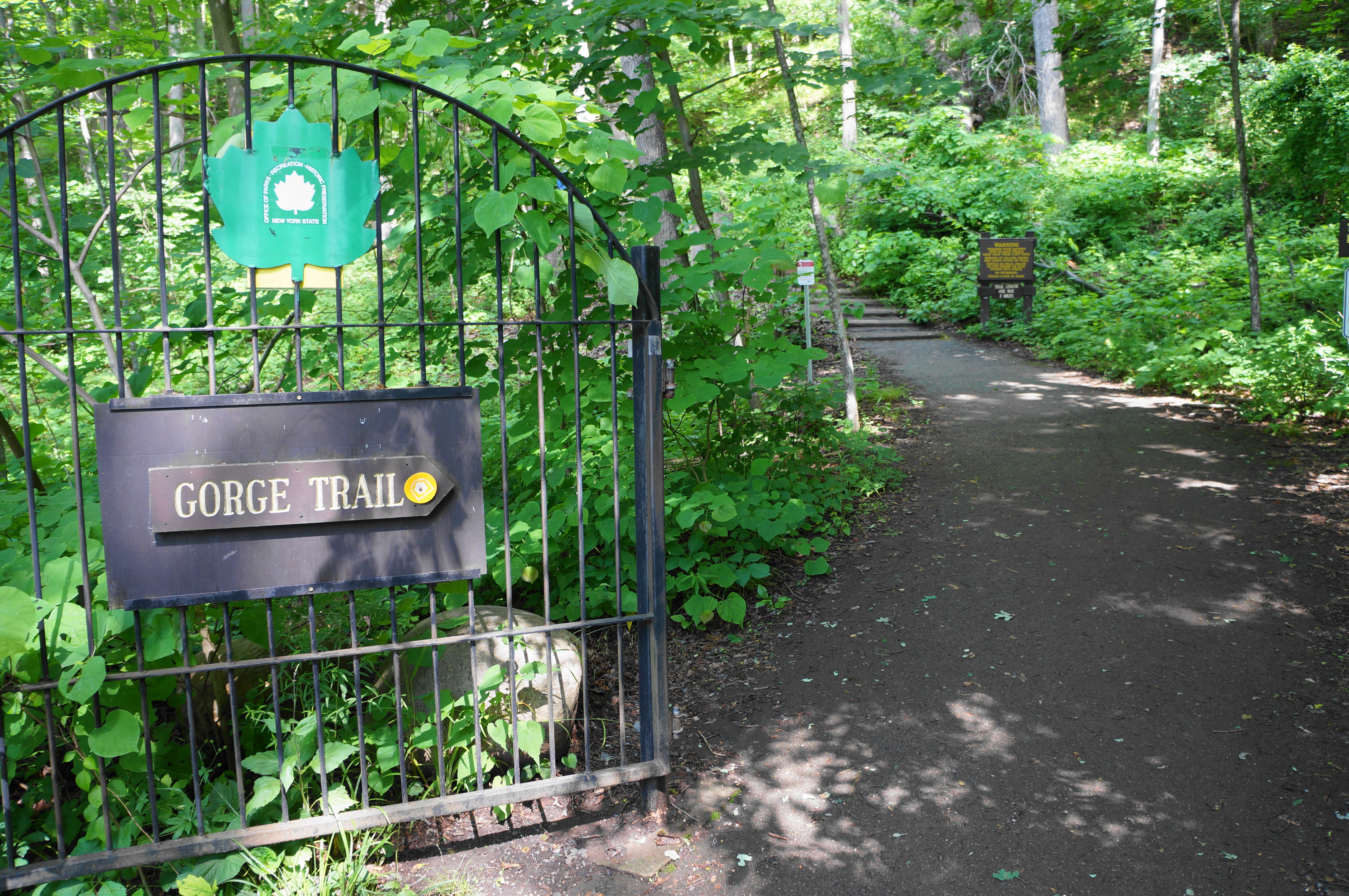 Look for the start of the Gorge Trail leaving the parking lot on the north side, just to the west of the Park Office and restrooms. Follow the signs and pass through the open, iron gate. The tread quickly turns to dirt as the Gorge Trail begins a steep ascent, assisted by switchbacks and four staircases—a quick wake-up call for hikers expecting an easy stroll in the park. After gaining the woody ridge, the track briefly levels at around 2/10 mile, with a fence paralleling the trail on the left. Even though Enfield Falls (Lower Falls) is roughly below, the dense foliage (at least in summer) obscures views of the waterfall and swimming hole.