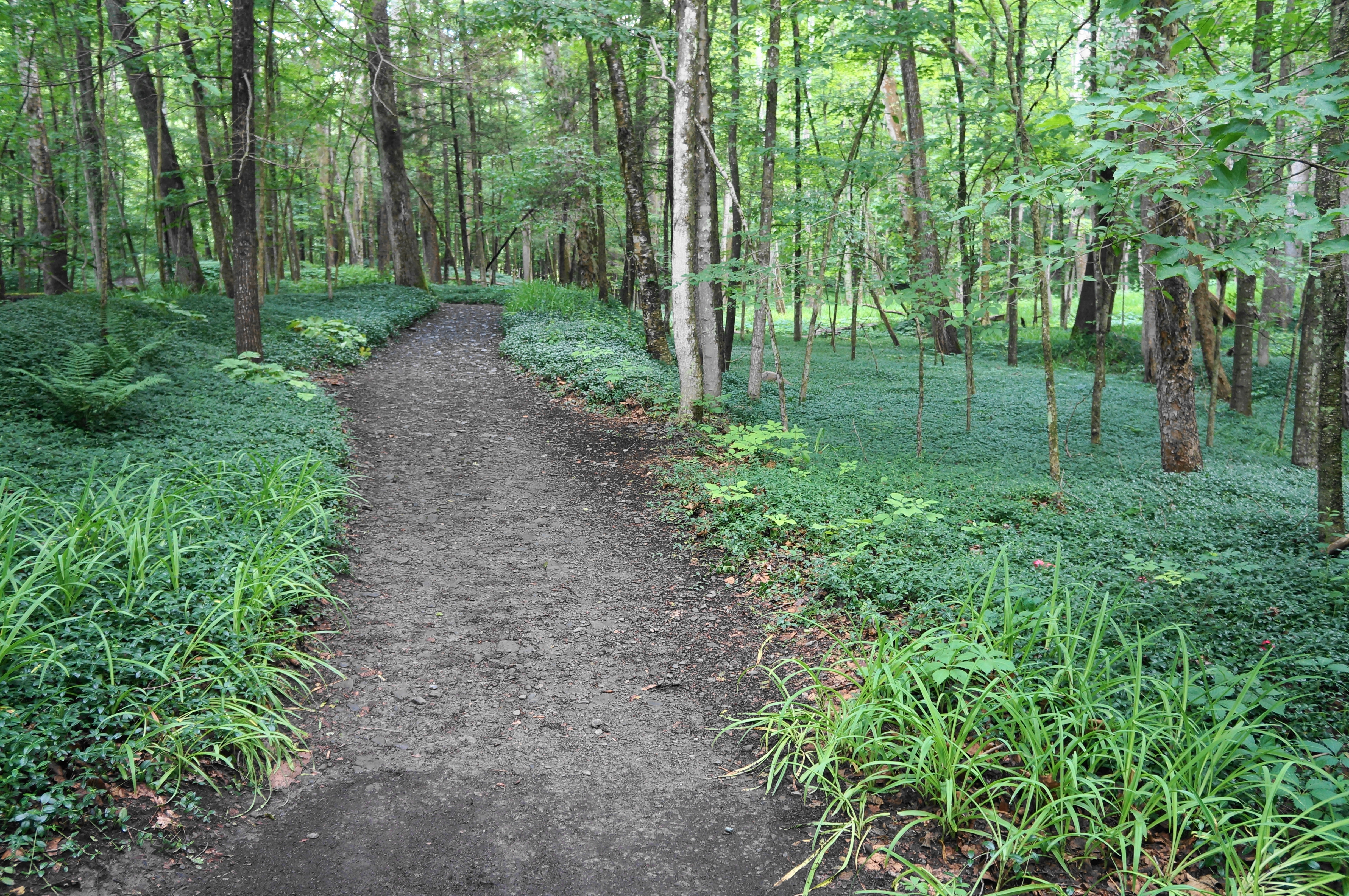 Around the corner and down a well-crafted stone staircase, the views are better—but Enfield Creek is still cruising at a mild ripple here, a far cry from the roaring cascades that hikers will see soon enough. Before then, however, is a floodplain where the ground is carpeted with greenery. This beautiful section is peaceful and lush, and the pathway is wide and largely level as it passes the halfway point for the 2.2-mile Gorge Trail. Stay left as a service road enters from the right.