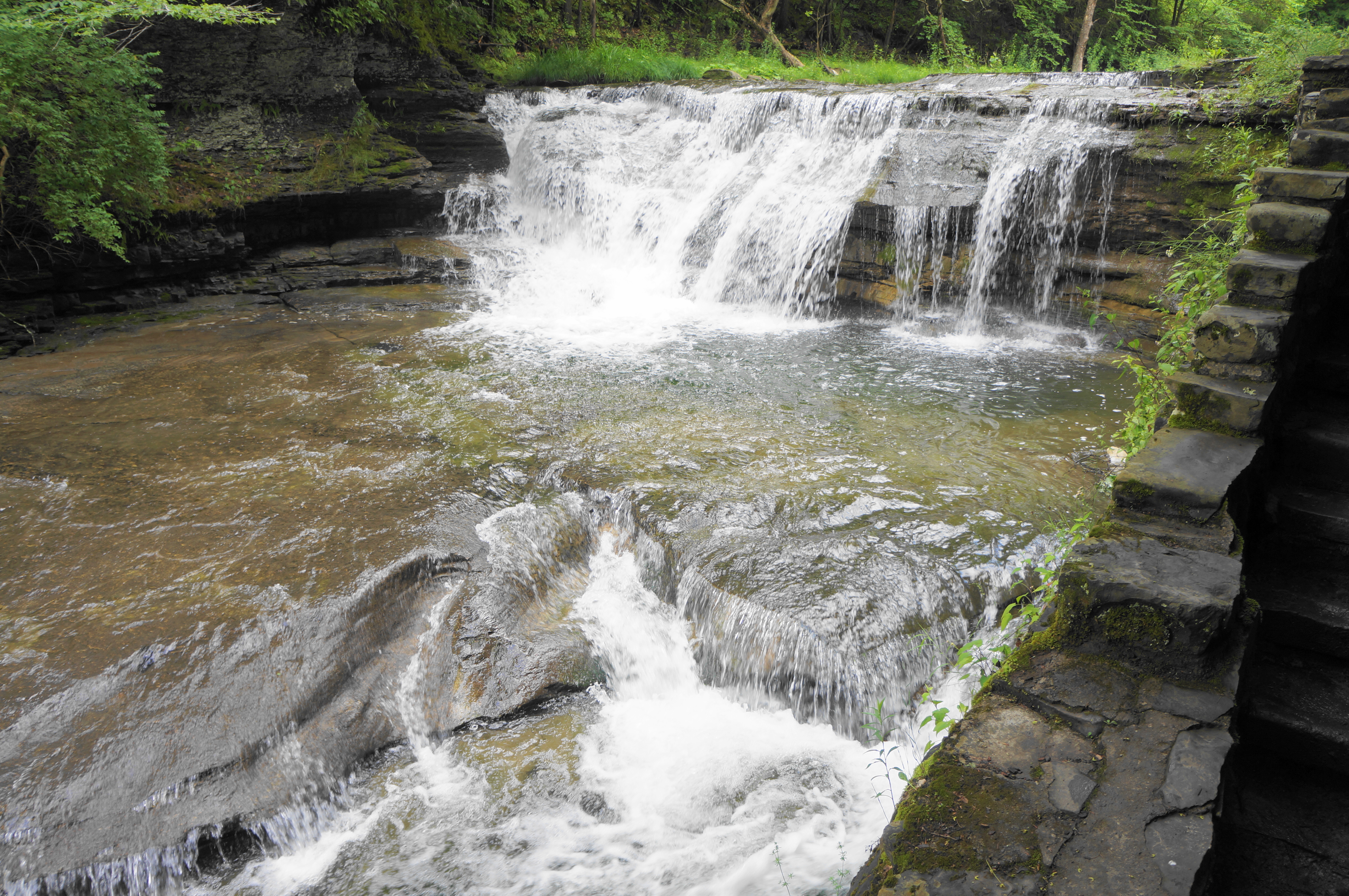 Continue up a set of staircases to reach the top of Lucifer Falls, after which Enfield Glen narrows even further. Stone steps and a bend in the trail lead to views of another impressive falls, this one about 15-20 feet in height. As one climbs to the top of this falls, look back at the surprisingly rectangular waterway—an effect that is also repeated in the pool around the next corner.