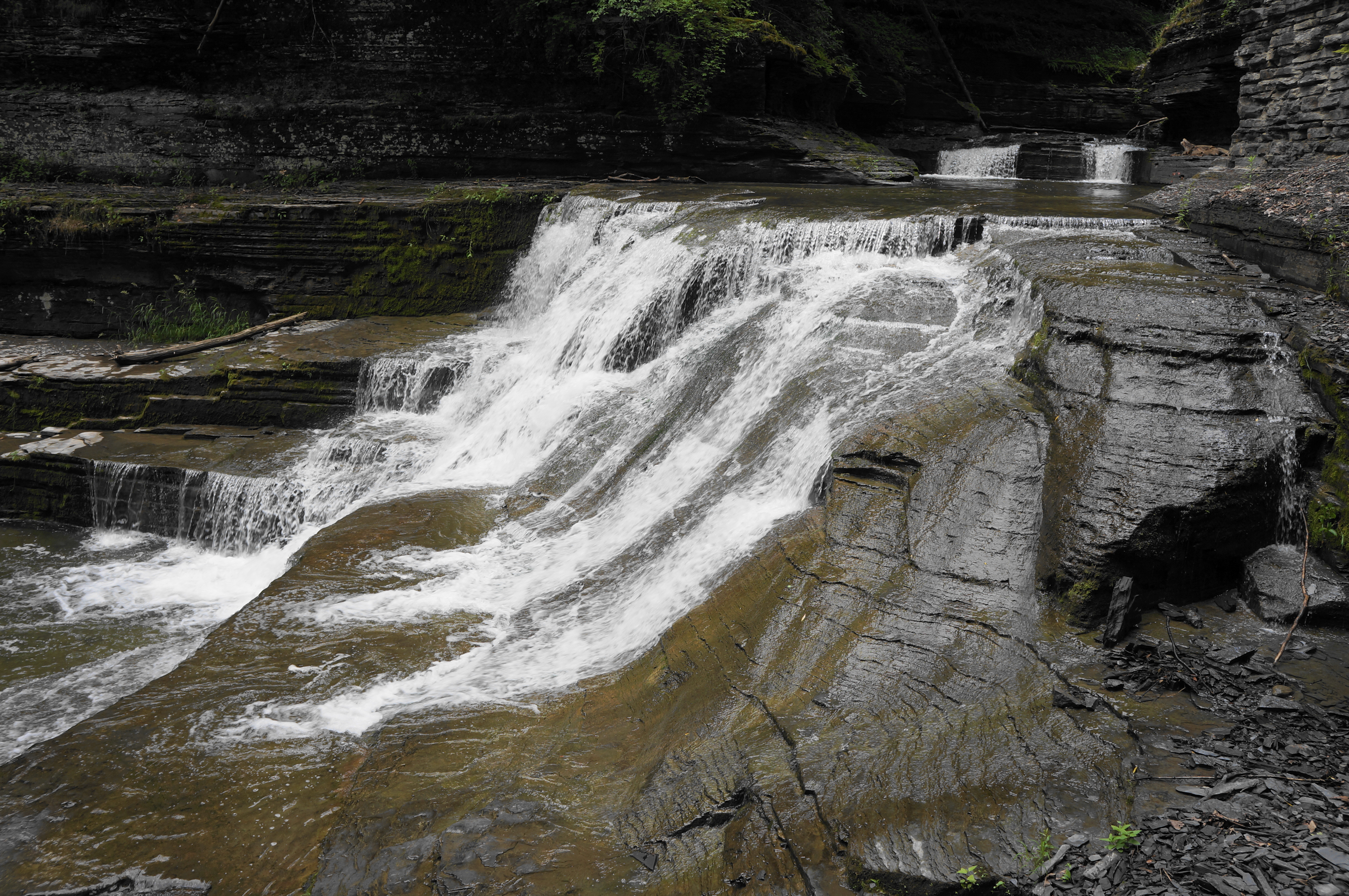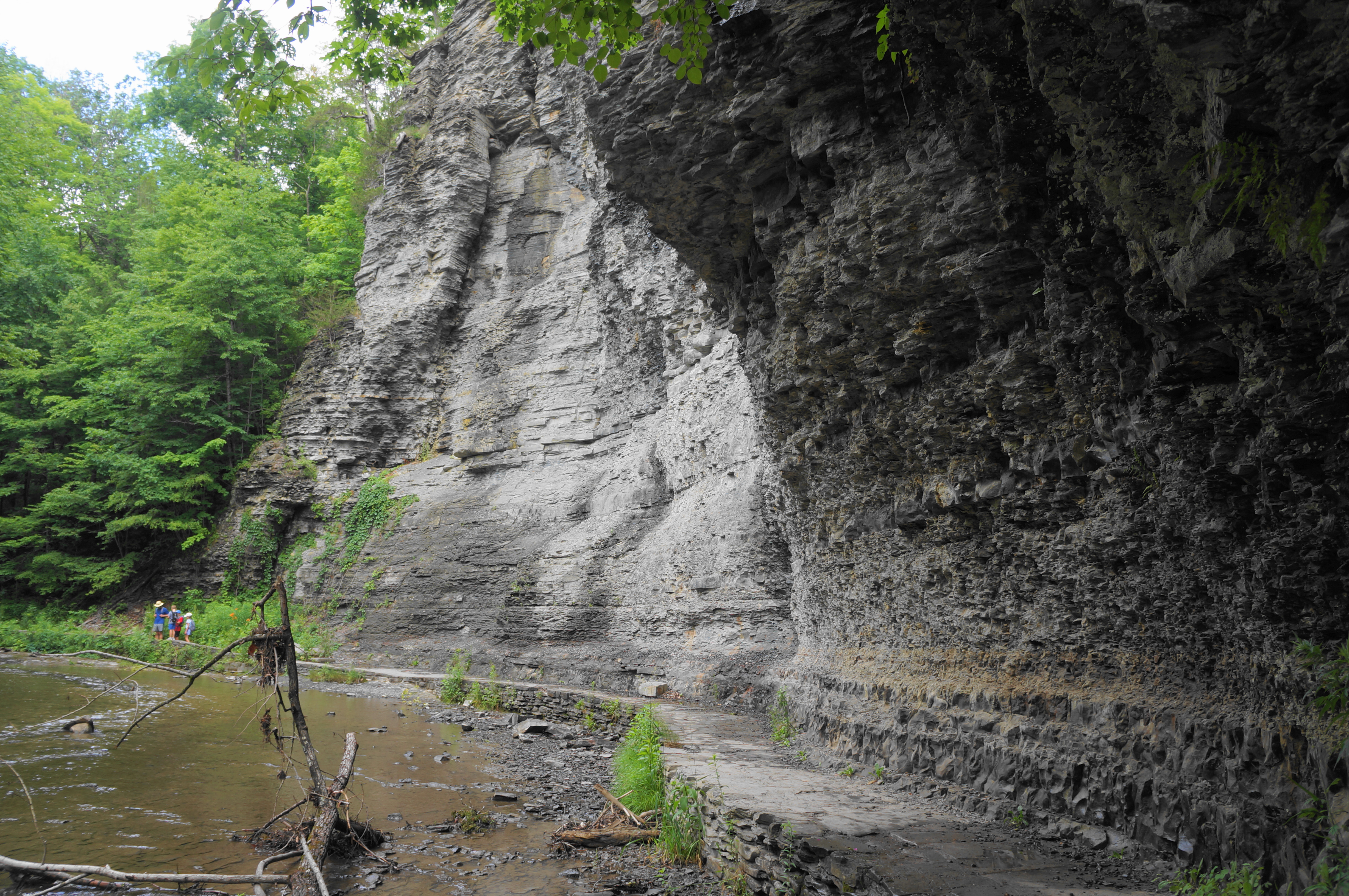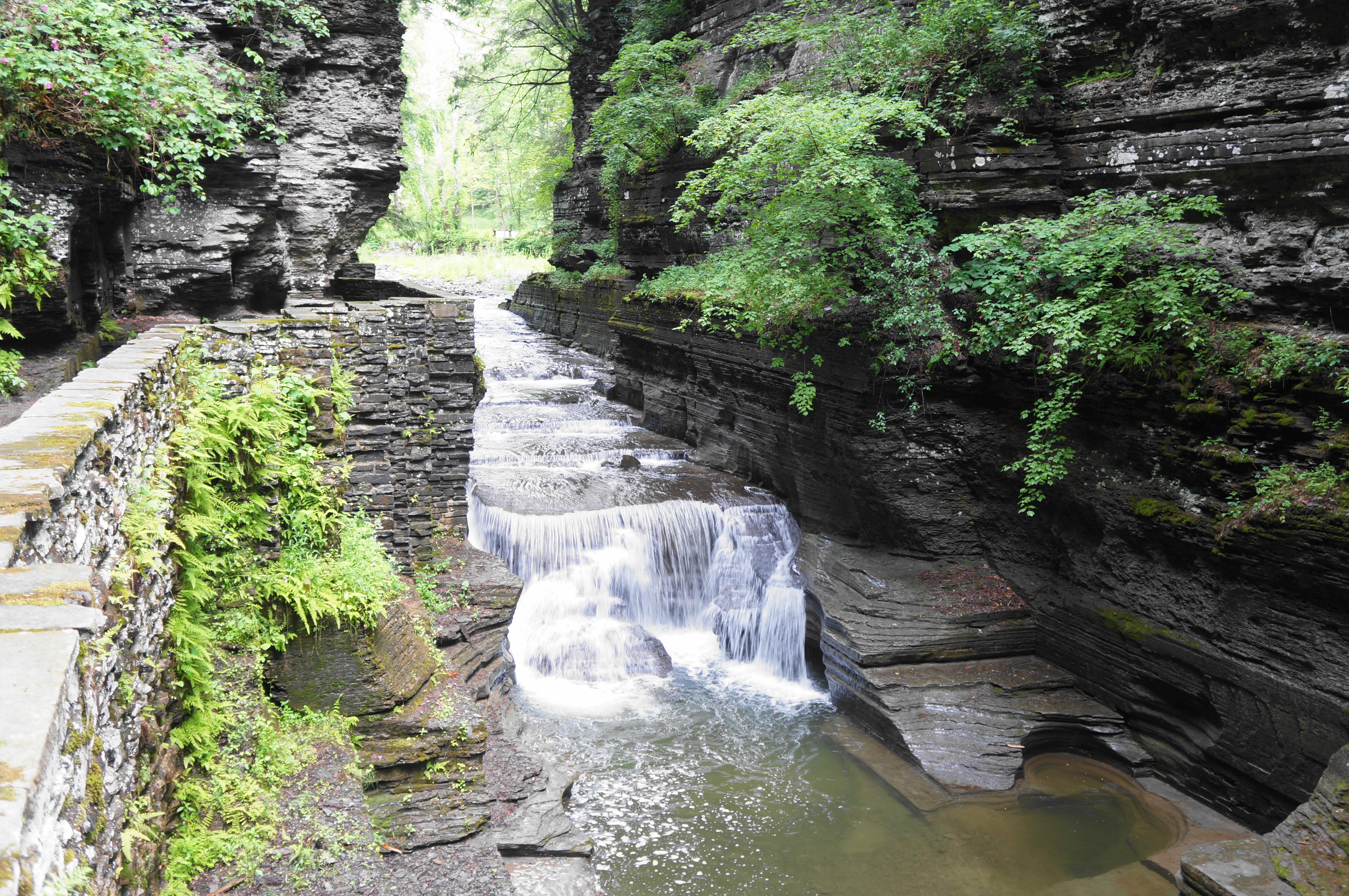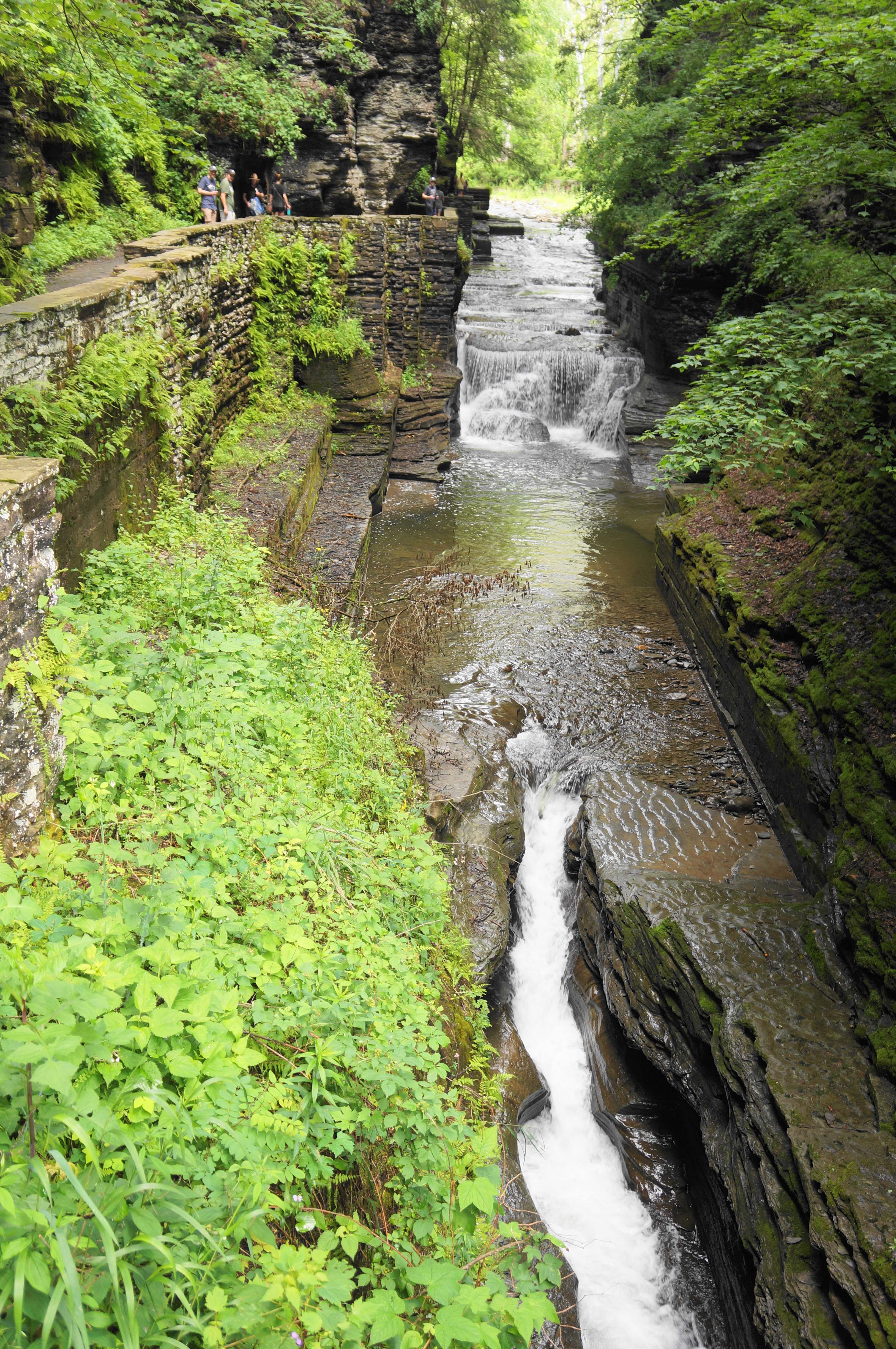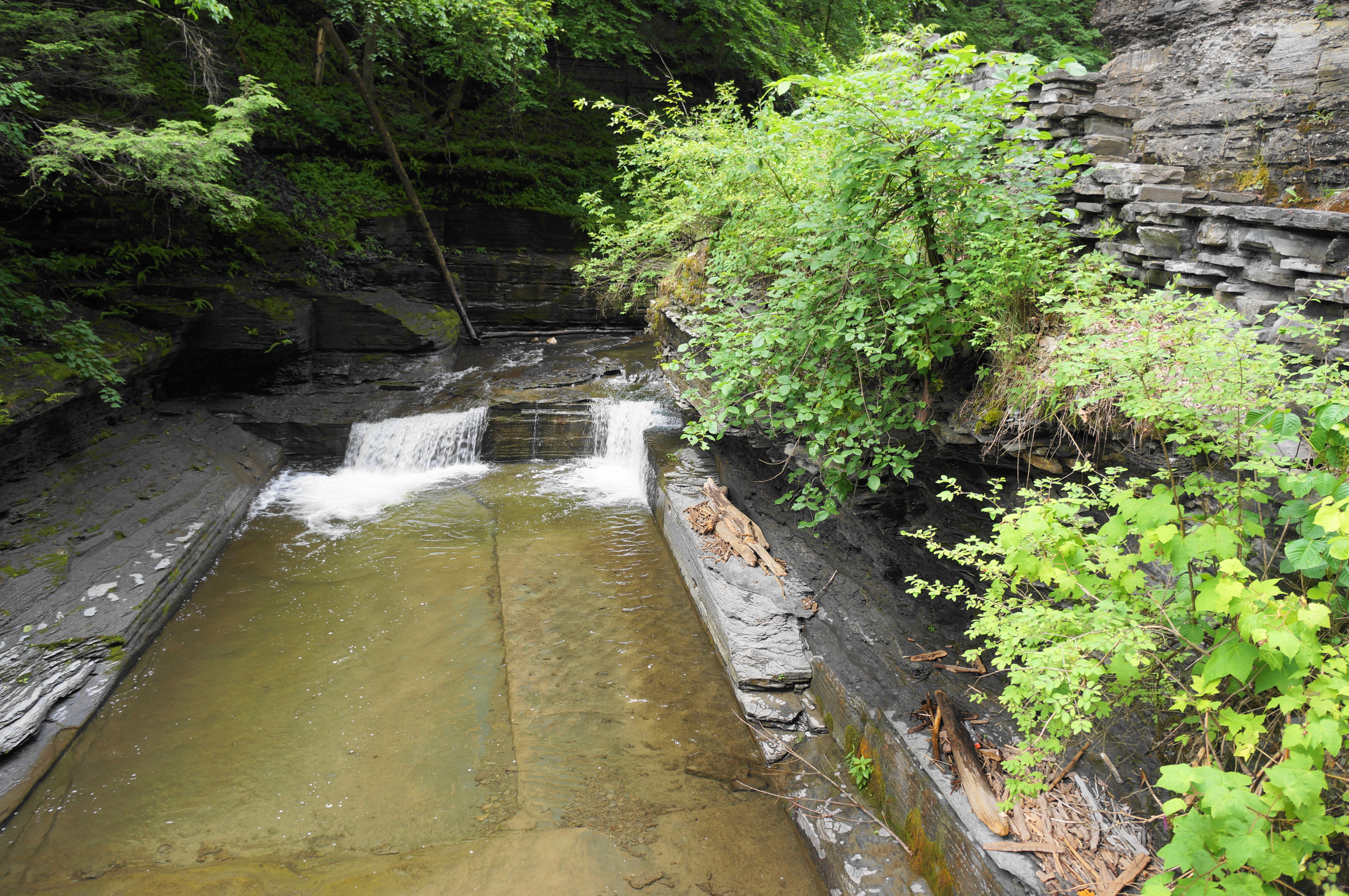 Soon after the junction, another, 10-foot falls can be viewed off to the left. The sight is followed by another, 5-foot plunge a minute later, with this one set below a trail bridge. Continue along Enfield Creek to a fork, where one could choose to cross the bridge, using it as a cutoff and connector to the Rim Trail—but doing so would be a tragedy, as some of central New York’s most stunning landscapes lie just ahead on the Gorge Trail continuation.