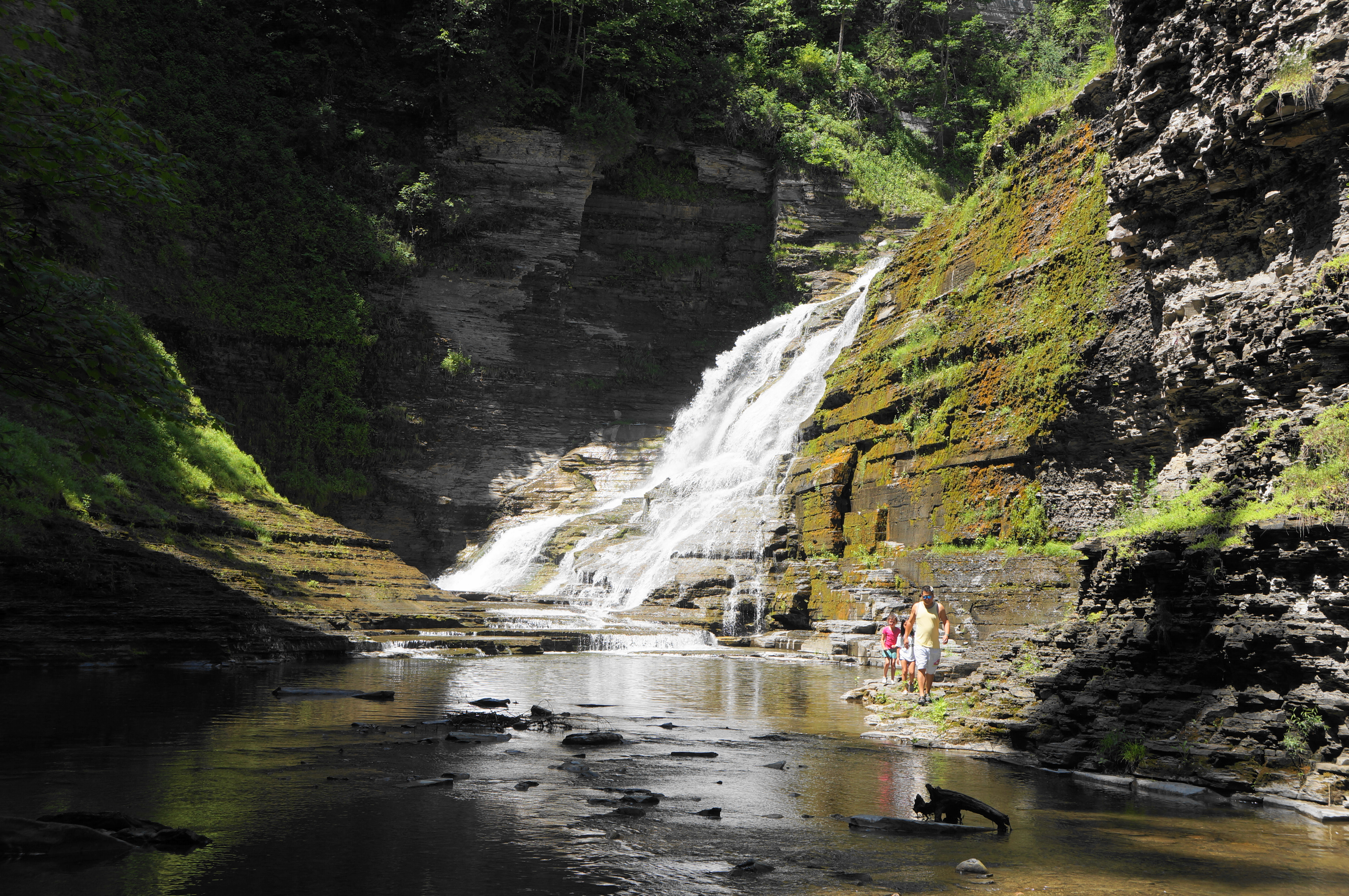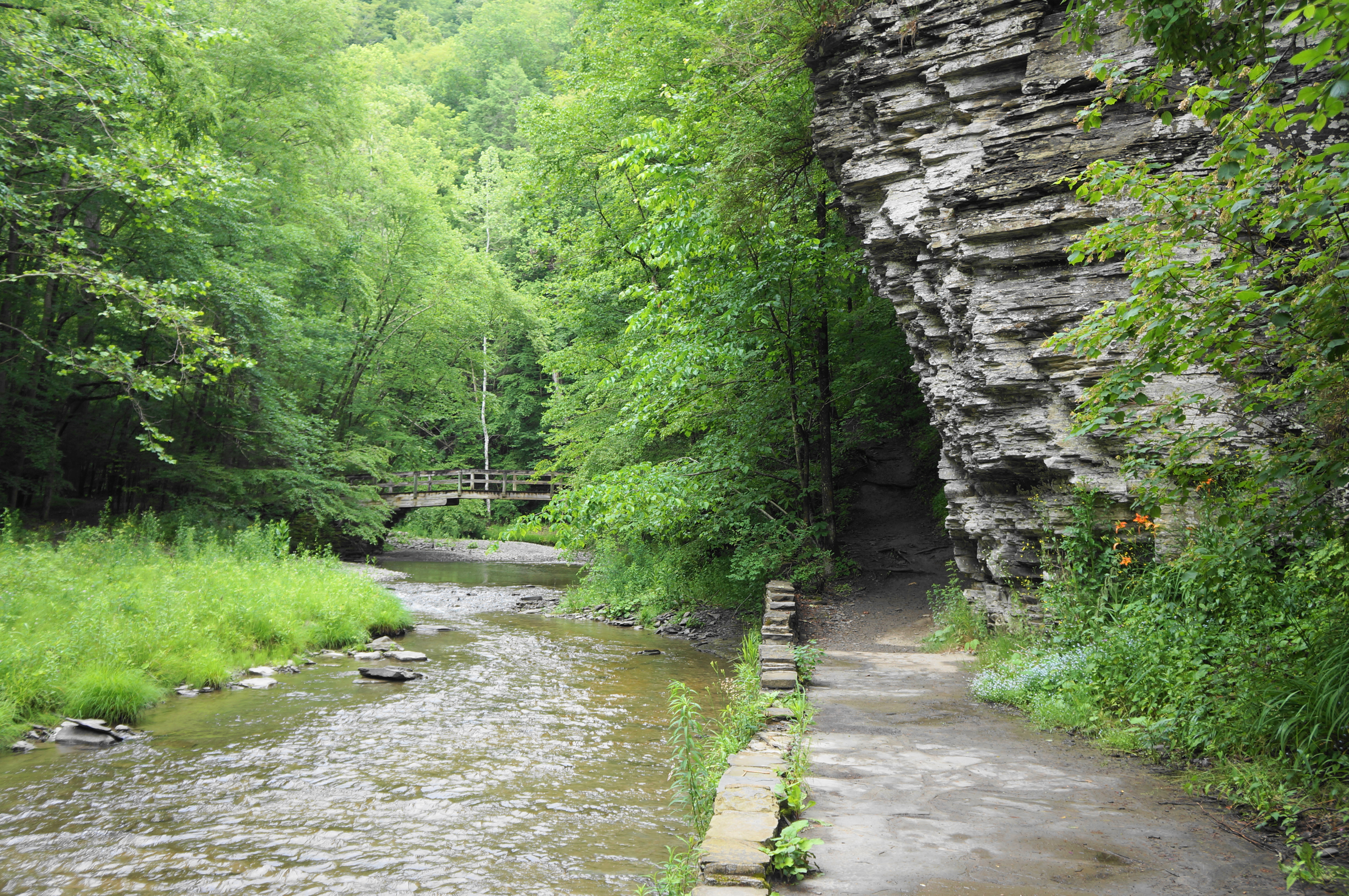 Uplift, receding glaciers, and subsequent erosion have blessed central New York with terrific stone gorges, many containing rushing waters and dramatic waterfalls that drain into the 11 Finger Lakes. Enfield Glen, one such canyon, is the centerpiece of Ithaca’s Robert H. Treman State Park—an 1,100-acre haven for falls-seekers that also features towering walls, dark chasms, and beautiful pools. Visitors can enjoy swimming at the base of 30-foot Enfield Falls (a.k.a. Lower Falls or Treman Falls), but the best hiking is in the upper canyon at and above Lucifer Falls, a 115-foot, high-volume stunner. While shorter options exist, a full, 4.4-mile loop combining the Gorge and Rim Trails offers the most fulfilling hiking experience in the park.