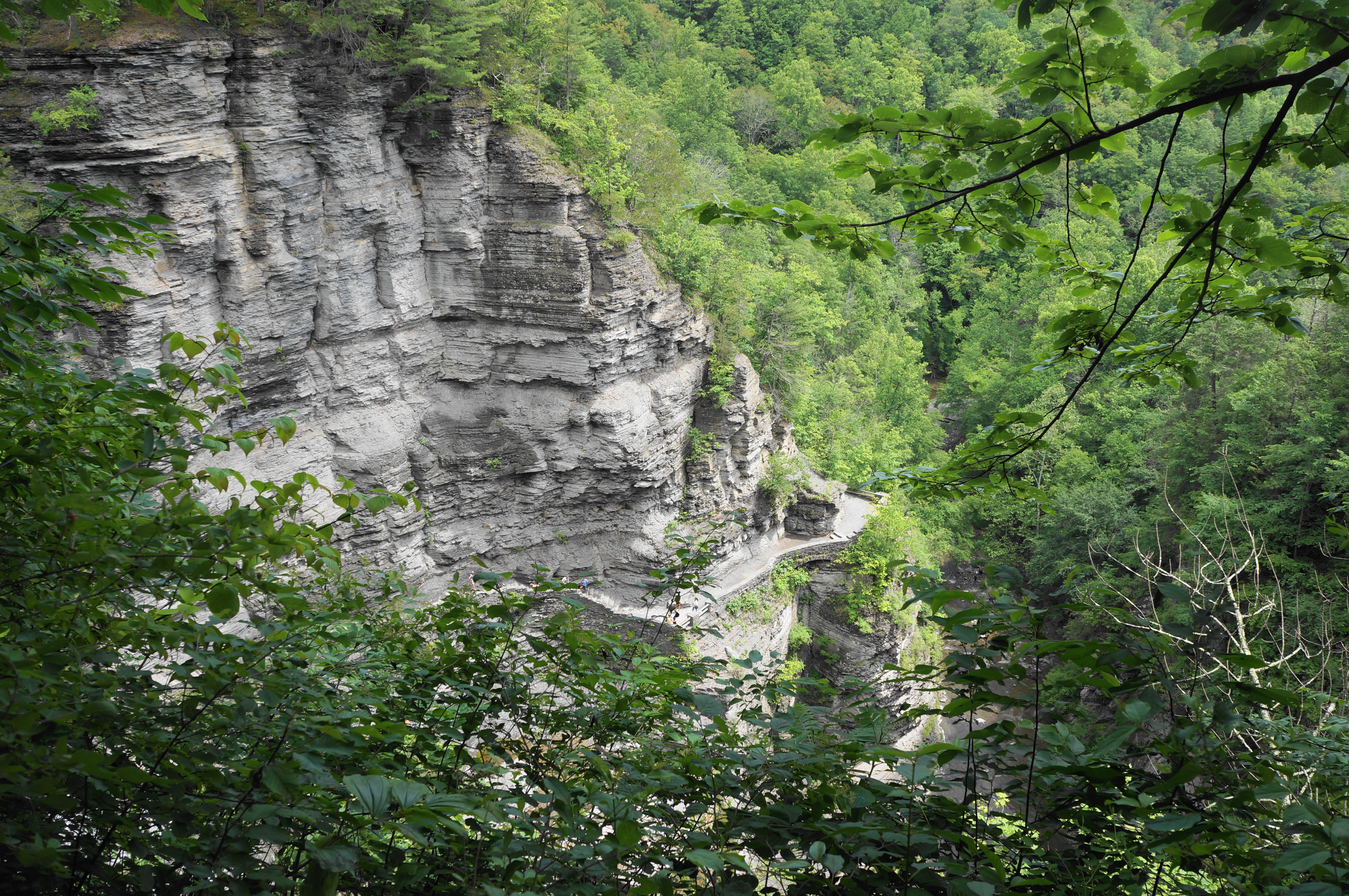 A short use trail meets back up with the main Rim Trail, which proceeds to round a side ravine high above Enfield Glen. Continue on a steady downhill until reaching the next overlook—a proper one this time, where a break in the tree cover offers a nearly-full look down at the entirety of Lucifer Falls. The sight of tiny specks on the Gorge Trail—the parade of hikers on a weekend afternoon—put the grand heights of the waterfall in perspective. The overlook offers an excellent spot to stop for a snack before the rest of the journey back to the start.