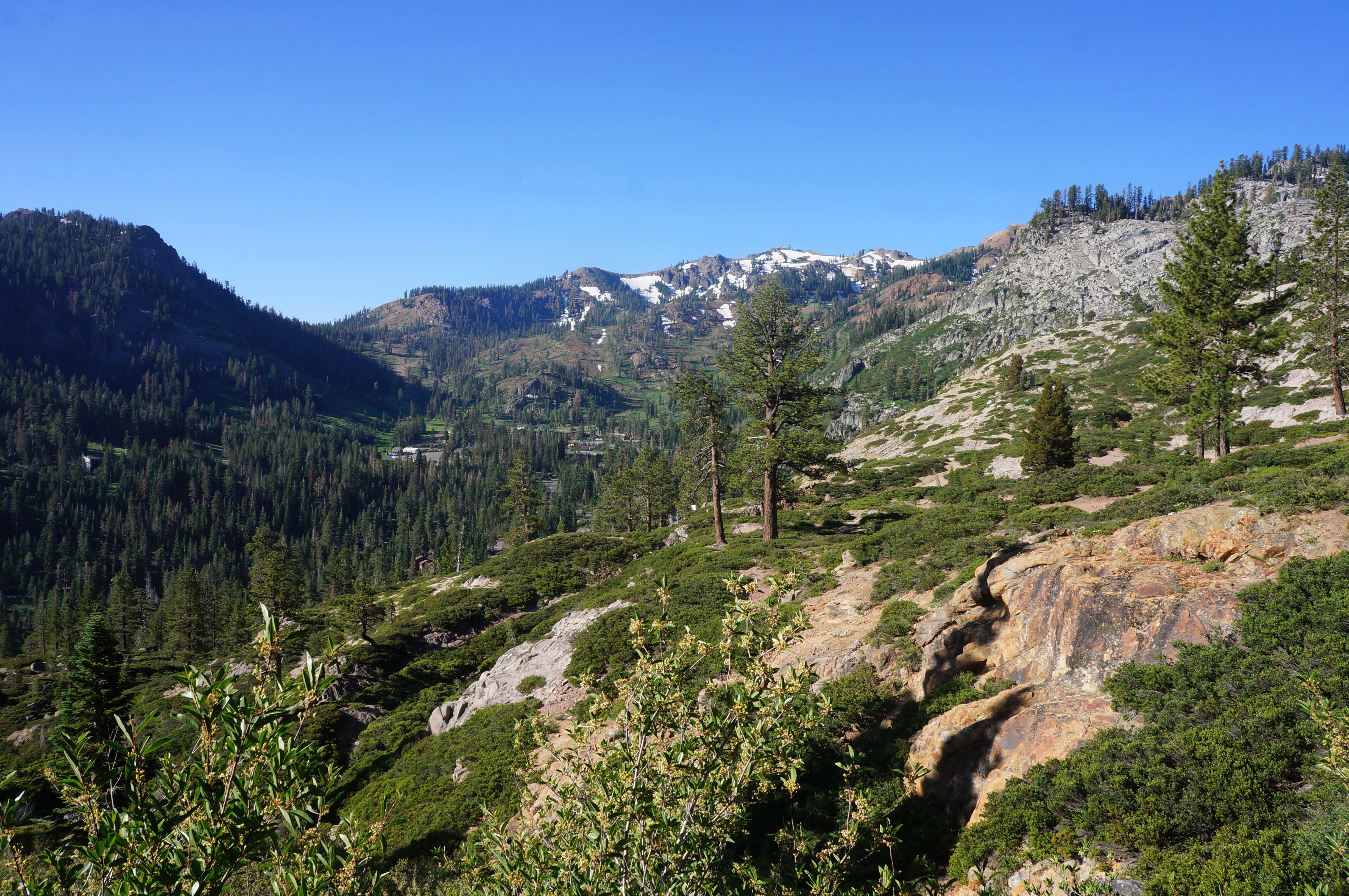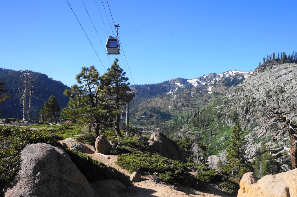 Take a breather at a shady spot below Jeffrey pines at 3/10 mile, then continue into the sun again as the Five Lakes Trail winds and bends through the hearty manzanitas. The gondola connecting the Alpine Meadows and Palisades Tahoe Resorts soon becomes visible ahead, set above a patchy green hillside. After a relatively mild section, the trail ascends a tougher set of switchbacks, rounds a tributary drainage, and continues to rise.