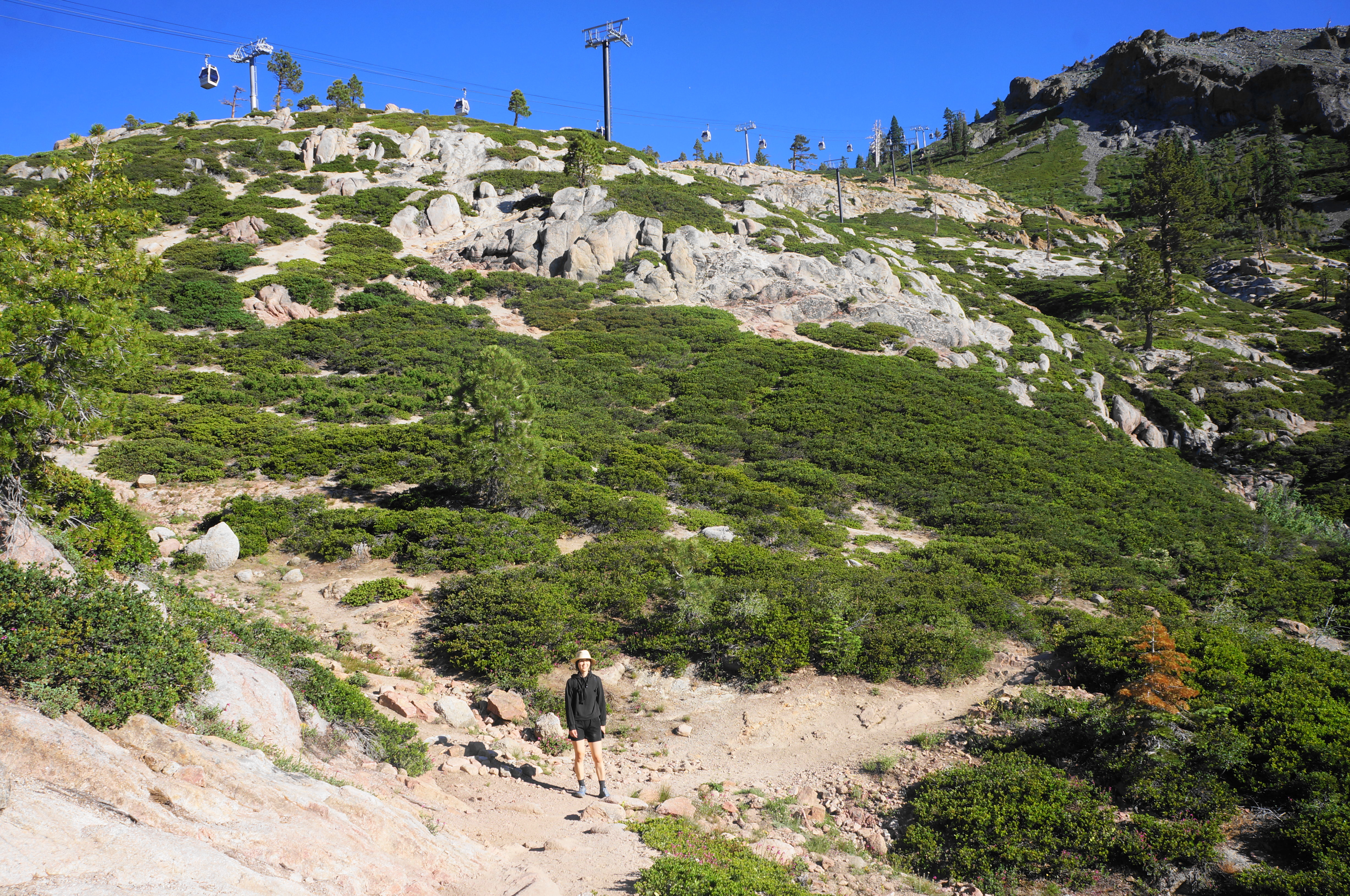 Take a hard right while passing under a seemingly unused ski lift, rising up to a crest with excellent mountain views and a look up at the Palisades Tahoe gondola. The drainage to the west is impressive for its craggy texture and beautiful, varnished granite. Beyond, in the distance, one can see the tops of Washeshu Peak (8,885’). Looking back southward, hikers can see through the gap between Ward and Scott Peaks to the continuing divide beyond.