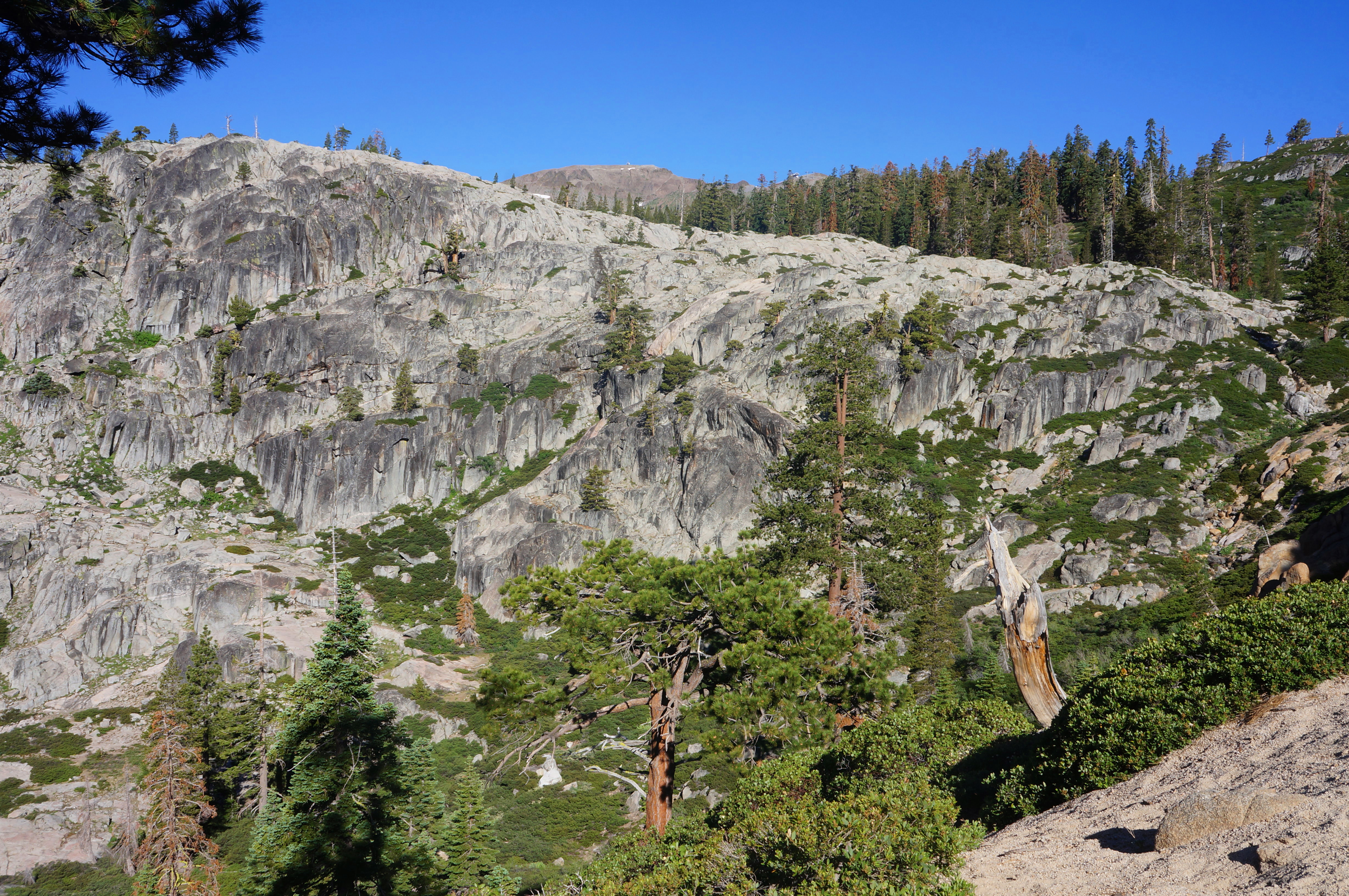 The Five Lakes Trail begins on the north side of the road, immediately traversing a deep-cut tributary, then beginning a steady ascent, which will not relent until the saddle bearing Five Lakes. While white firs and Jeffrey pines can be found in sporadic bunches, the majority of the climb is in full sun—making for a hot summer hike and a wake-up call for those anticipating a leisurely stroll. The foliage is more stunted as hikers ascend the windswept hills, with open views back eastward toward the Truckee River drainage.
