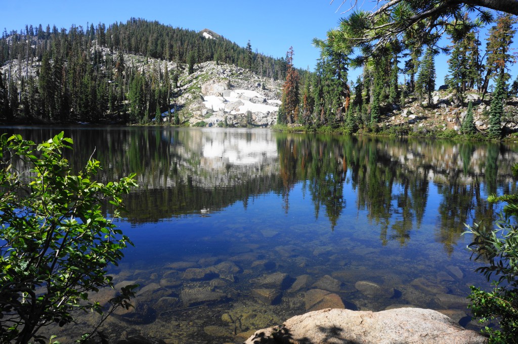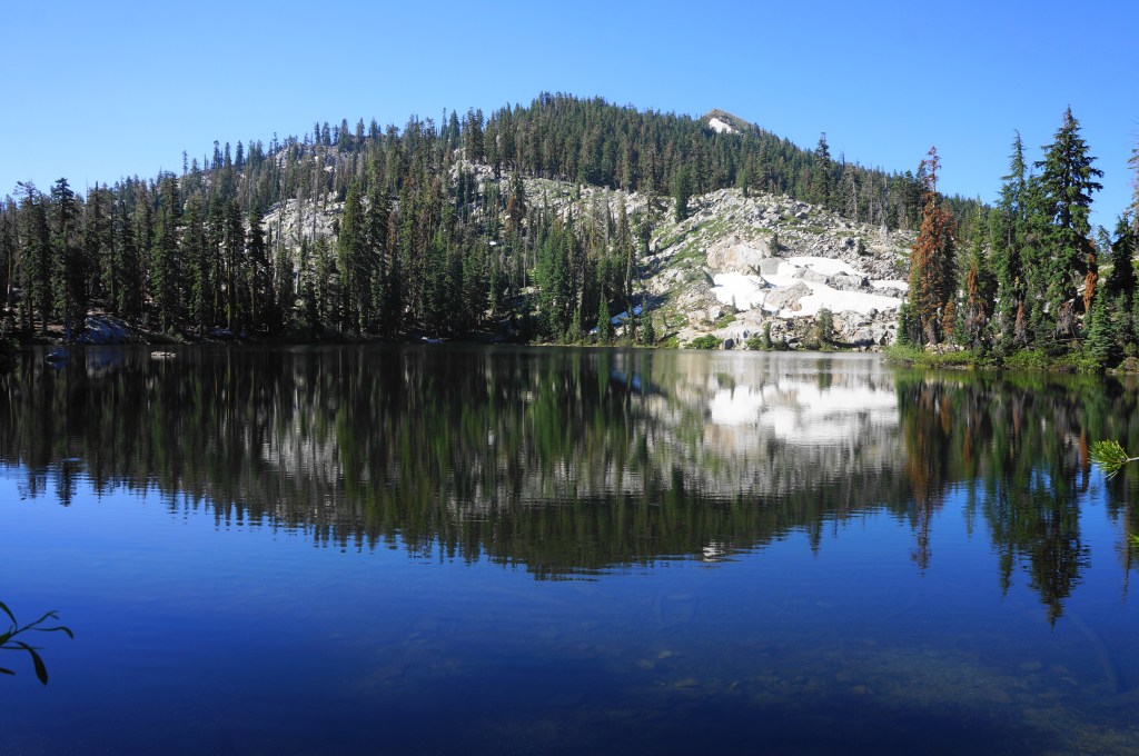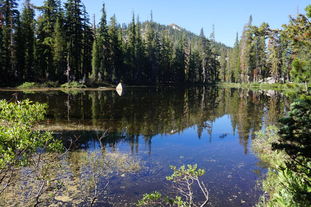 Continue on the shady trail for about 250 yards, coming within sight of the final and largest of the Five Lakes. This is also likely the deepest and most impressive: while mostly lined with trees, there is a small section of granitic scree, with the tip of a roughly 8,500-foot peak beyond.