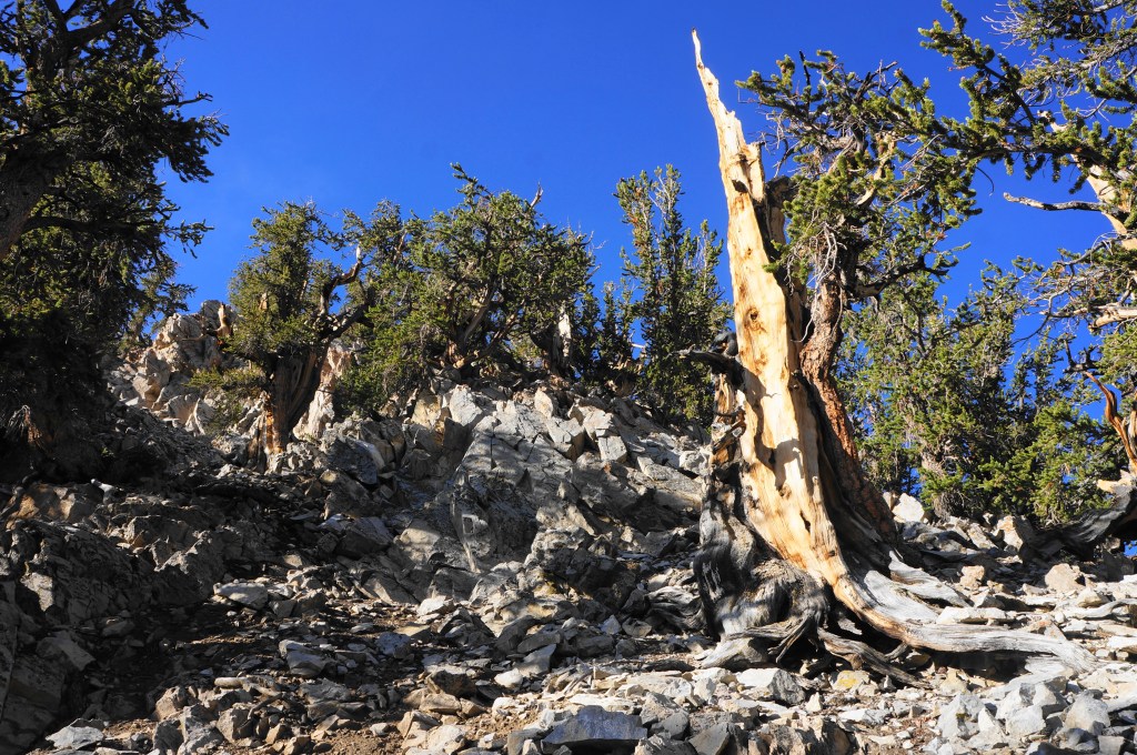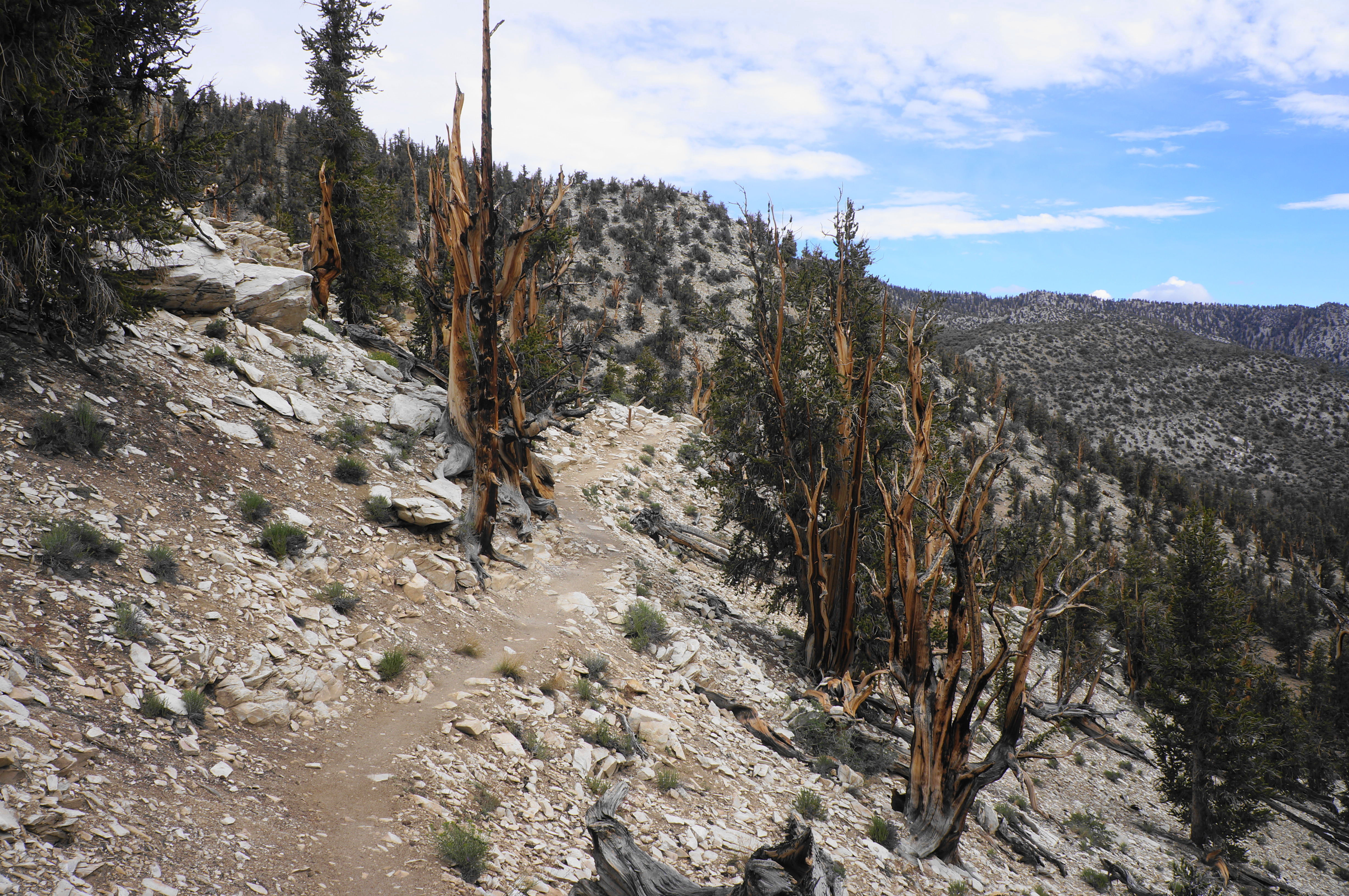 Bear right first, leading into a rather stout uphill section that skirts a north-facing hillside—this cues the bristlecones, which thrive on north slopes because they retain snow for longer, allowing the pines to absorb additional moisture. The gnarly trunks rarely rise more than 20-30 feet, but the conditions have turned these ancient trees into hearty warriors. Even the specimens that have lost their needles are likely still alive, growing ever slowly amidst the sandstone and dolomitic soil. There is no underbrush to compete with.