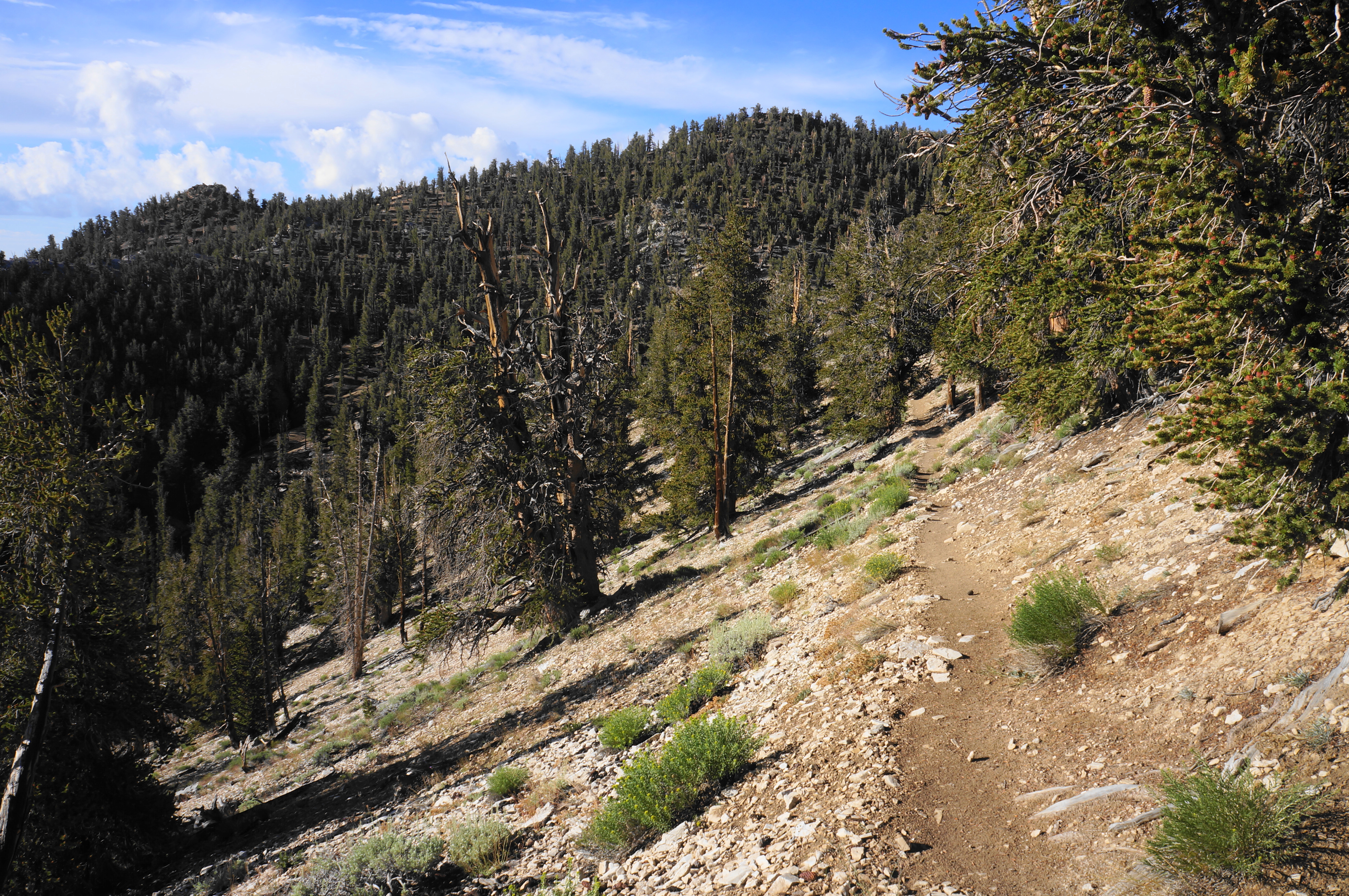 Now heading steadily northward, the bristlecones continue to dot the hillside around seemingly every bend, and there are open views down the South Fork drainage. It is not until around 2.9 miles that the uphill returns in earnest. Climb up and around a left-hand bend, heading westward along another north-facing slope. Naturally, the bristlecones are found here in numbers as well.
