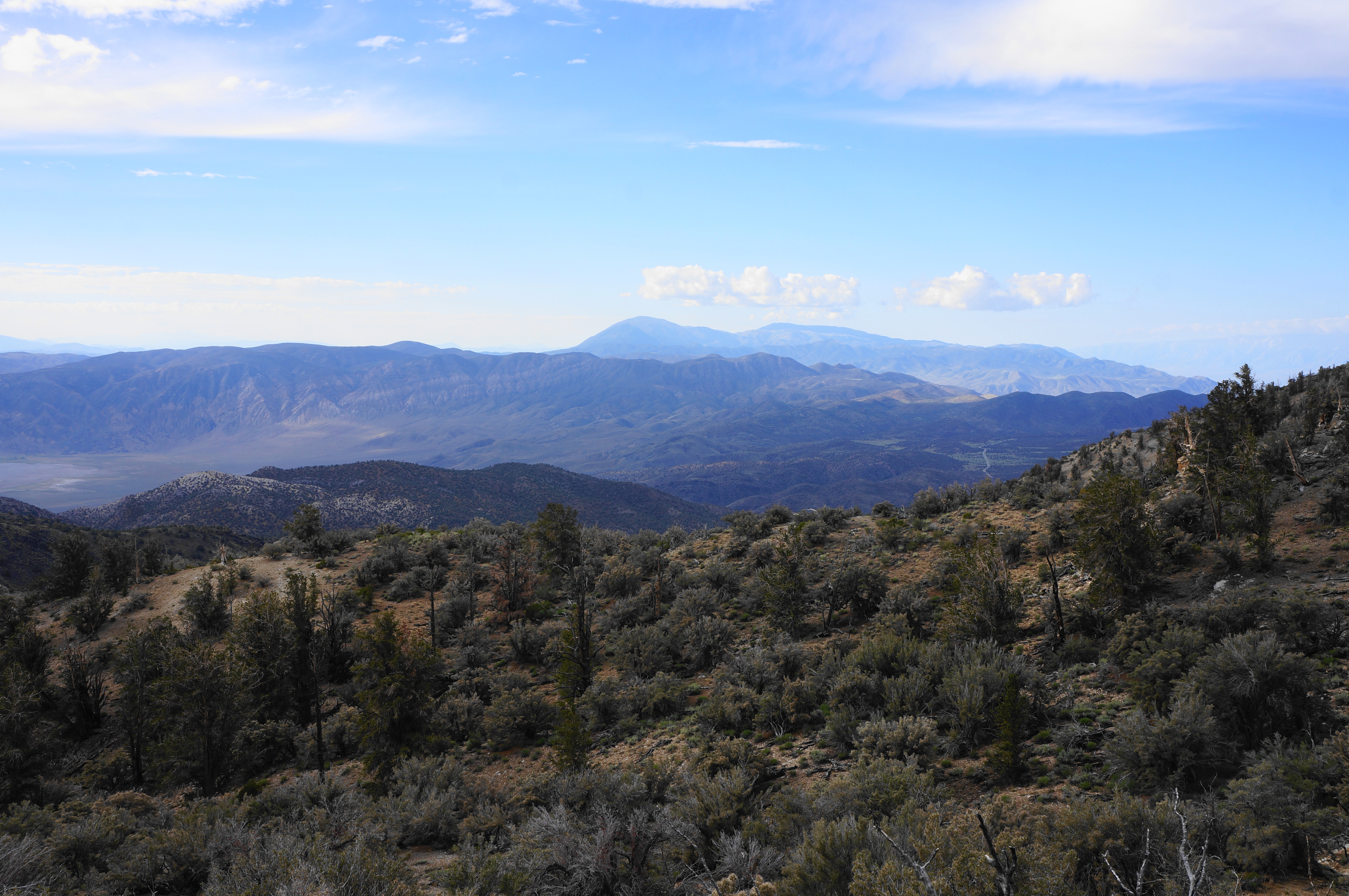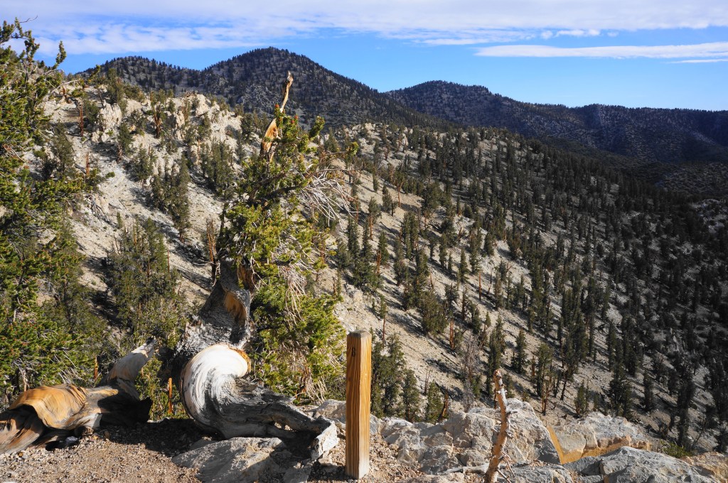 Two switchbacks lead into a milder descent across a brushy shelf, with views to a bald ridge to the east. The sagebrush begins to thin as one heads through Mountain Mahogany Grove, and bristlecones start to reappear, including one oft-photographed spiral atop a sandstone crag.