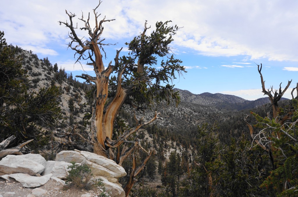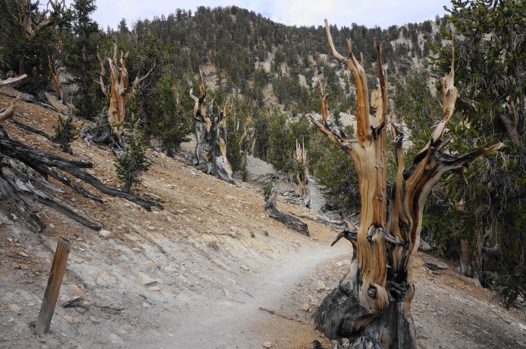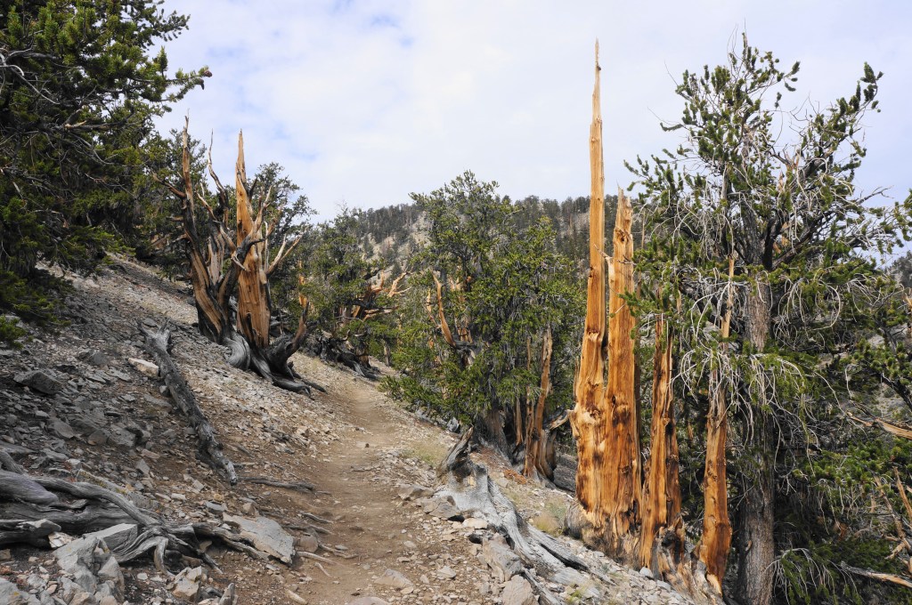 The stunning trees continue to mesmerize as the trail ascends the opposite slope, skirting the cream-colored cliffs. It is in this grove that the aforementioned Dr. Schulman, in 1957, began discovering the oldest trees ever measured, including the famed Methuselah Tree (unmarked for its protection). Schulman had peculiar names for the various tree shapes, including the imaginative “Eagle’s aerie,” “massive slab,” and “pickaback.”