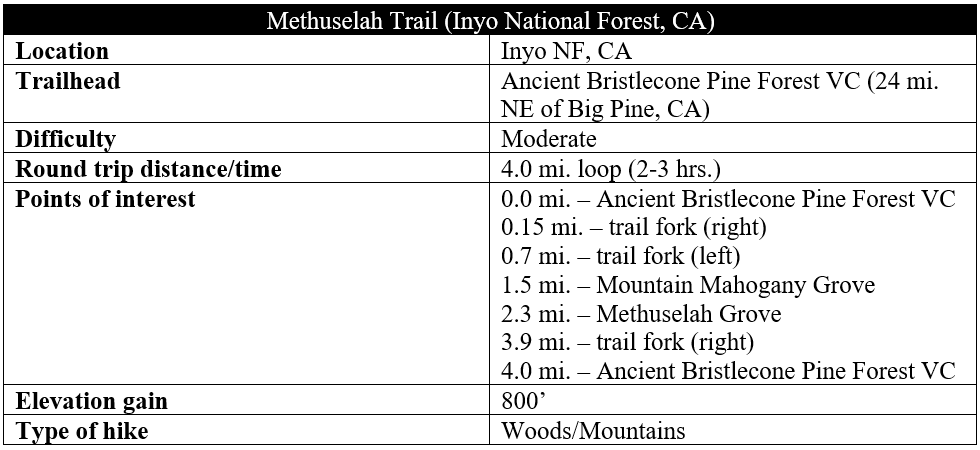 The Methuselah Trail is situated in Inyo National Forest’s White Mountain District. There is really only one way up to Schulman Grove and the Ancient Bristlecone Pine Forest, and this is via White Mountain Road, a 10-mile, winding track from California State Route 168 that rises to more than 10,000 feet in elevation. Considerably drier than the neighboring Sierras, the White Mountains have relatively sparse vegetation, especially on the high crest. But as one turns right into the parking area at Schulman Grove, the trees return in force, with the friendlier eastern slope boasting both bristlecones and limber pines, the only two conifers that can handle the harsh weather and alkaline dolomite soil of the area.