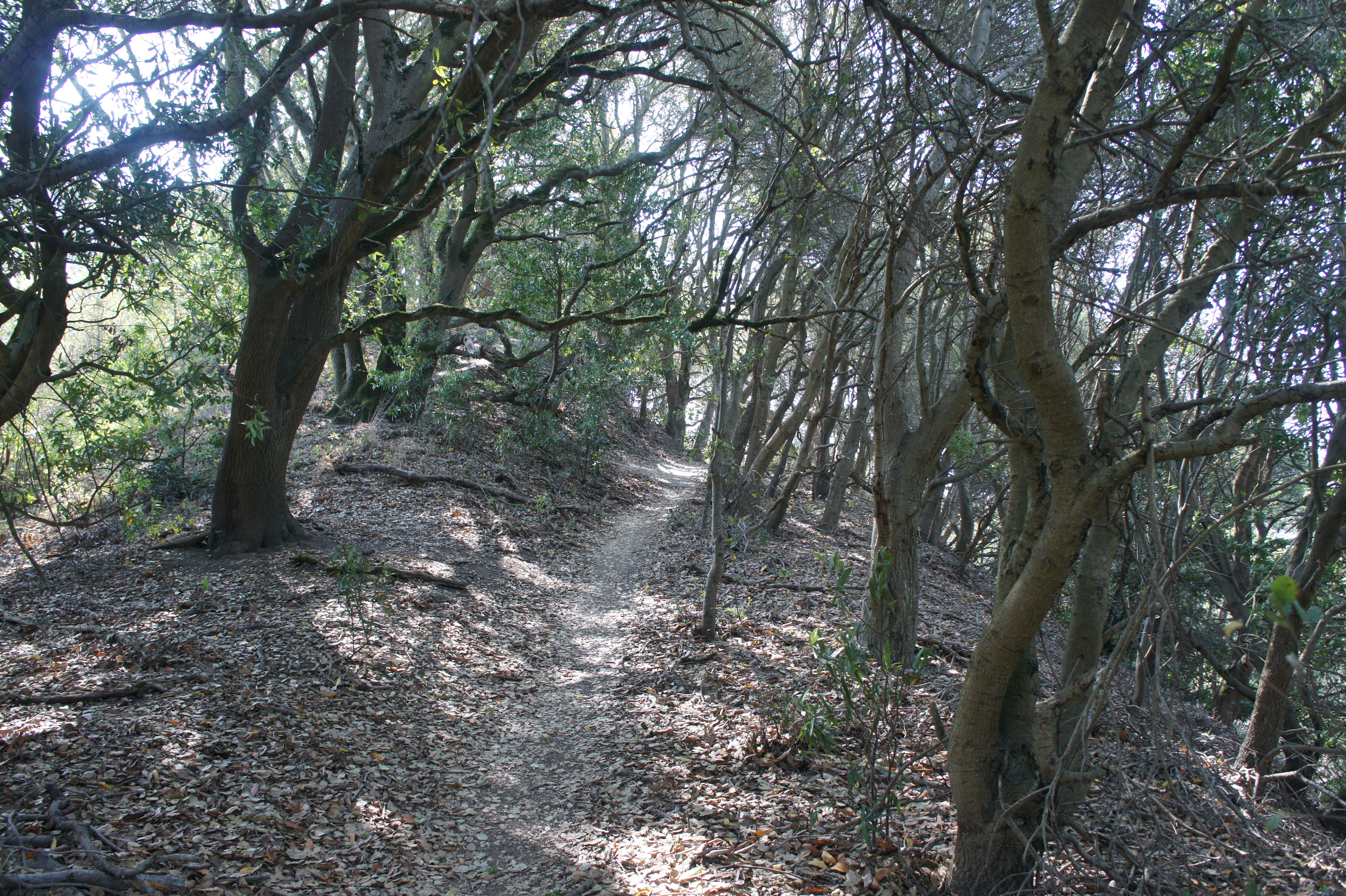 Tilden Nature Area, often packed with school groups and visitors to Little Farm, is not usually the place to escape crowds. But the Packrat Trail Loop provides relative solitude as it slithers through dense oak/bay woodlands along the western slopes above Wildcat Creek. Start from the parking area, heading west first on the Lower Packrat Trail, a dirt track that skirts the banks of Wildcat Creek and passes under moss-laden trees for 1/3 mile. At the first junction, bear left on the Upper Packrat Trail, which climbs to a higher shelf and doubles back toward the parking lot. Enjoy modest views of the willow-choked Wildcat Creek area, cross a wooden bridge, and bear left again at the next fork, following the Memory Trail downhill to return to the parking area.