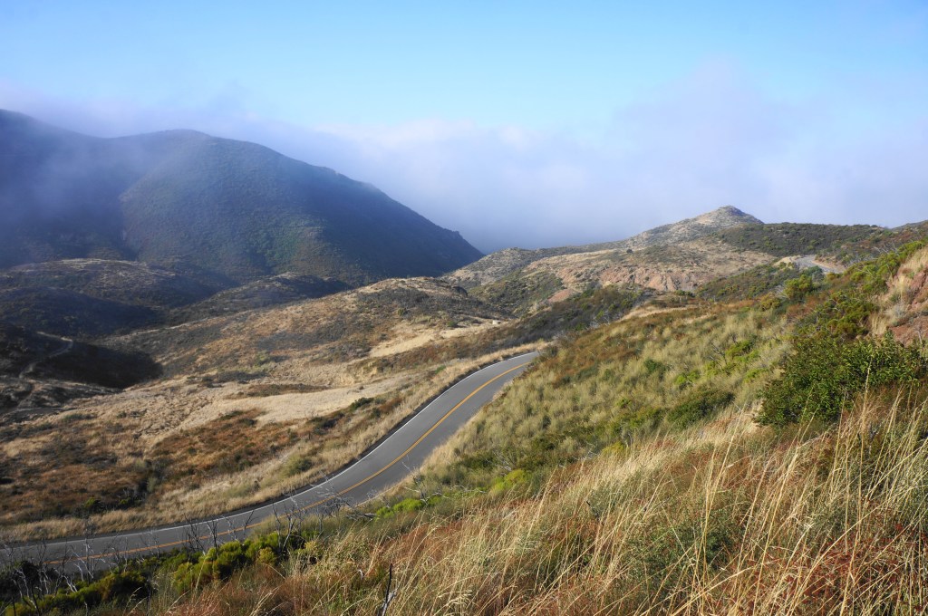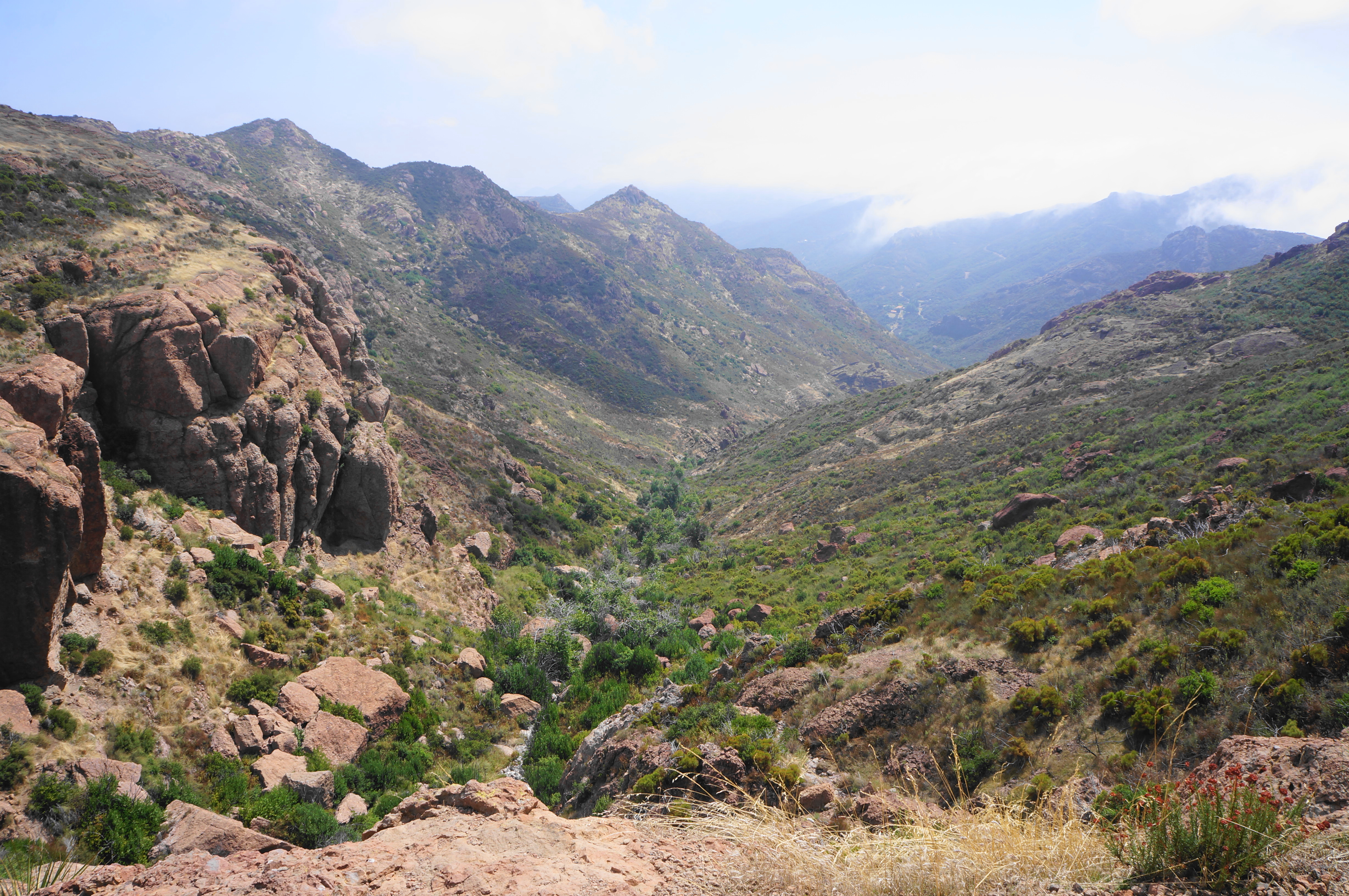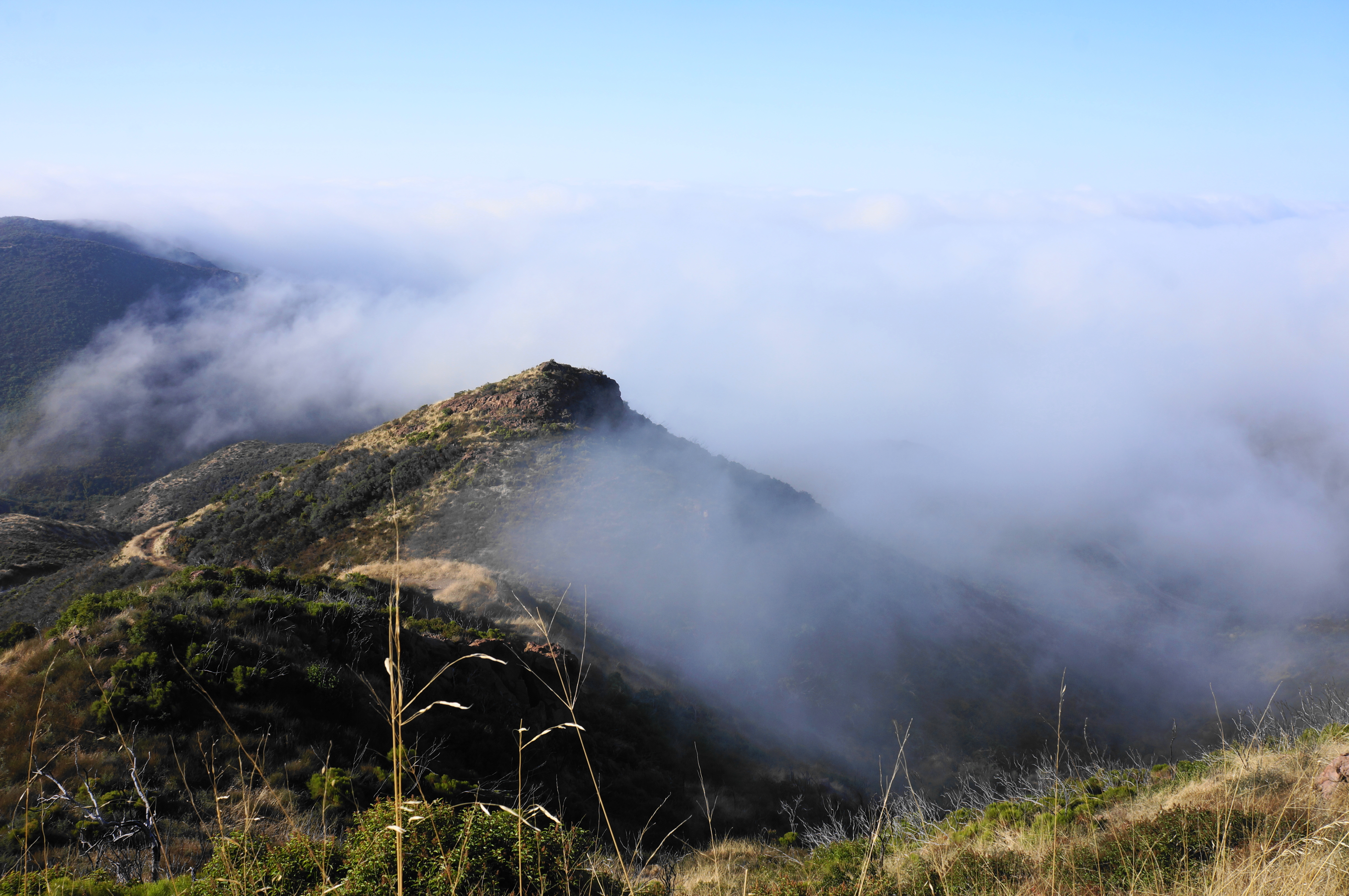 Come to another intersection and bear right, traversing grassy terrain until a point where the trail seems to disappear entirely. A closer look reveals that a fainter trail continues left, rising to a point where one can cut back right, skirting a ridge to ascend Tri Peaks. A window view north offers a look down across neighboring Point Mugu State Park to Potrero and Pleasant Valleys.