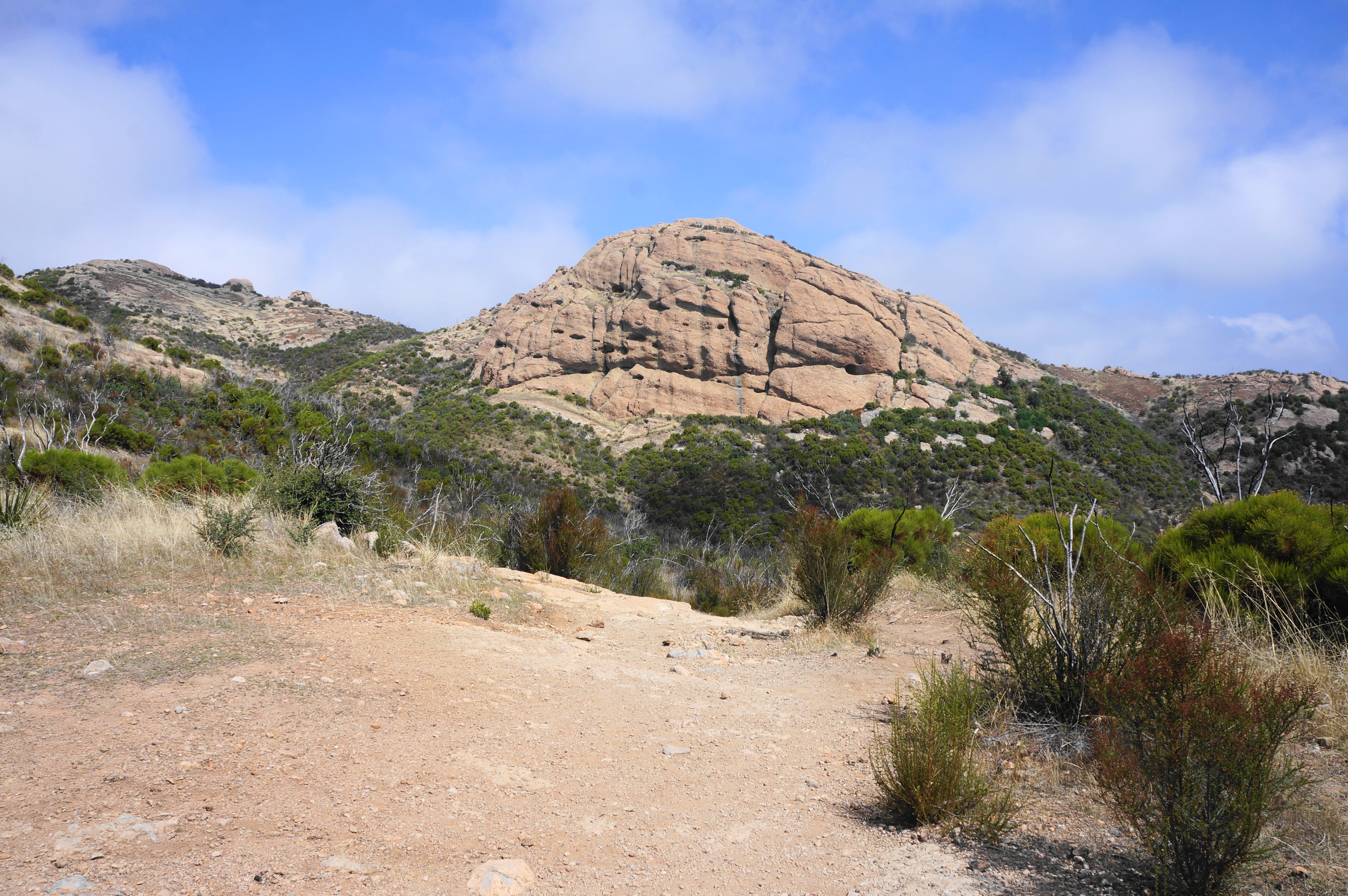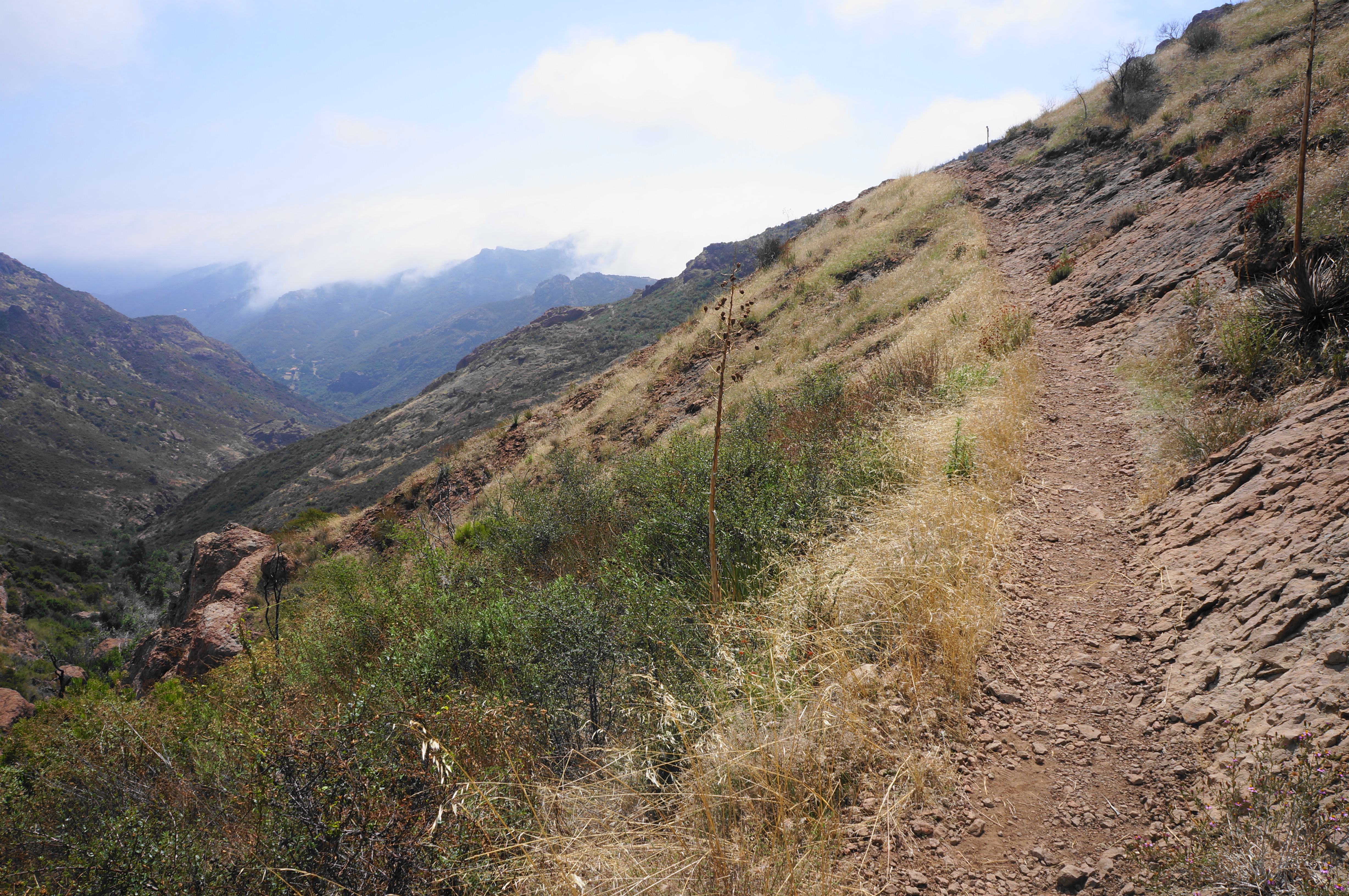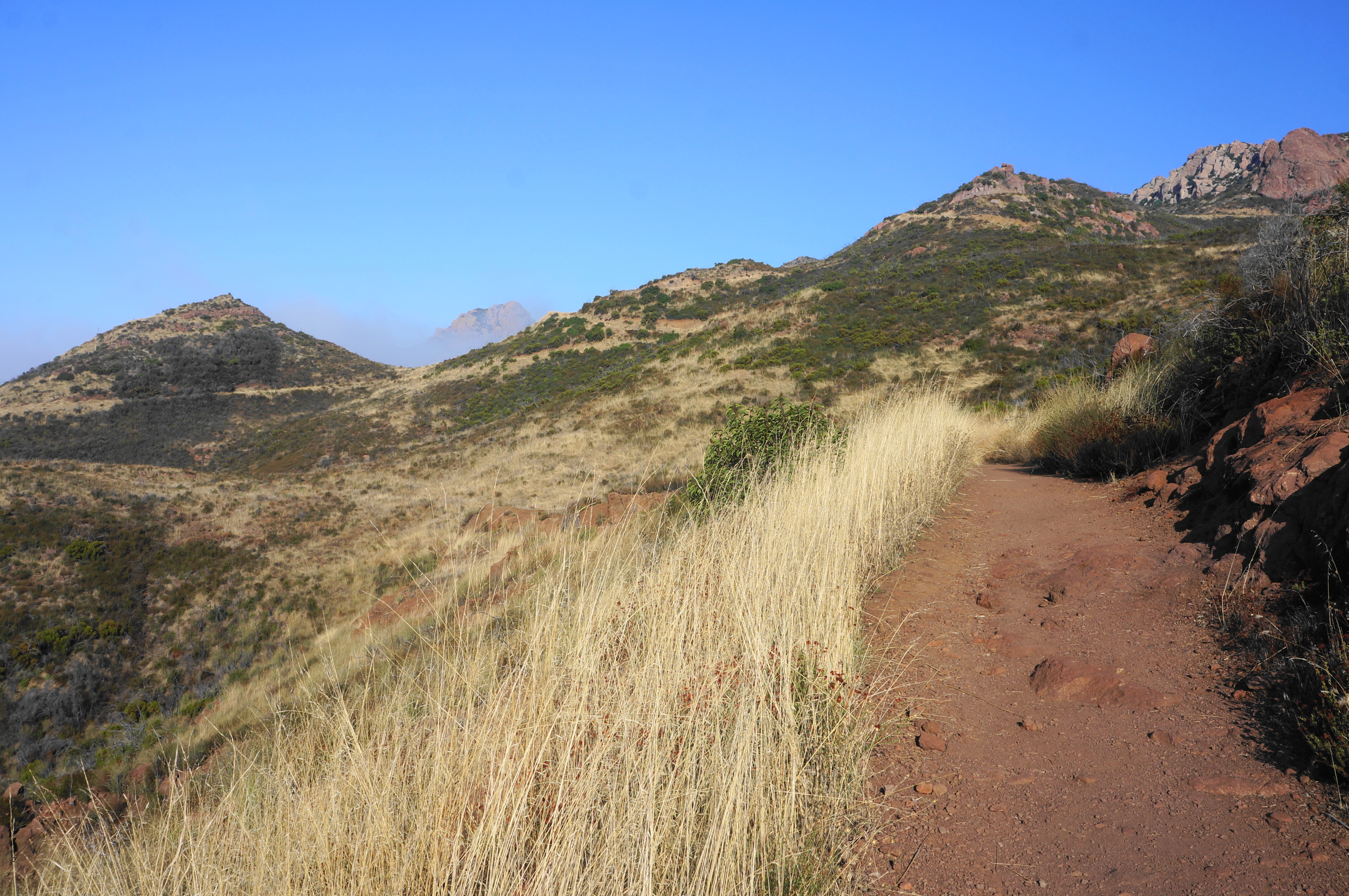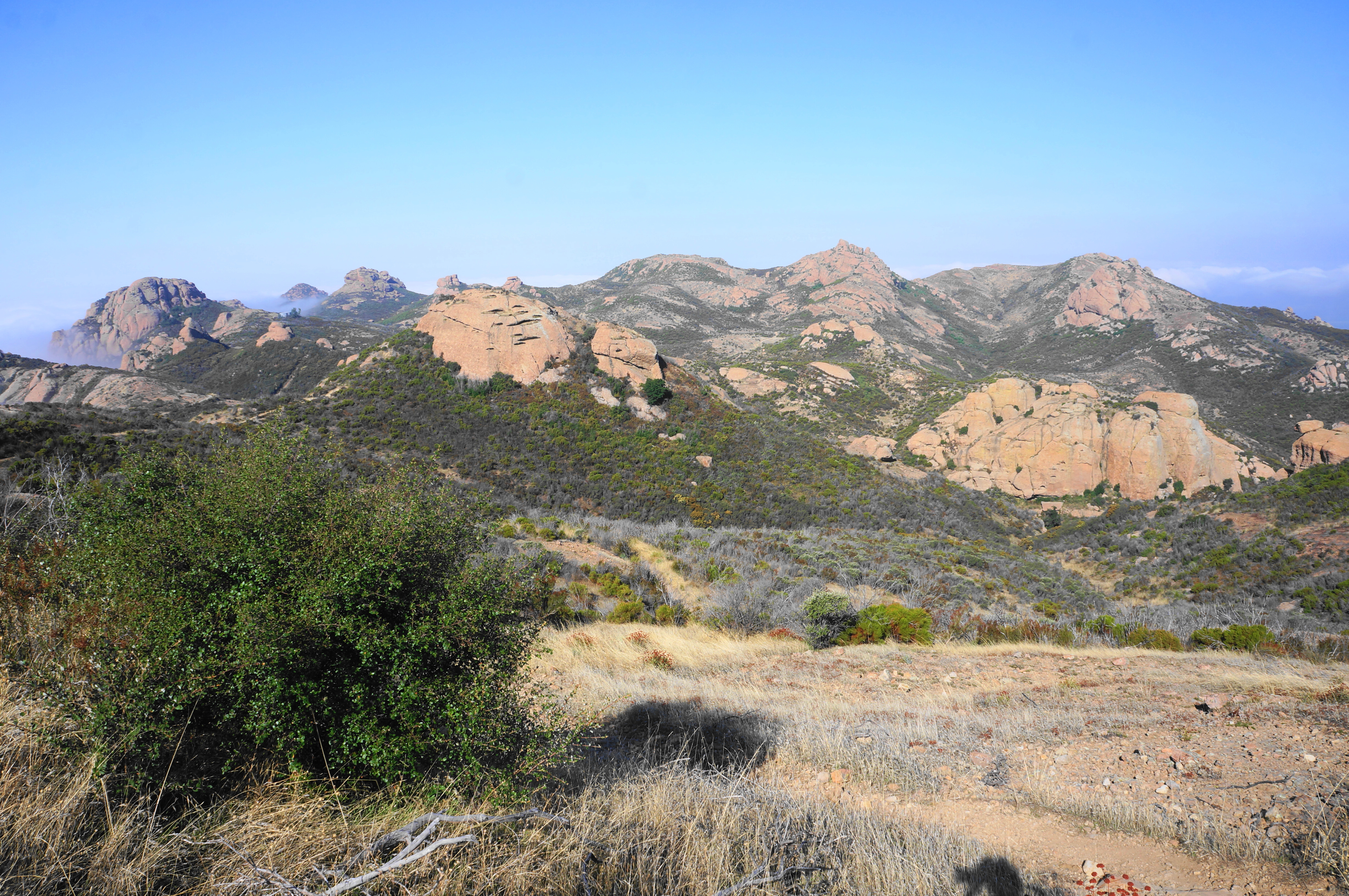 After rounding a left-hand bend and traversing an up-and-down section, the path comes to another saddle, this one set below Sandstone Peak. A sharp pair of bends pushes hikers to around 3,000 feet, with the incline easing a bit as the Backbone Trail traverses westward. Soon the multi-knobbed heights of Boney Mountain—itself a collection of peaks—can be seen to the west; among these is Tri Peaks.