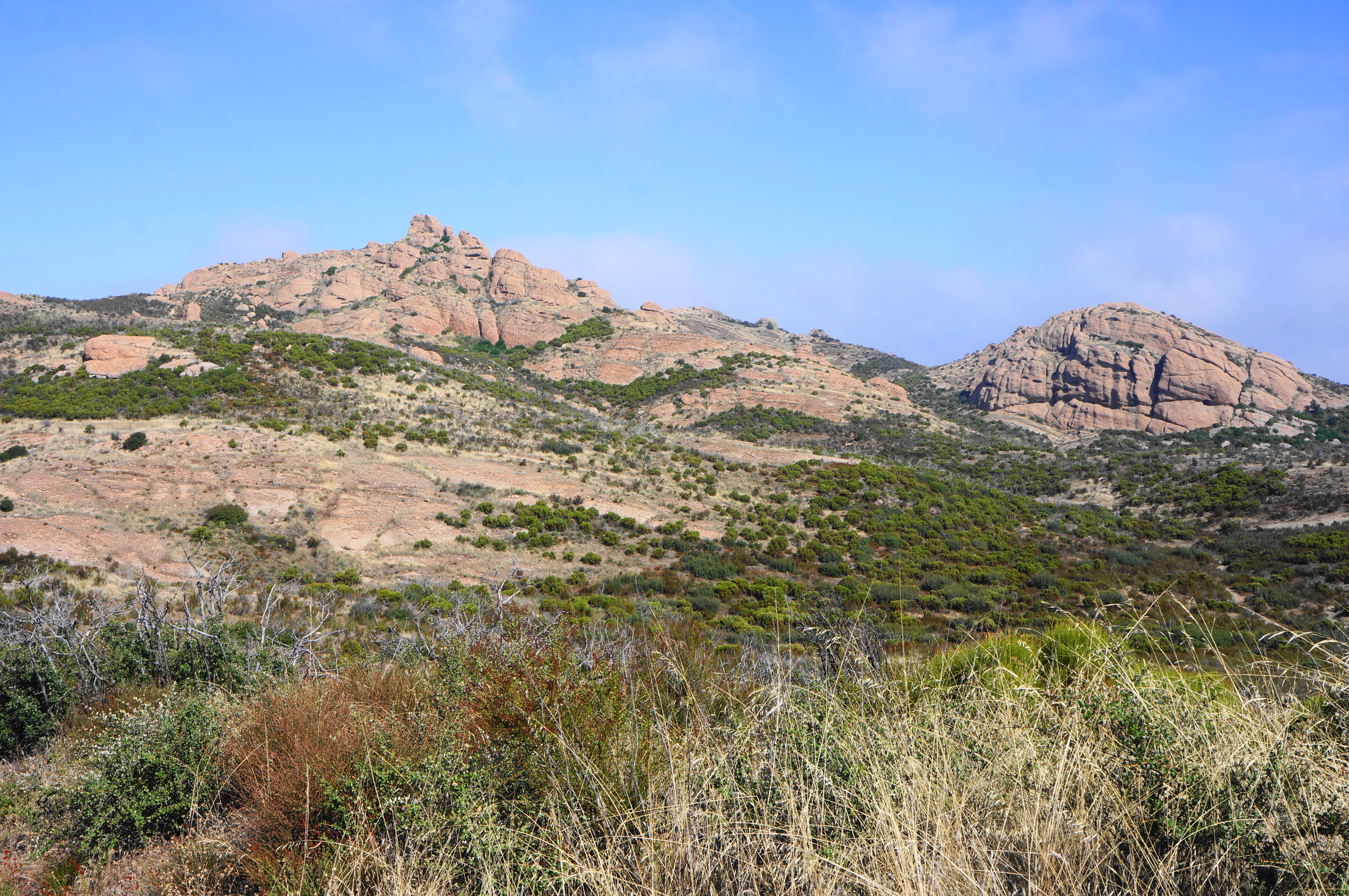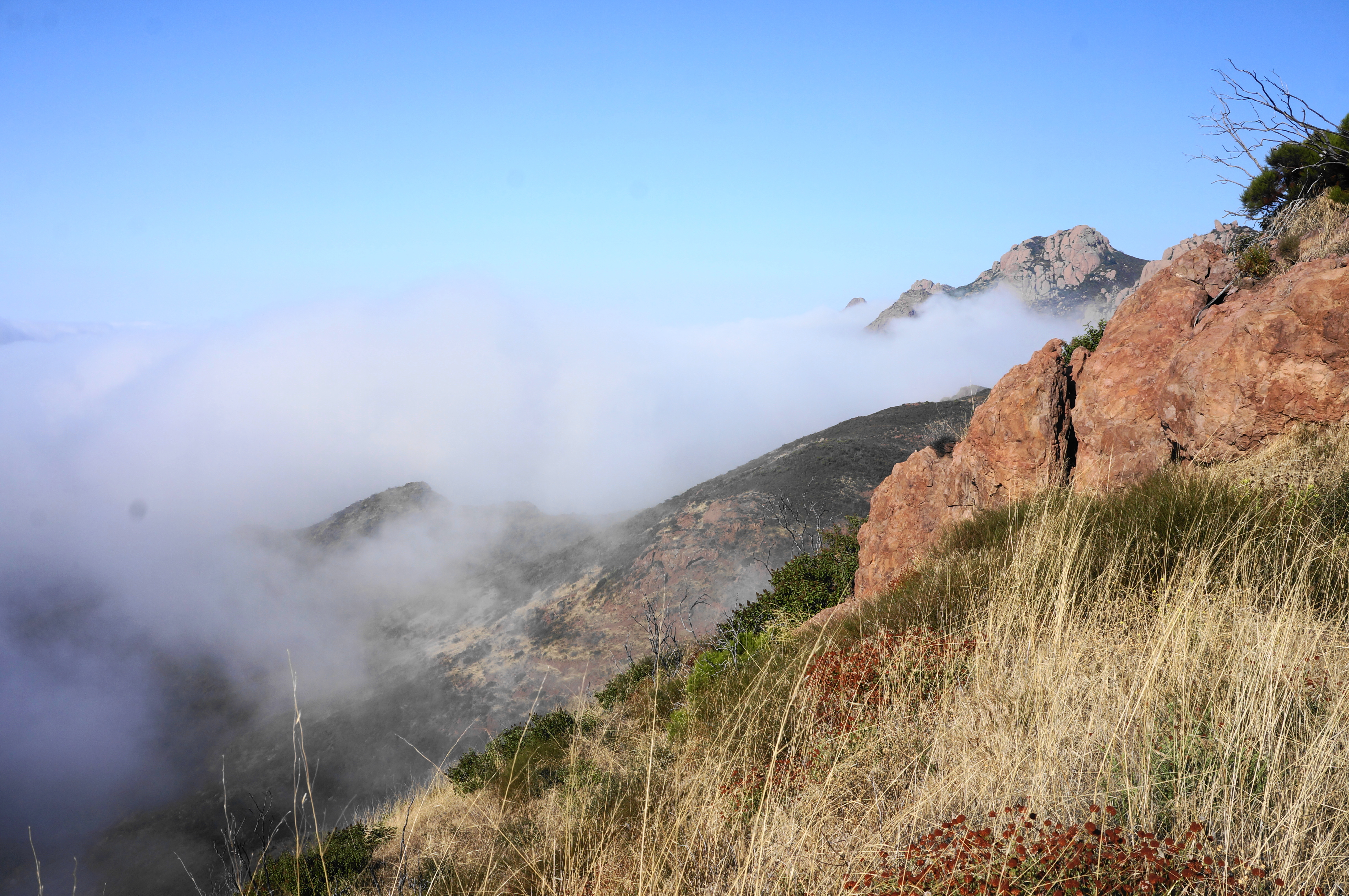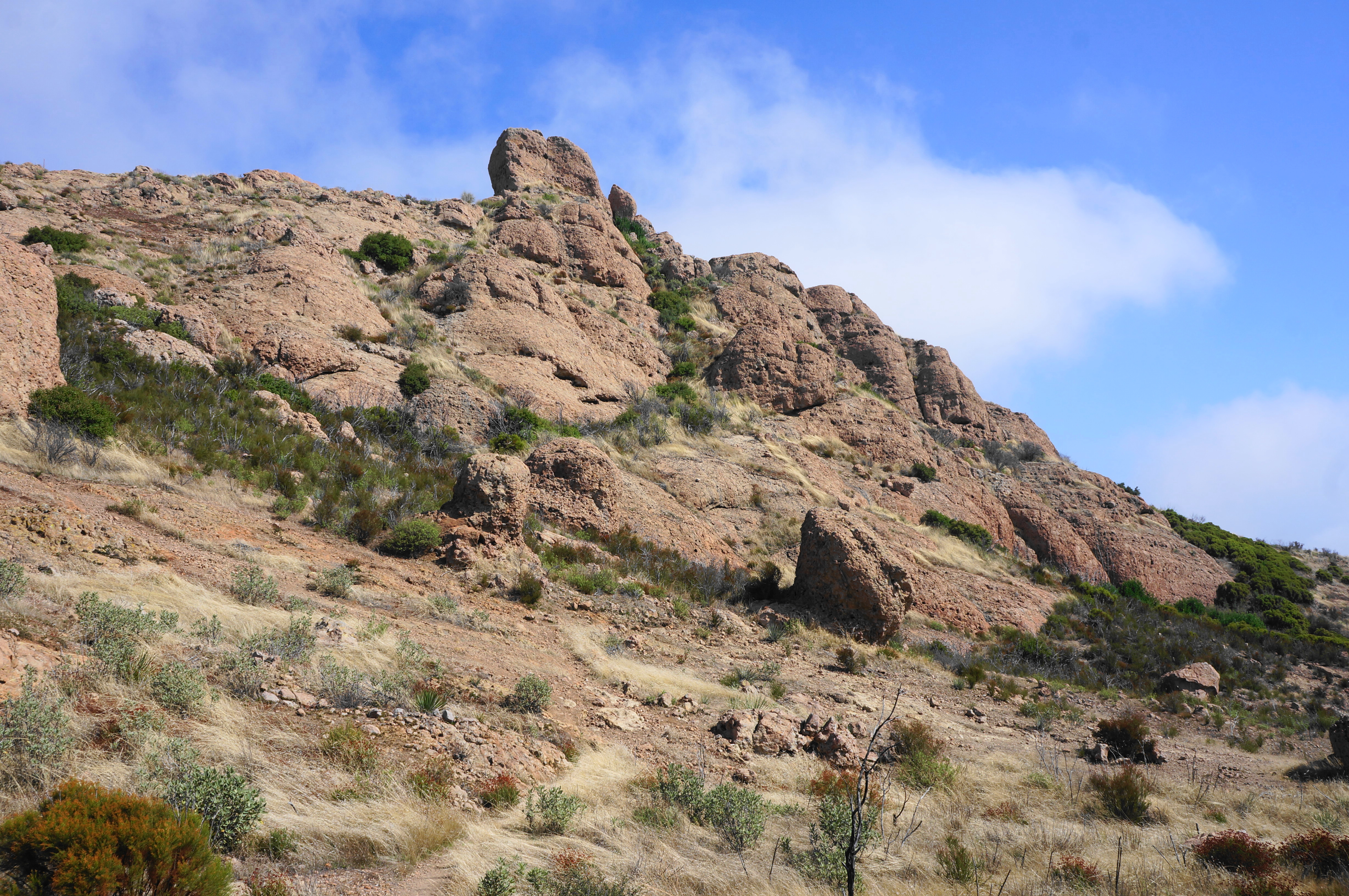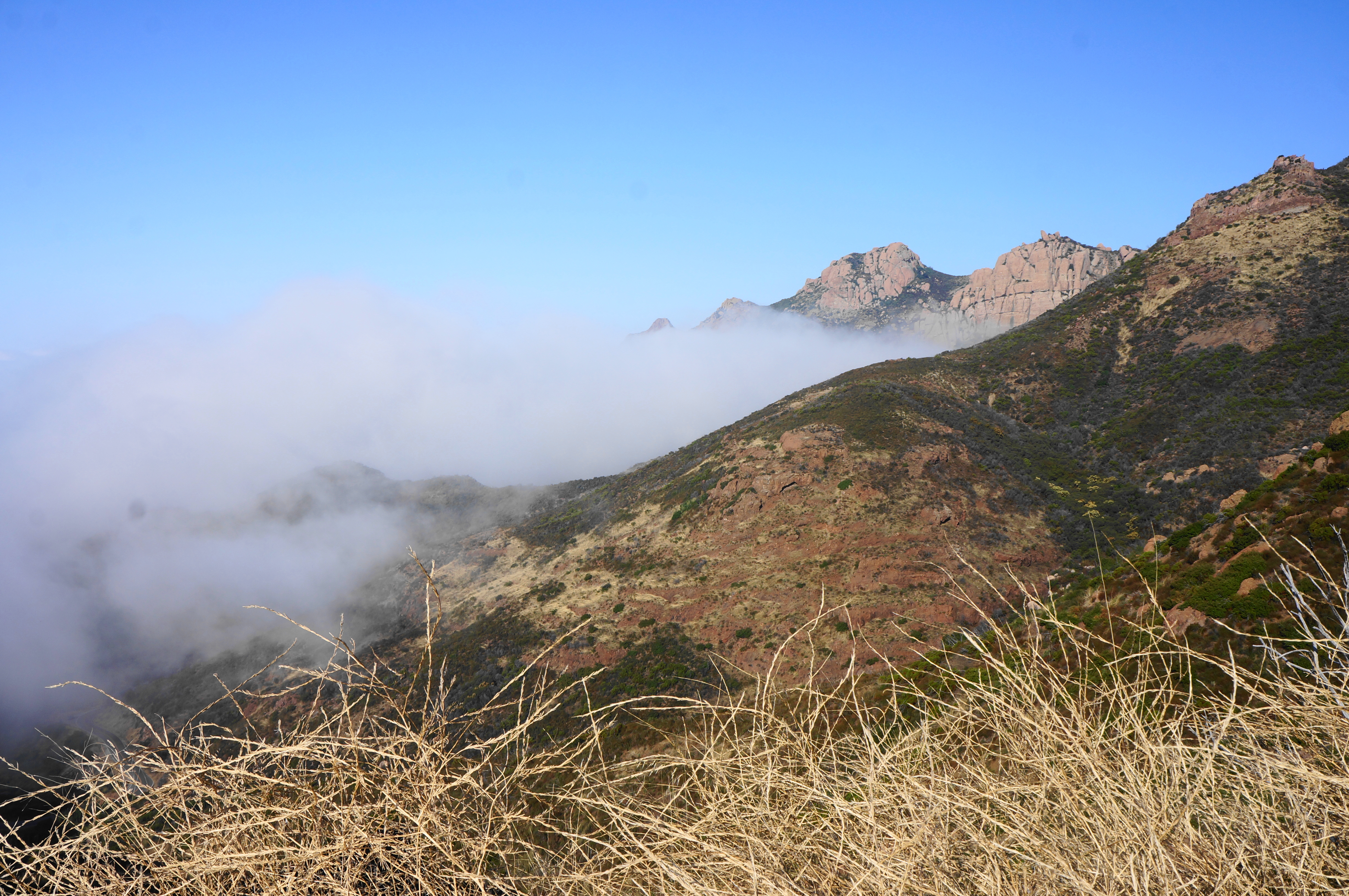 After rounding a left-hand bend and traversing an up-and-down section, the path comes to another saddle, this one set below Sandstone Peak. A sharp pair of bends pushes hikers to around 3,000 feet, with the incline easing a bit as the Backbone Trail traverses westward. Soon the multi-knobbed heights of Boney Mountain—itself a collection of peaks—can be seen to the west; among these is Tri Peaks.