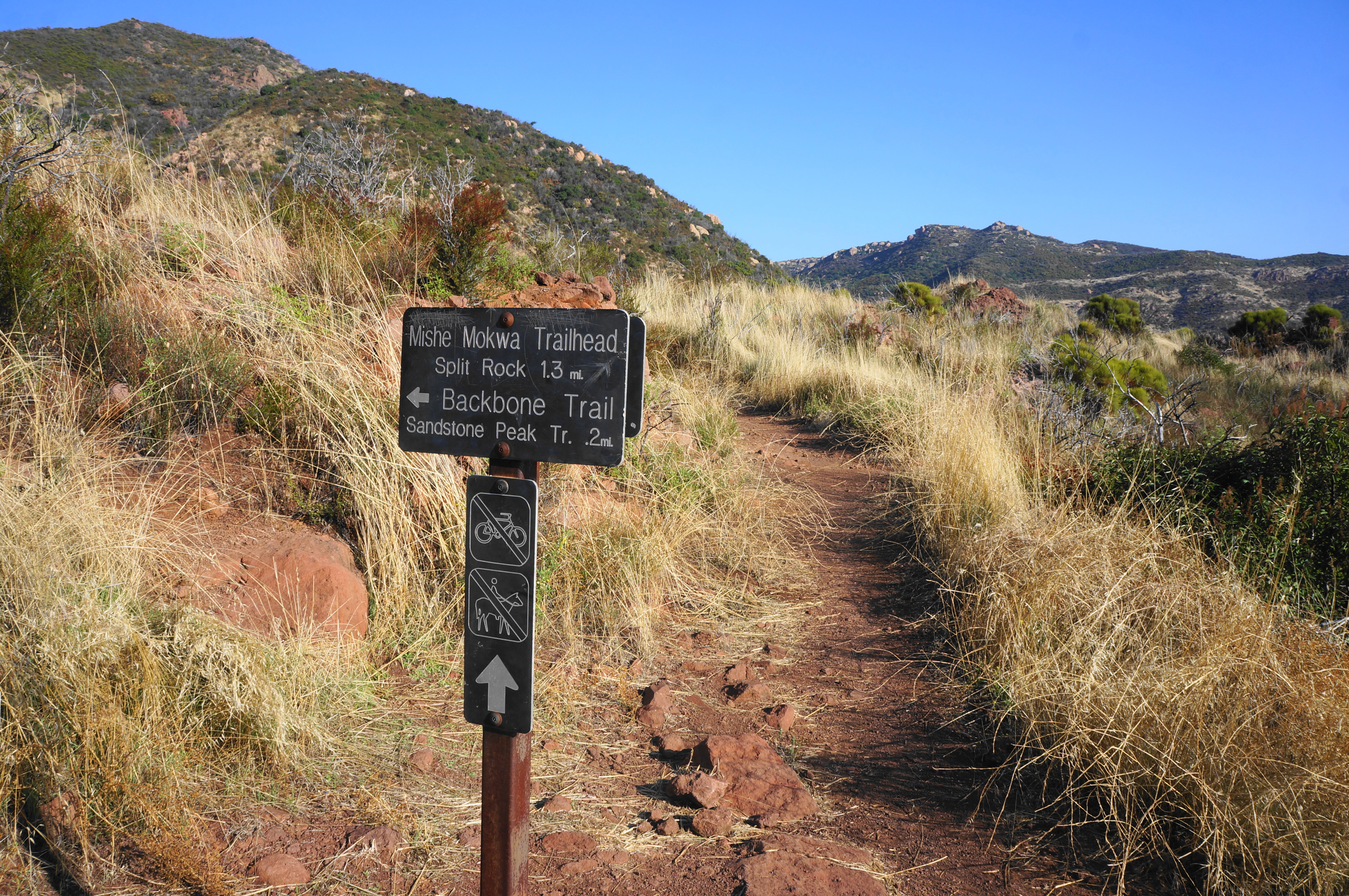 Climb amid the red volcanics until reaching a junction at 0.35 miles, where the Mishe Mokwa and Sandstone Peak routes diverge. Those seeking to cover the tougher terrain first should bear left, continuing to ascend the ridgeline toward the park high point. From here the Backbone Trail swings back to the south-facing slopes, with the road again visible—this time about 250 feet below. Traverse a small depression and come to a second junction, this one ½ mile from the trail’s start. This is where the route from Sandstone Peak Trailhead enters, merging with the onward Backbone Trail. Stay right.