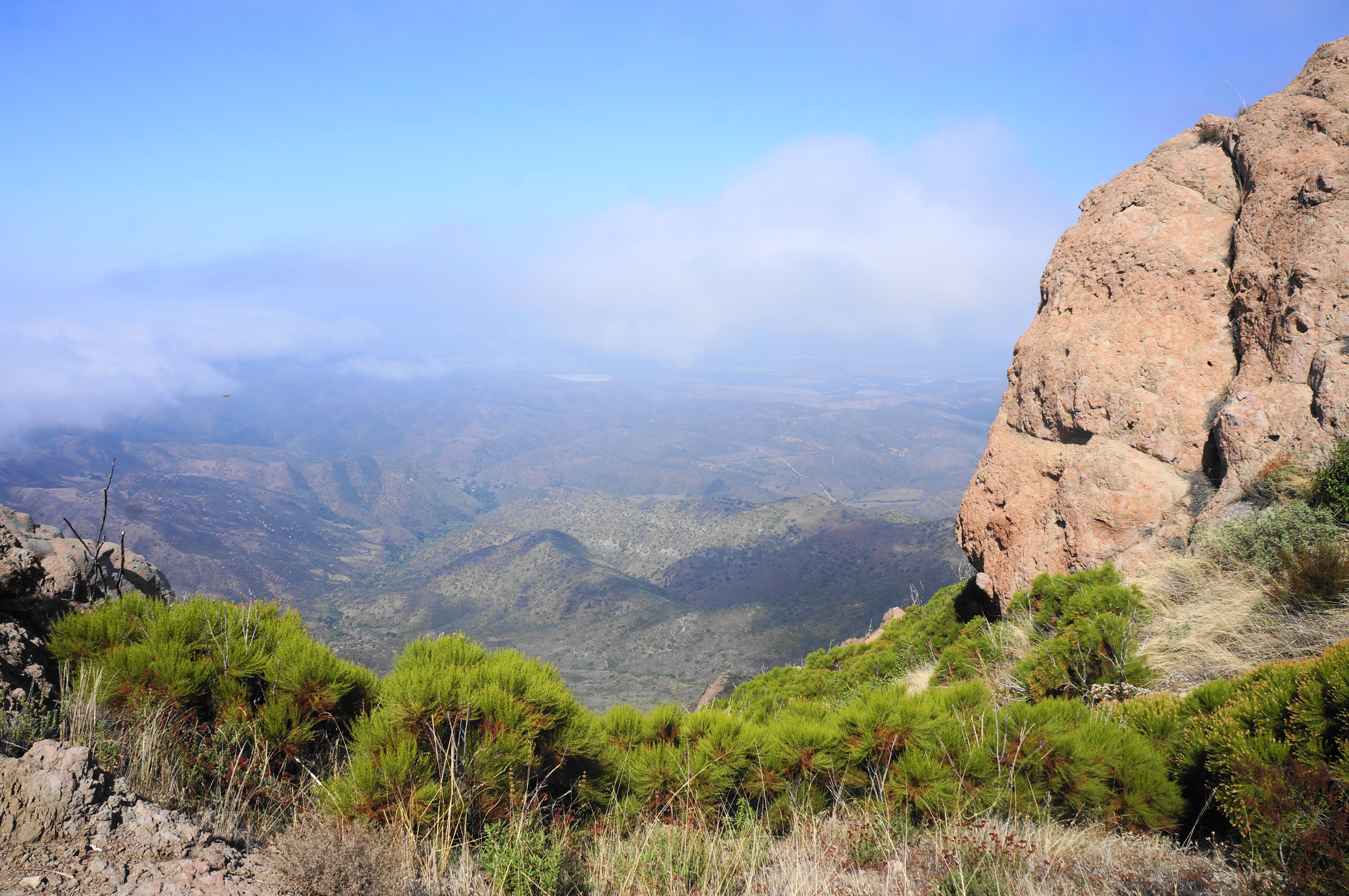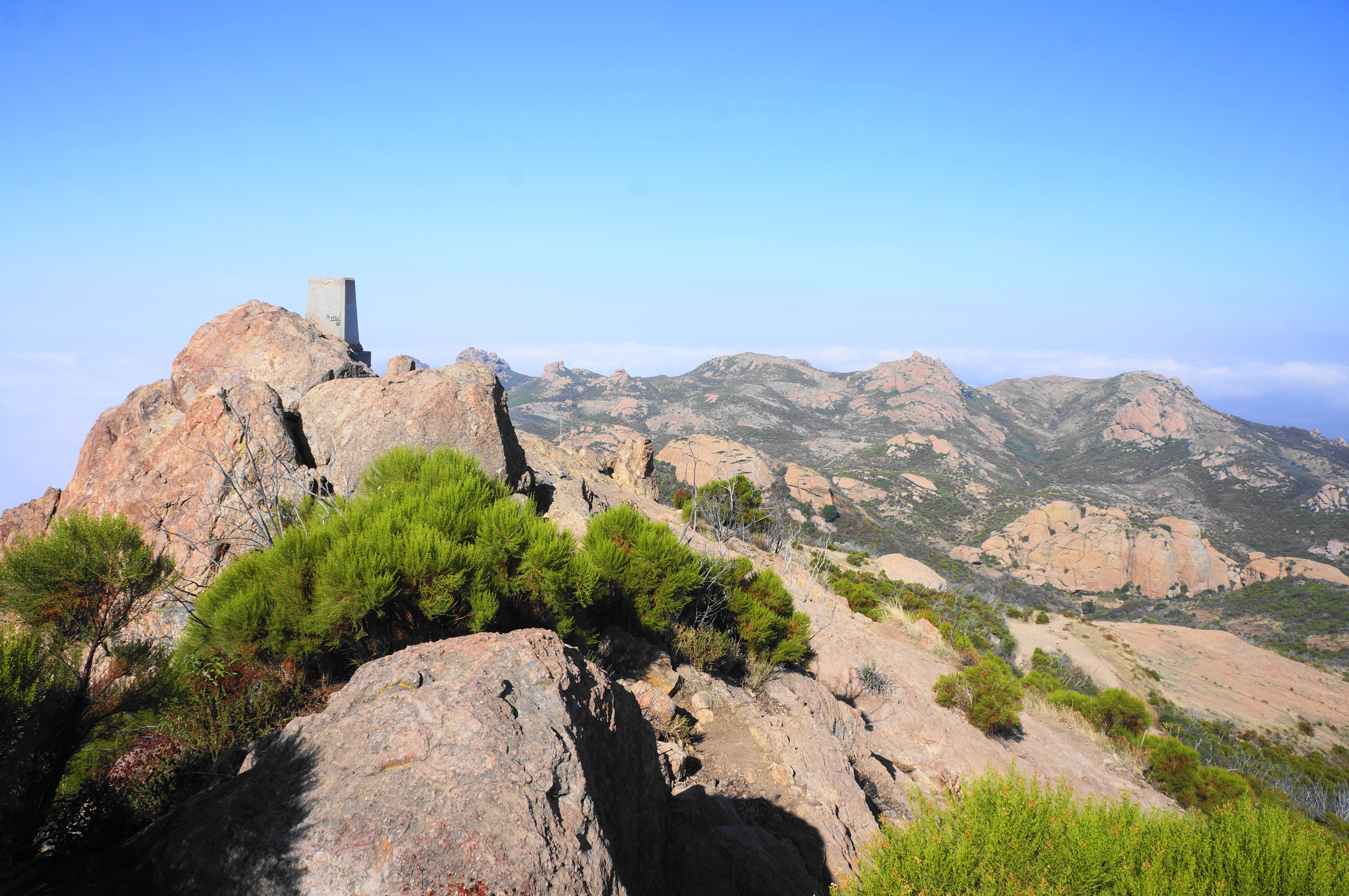 This is the highest point in the Santa Monica Mountains, affording a 360-degree panorama that, on a clear day, can stretch dozens of miles onto the horizon. The southward view is often fog-filled, blocking views of the ocean; visibility looking north is usually better, with views across Conejo Valley to the Las Posas Hills, Topatopa Mountains, and other components of the Transverse Ranges.