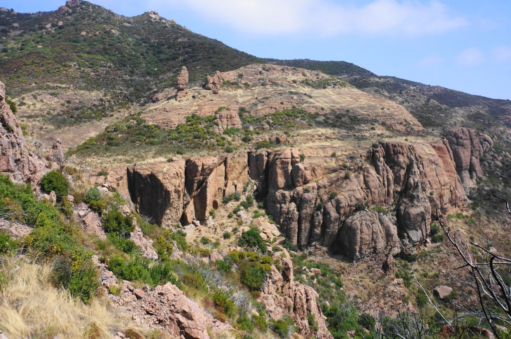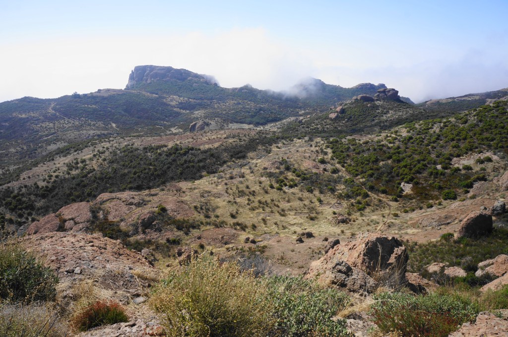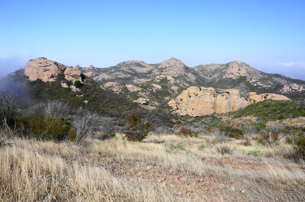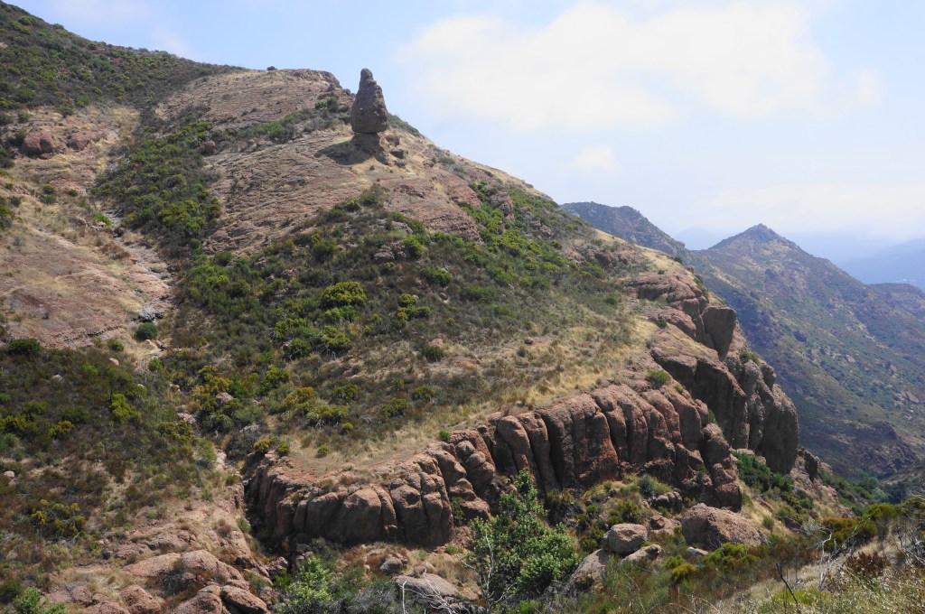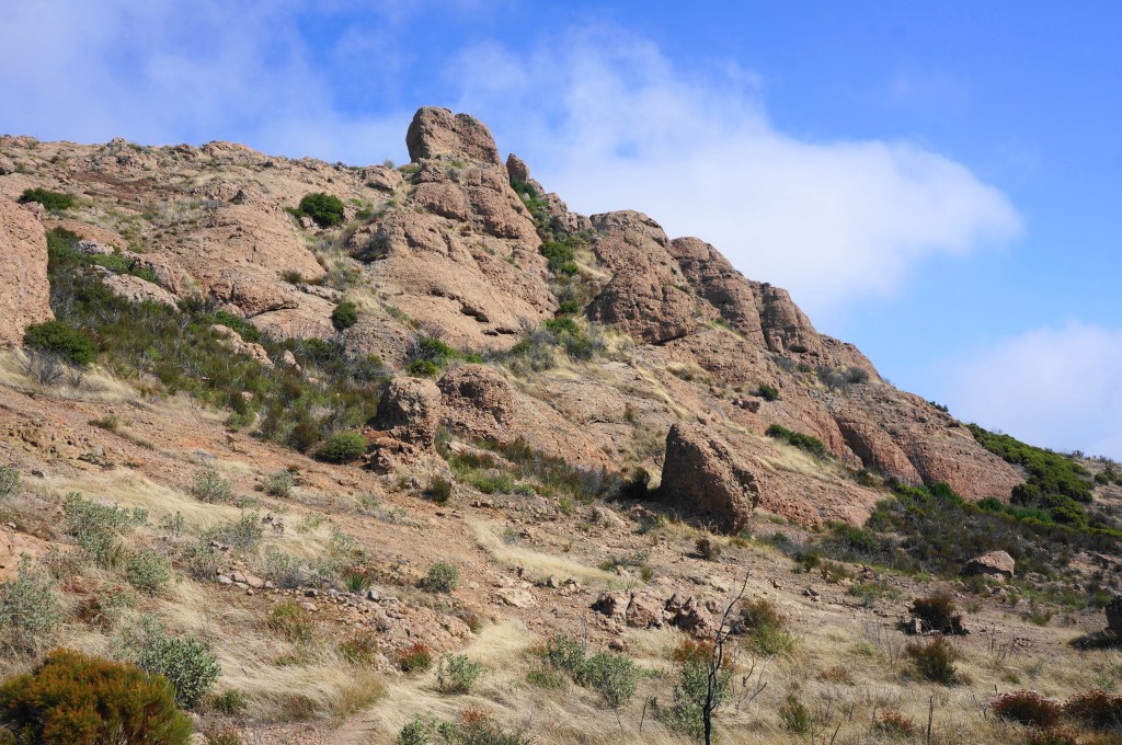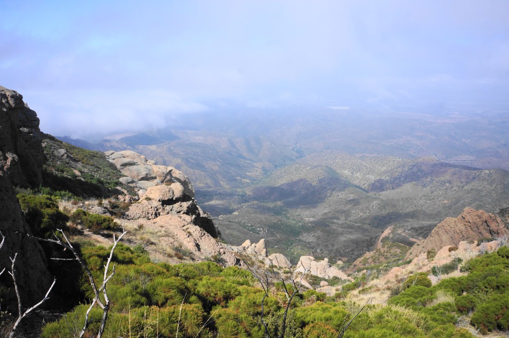 It is steps from here to one of the hike’s finer vistas, where the terrain drops to the south and east, with (weather-permitting) distant Pacific Ocean views. More of the divide west of Sandstone Peak is also visible, although the summit remains obscured from view.