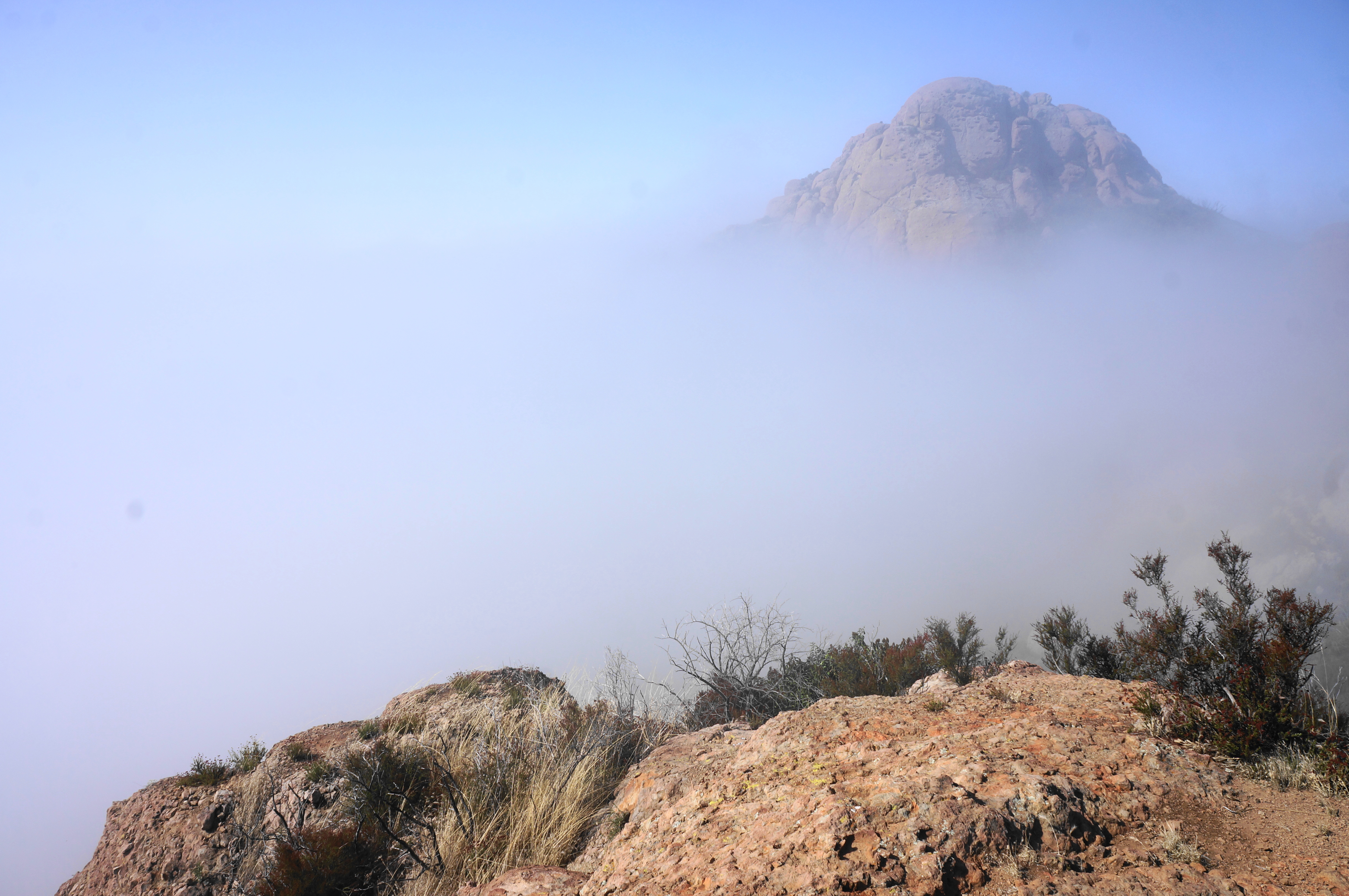 The route goes dim as it approaches the base of tall boulder outcrops, but this is in part because the summit does not appear to be accessible without some serious Class 4 climbing. Instead plan to settle for views from the base that are nearly as good, then return the way you came, tracing back to the broad wash and the junction with the Mishe Mokwa Trail.